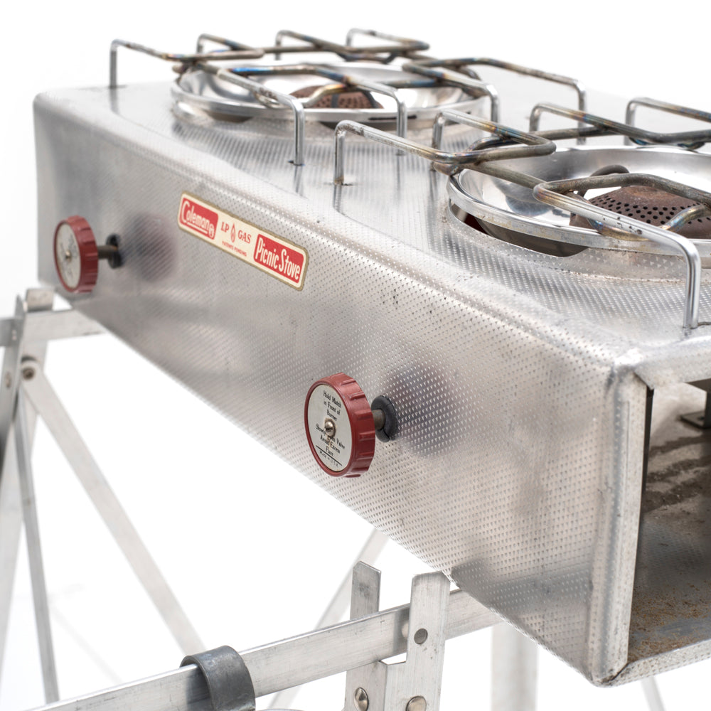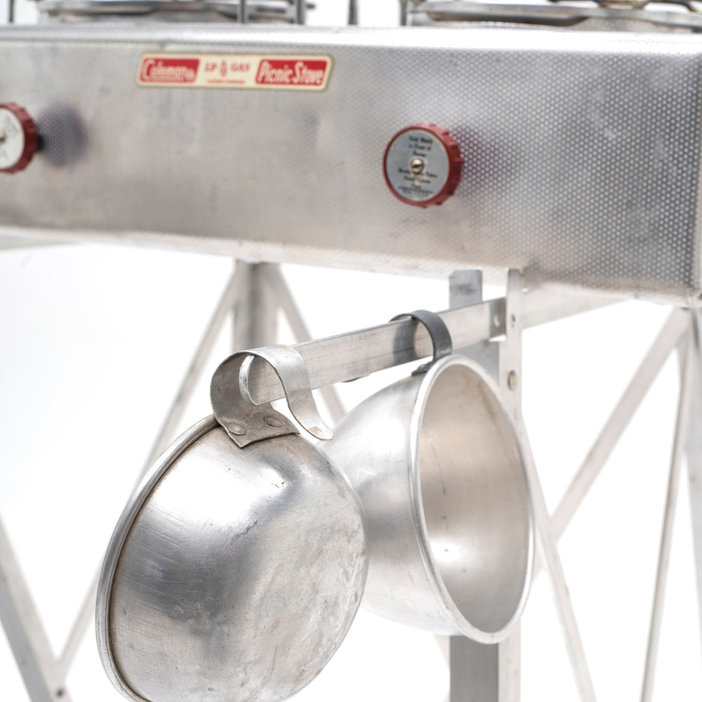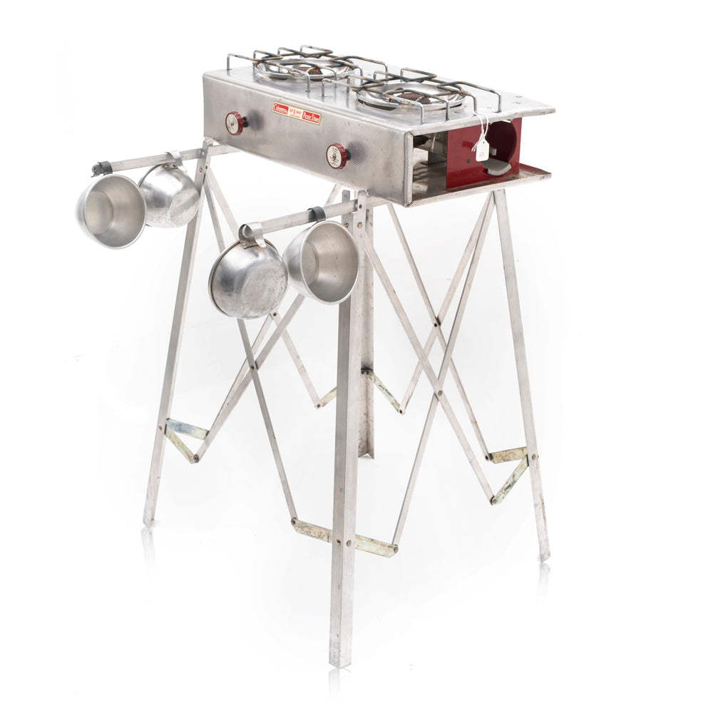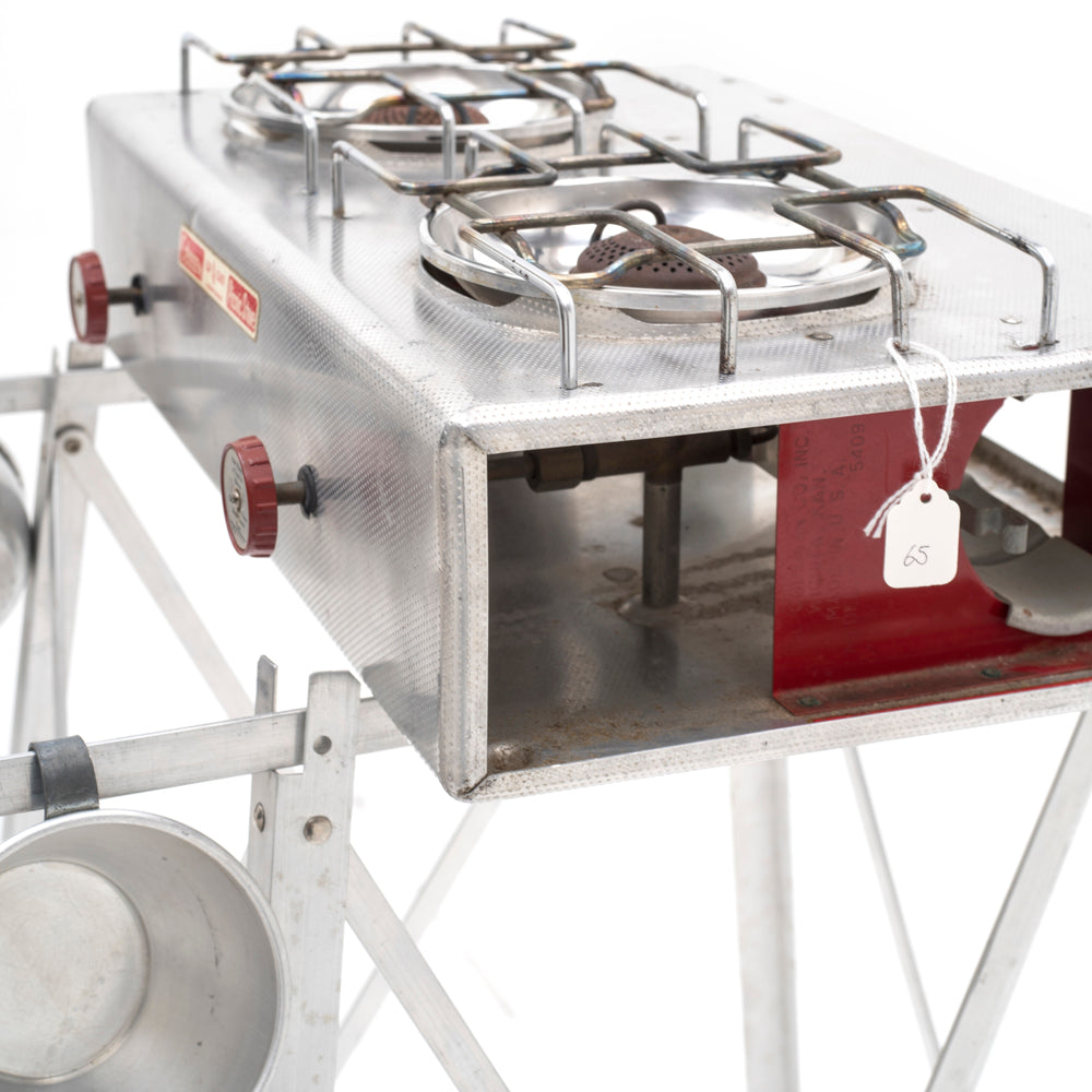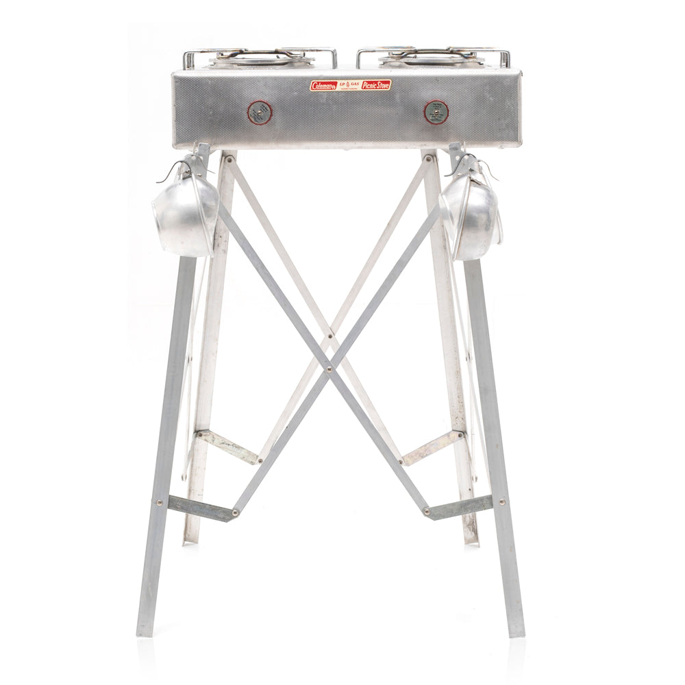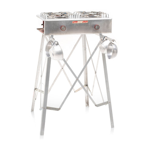 Details: Picnic or camping stove on stand with metal cups and bowls. Dimensions: 30" H x 18" W x 10" D