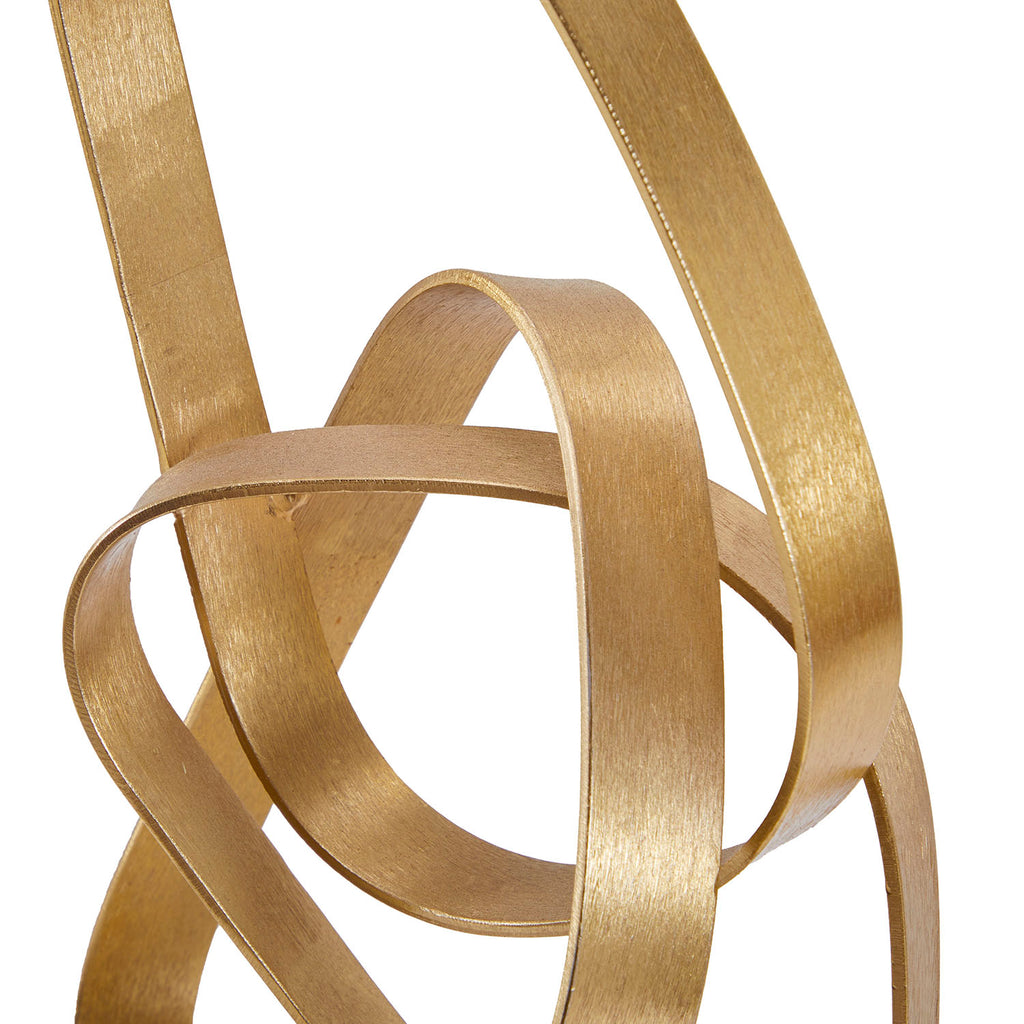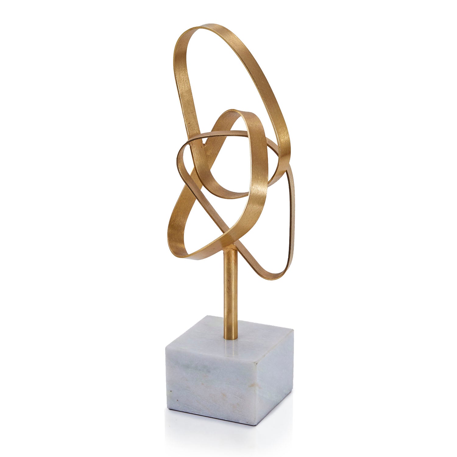 Details: Gold geometric bent metal sculpture on a white marble base Dimensions: 20" H x 7.5" W x 5" D Quantity: 1