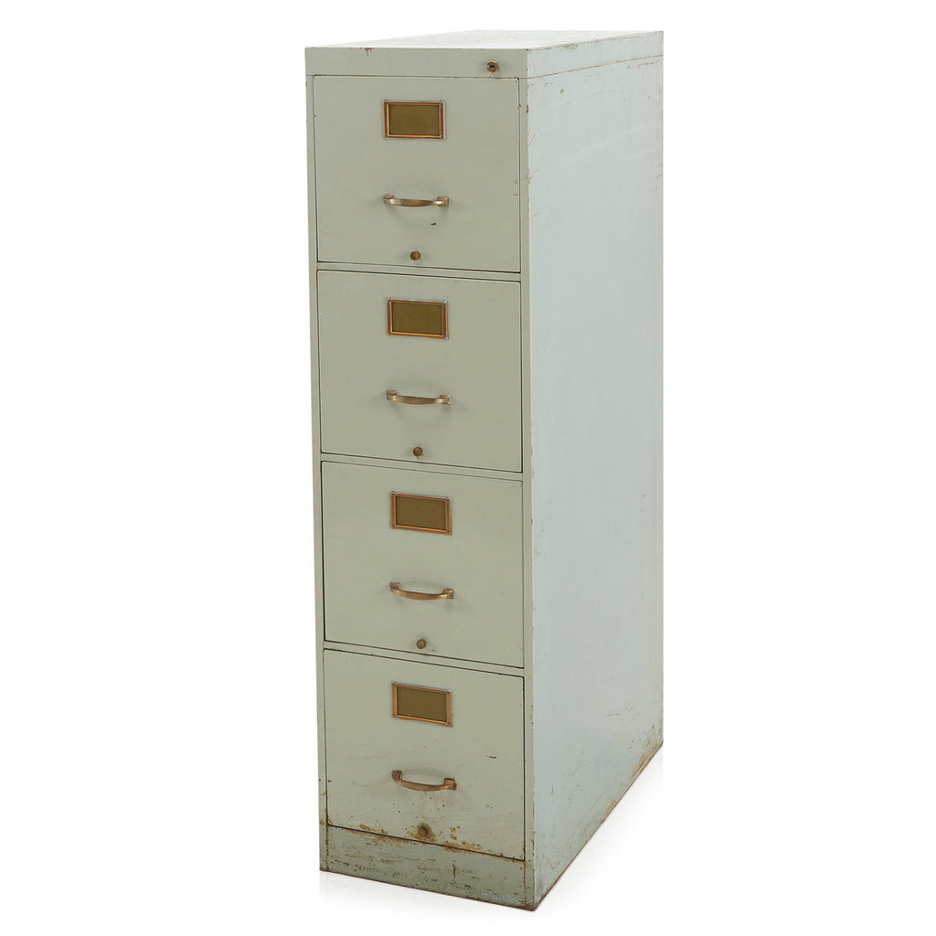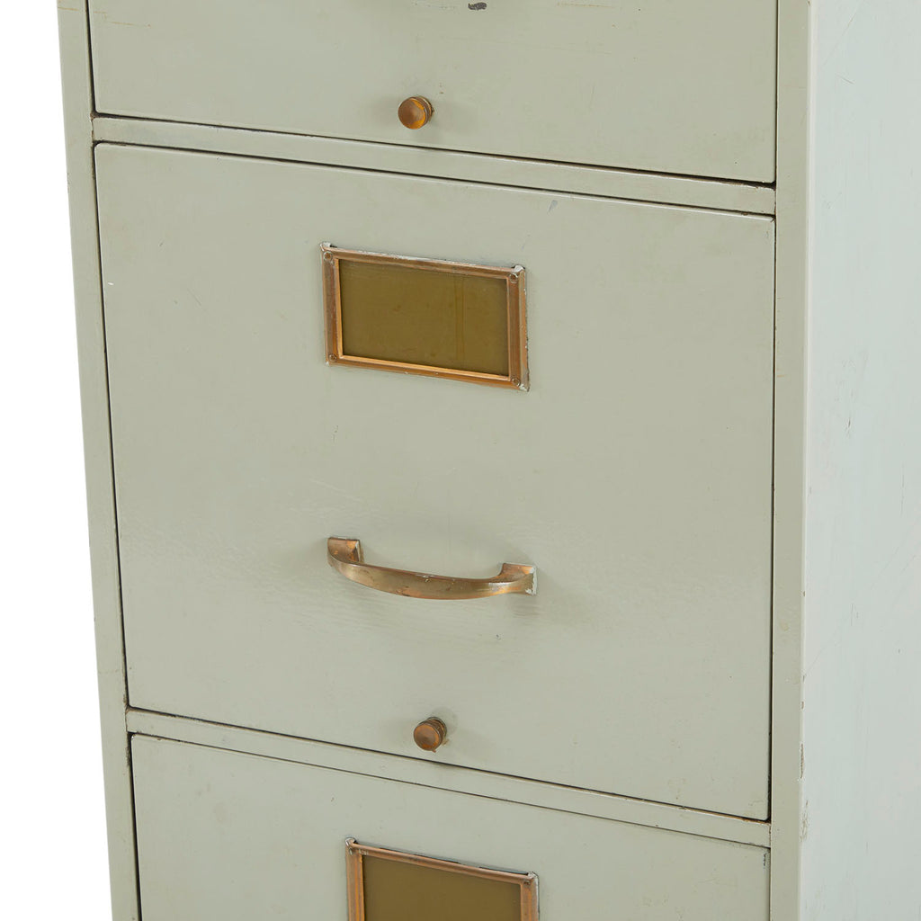 Details: Light grey metal file cabinet with brass handles and trim Dimensions: 53" H x 14.75" W x 28" D Quantity: 1