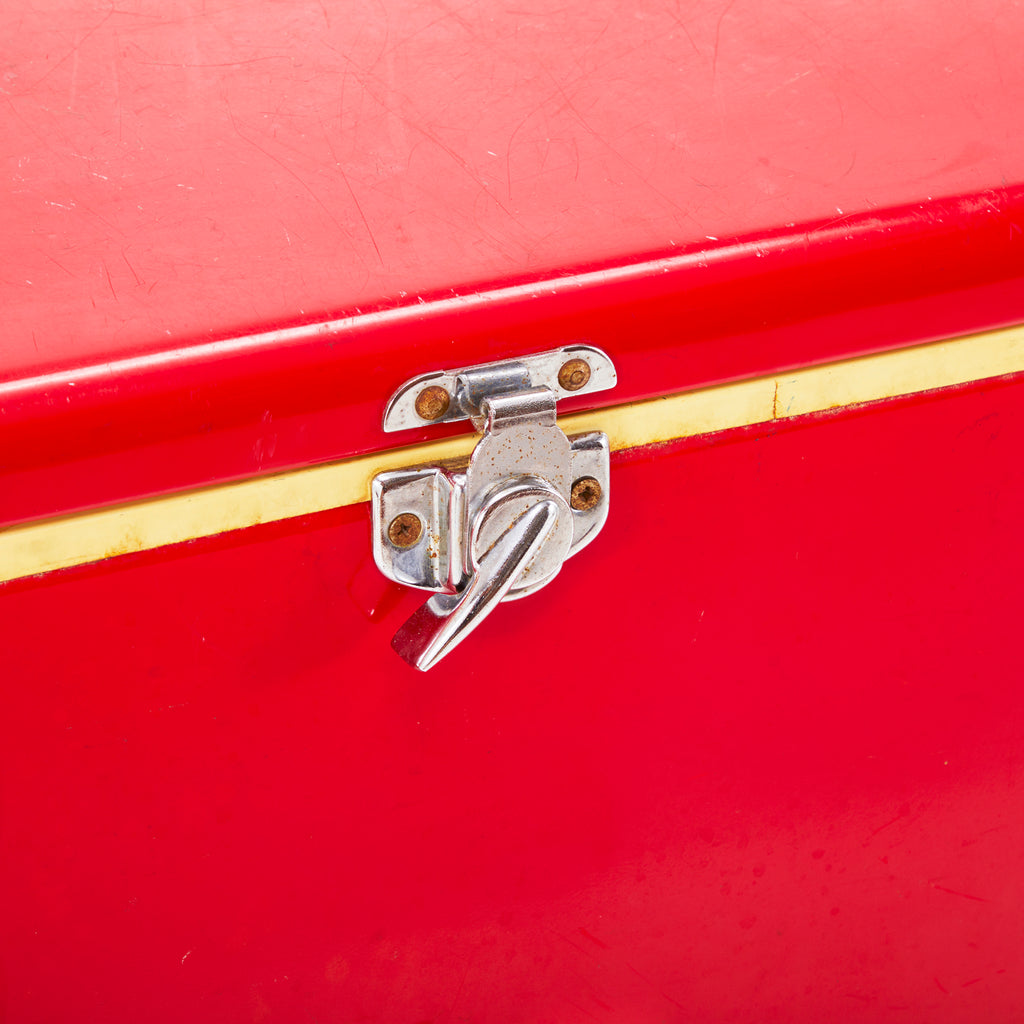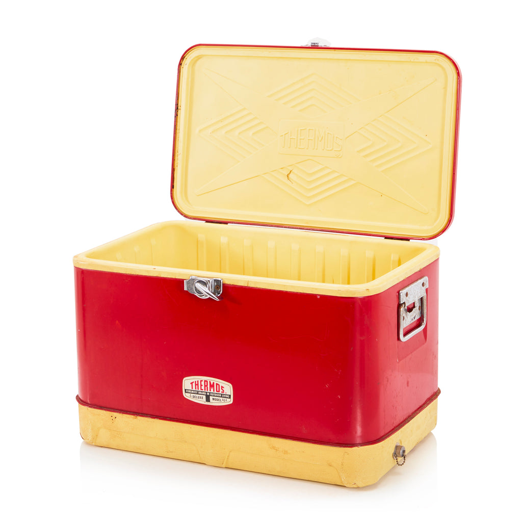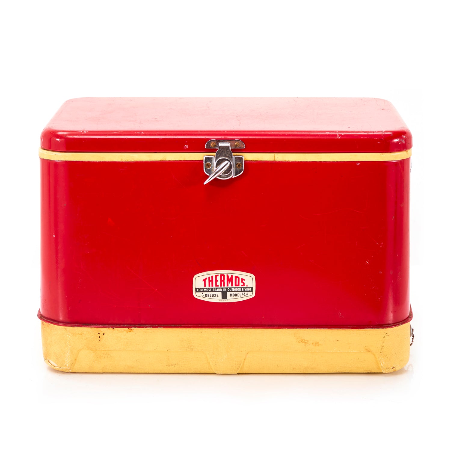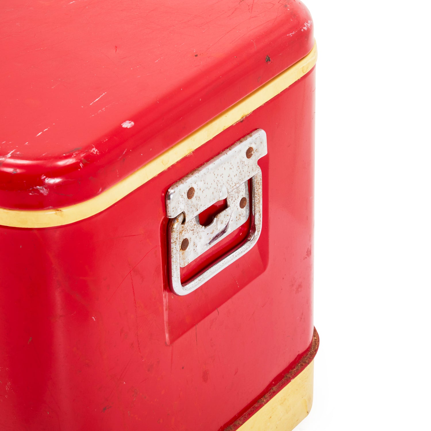 Details: Vintage red Thermos portable cooler with yellow base and interior Dimensions: 14" H x 21.5" W x 13" D Quantity: 1
