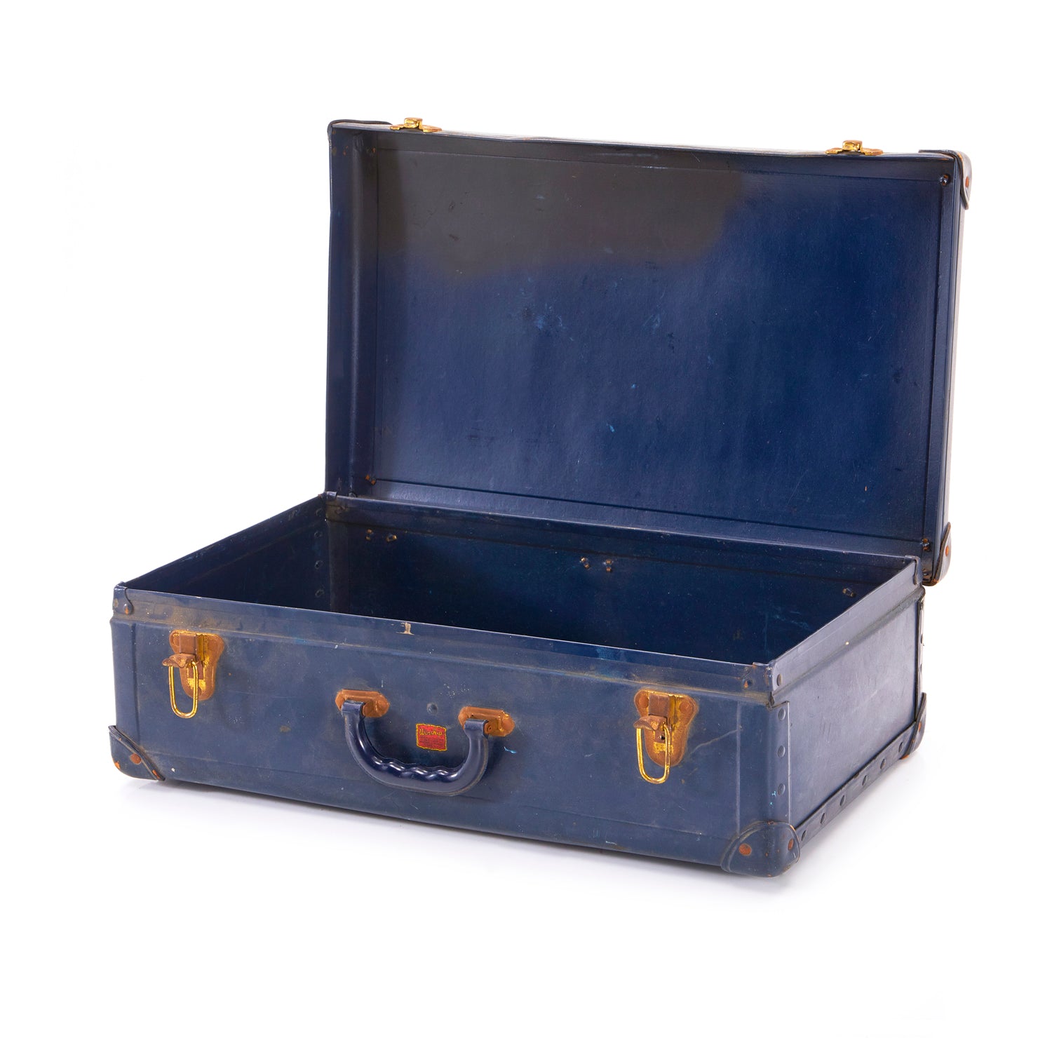 Details: Blue metal trunk with brass fasteners, worn Dimensions: 8" H x 21.5" W x 13" D Quantity: 2