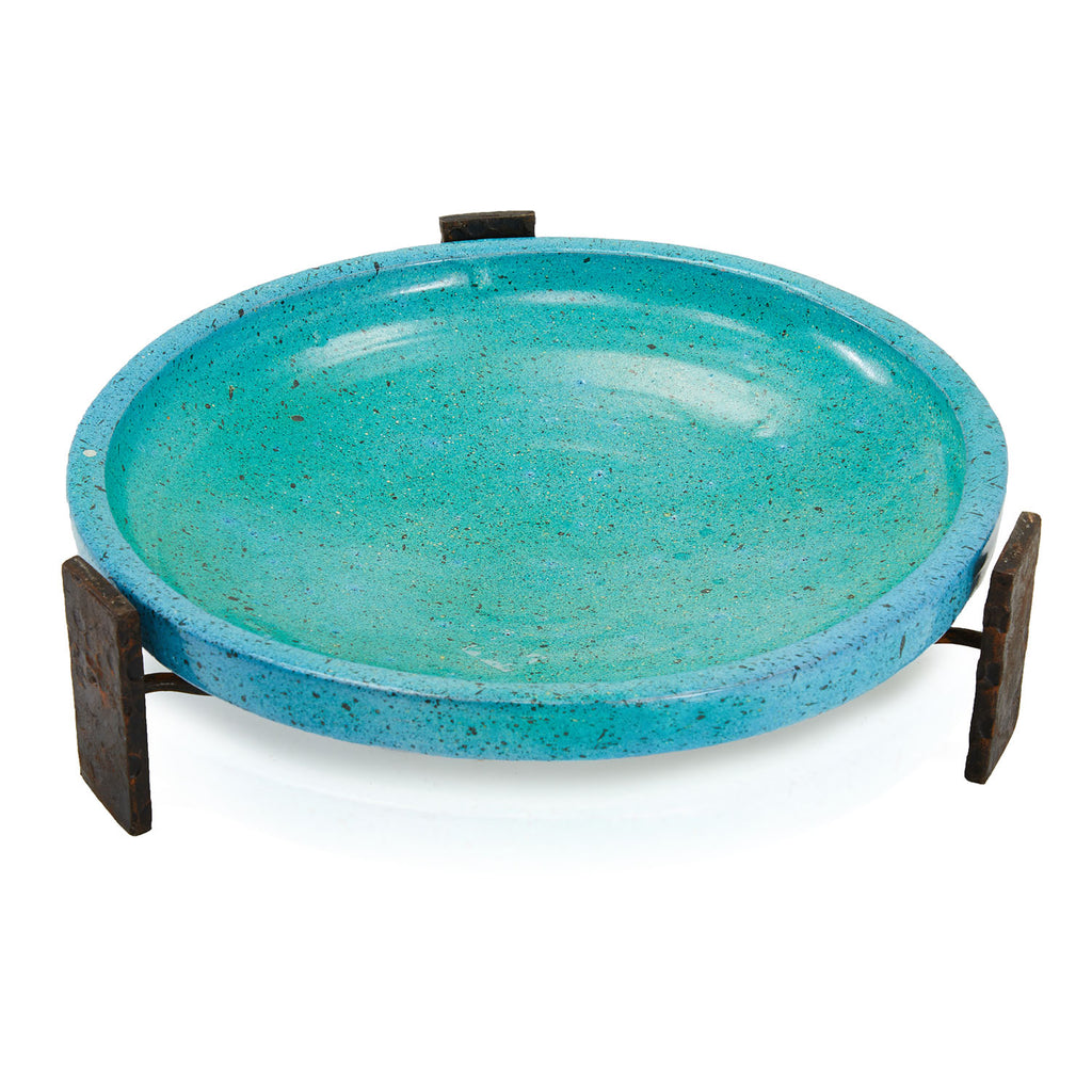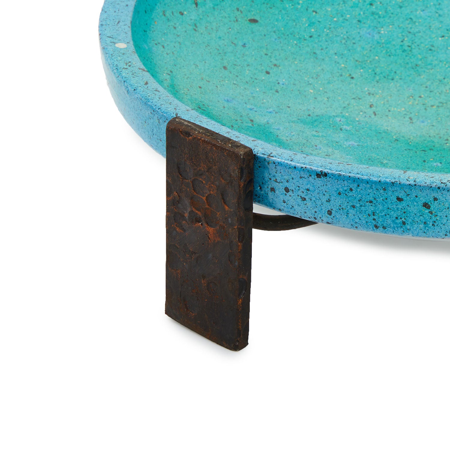 Details: Wide speckled turquoise ceramic dish on low black metal tripod stand Dimensions: 4" H x 14" W x 14" D Quantity: 1