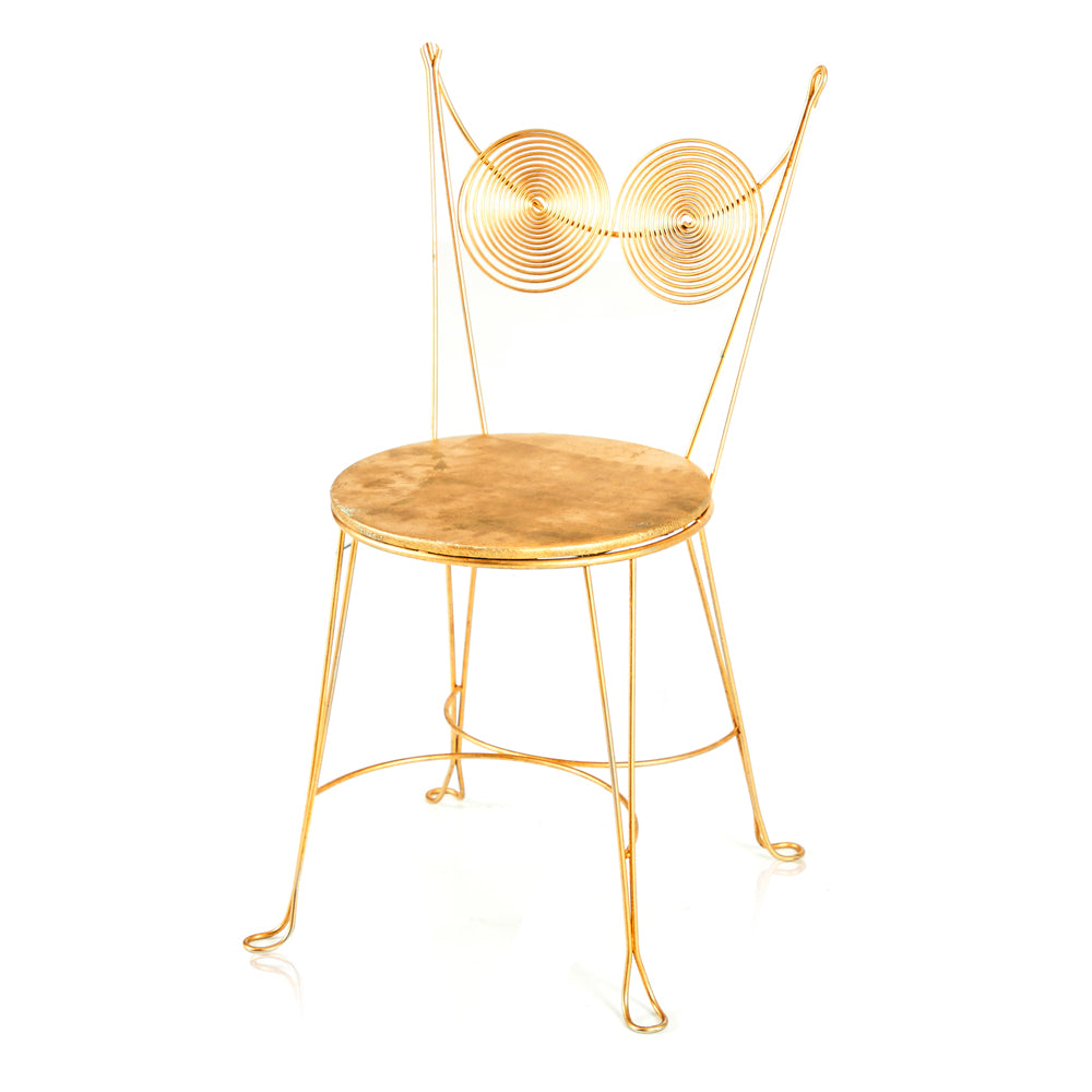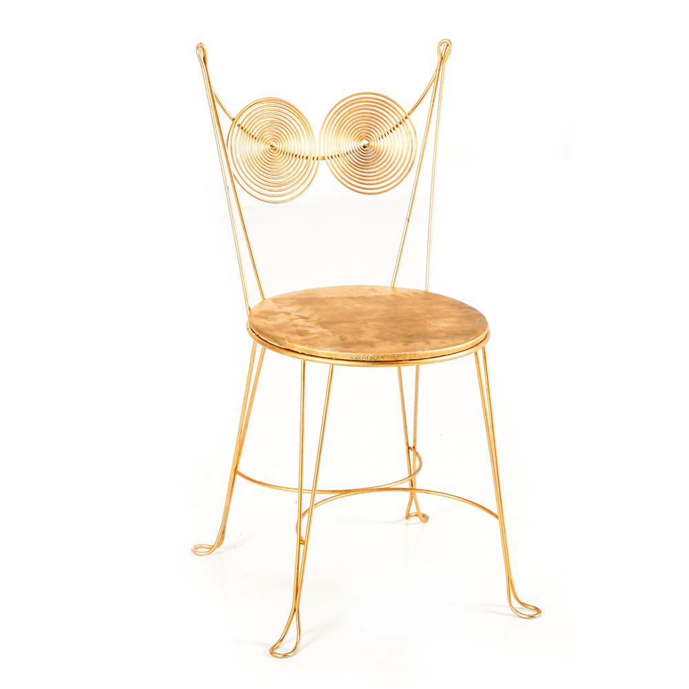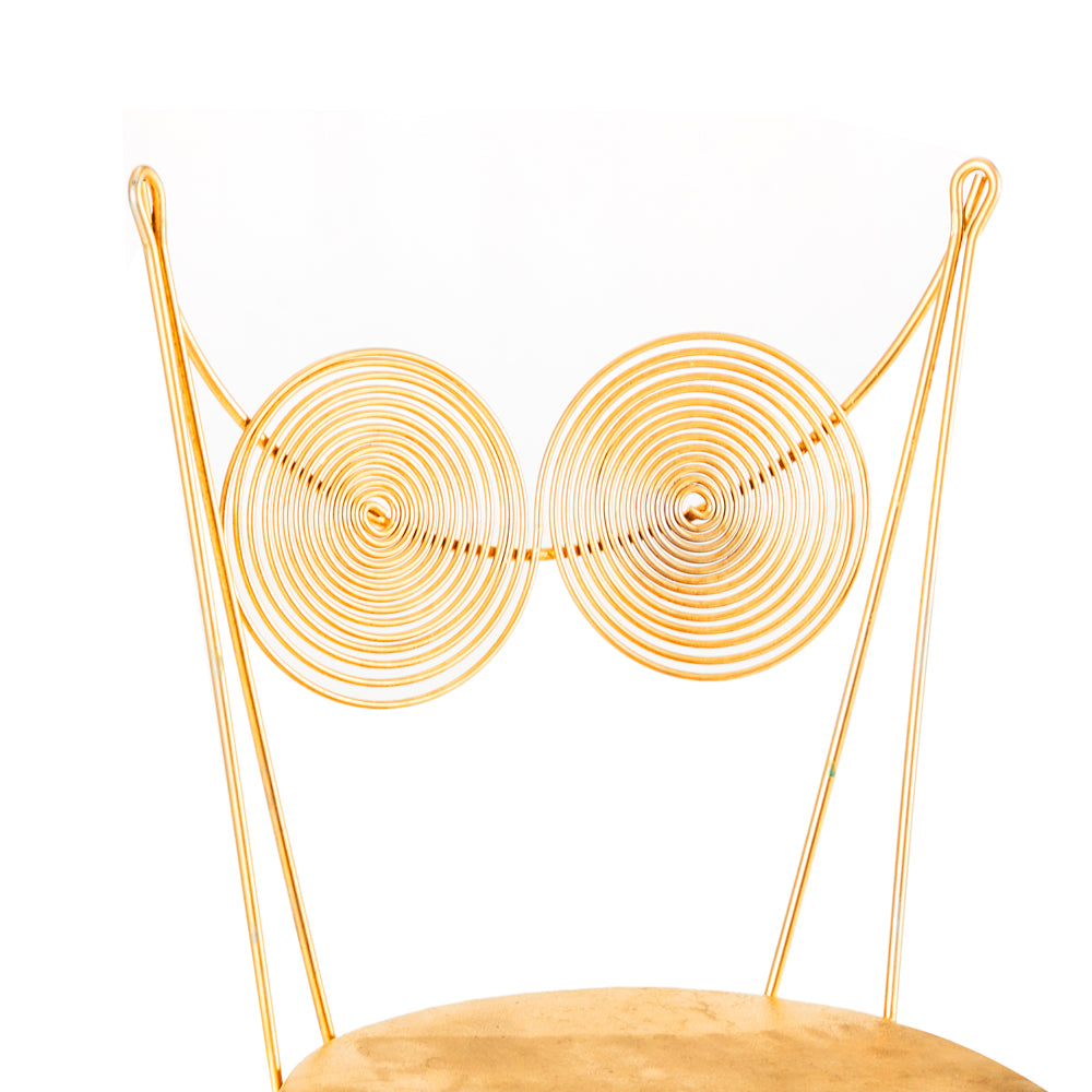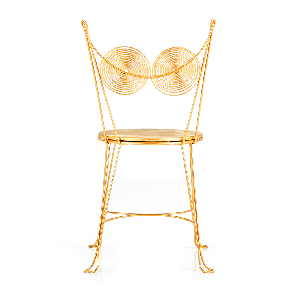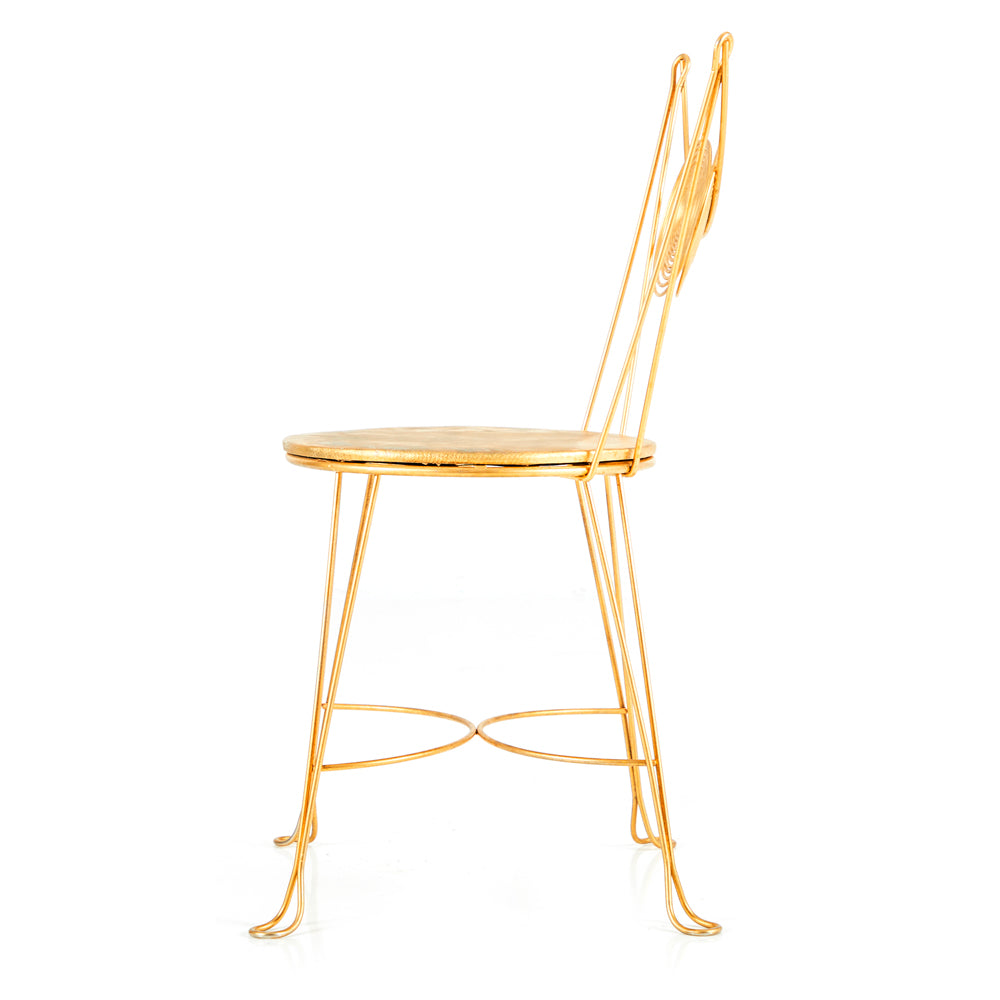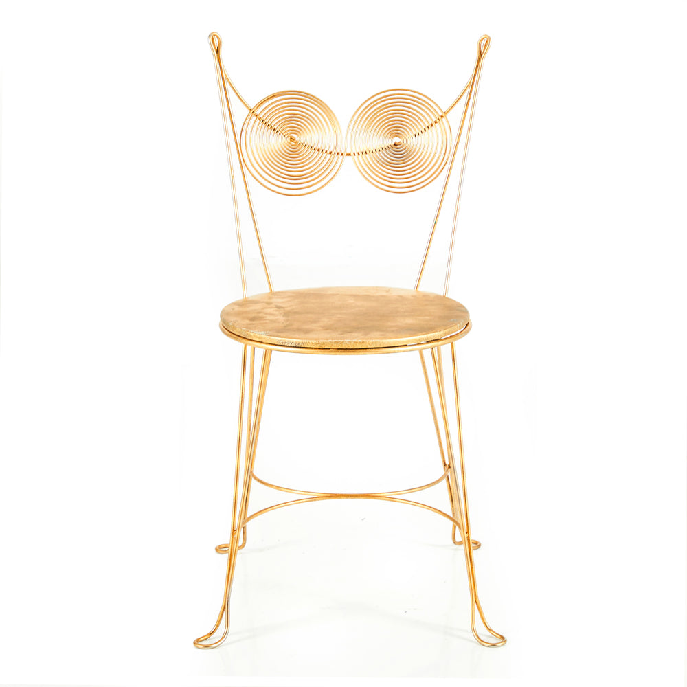 Details: Gold metal chair with semi open back Dimensions: 32" H x 17" W x 14" D Quantity: 1