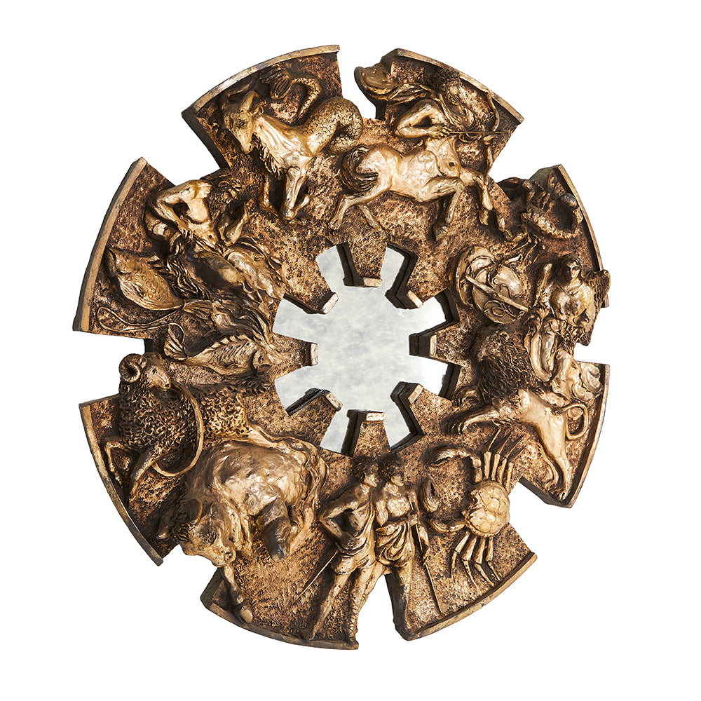 Details: Huge circular wall sculpture with engraved zodiac symbols and very small starburst shape mirror in middle
