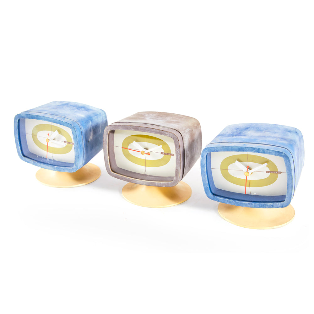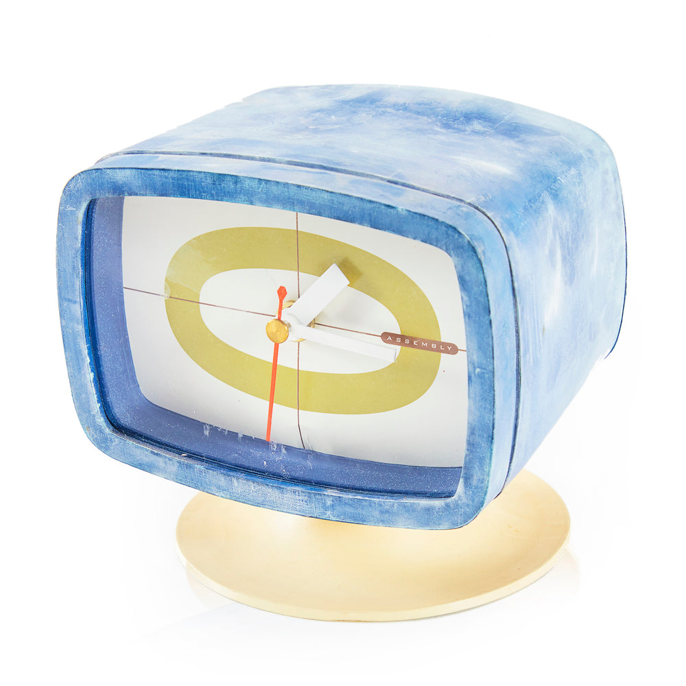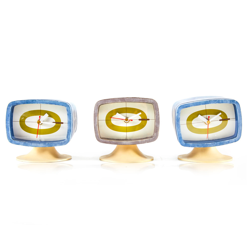 Details: Blue faded vintage desk clocks, Off-white tulip base, No numbers
