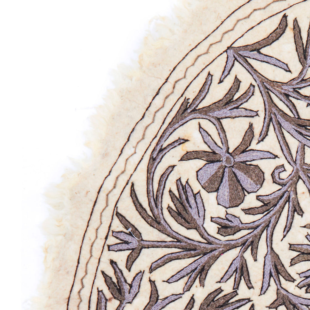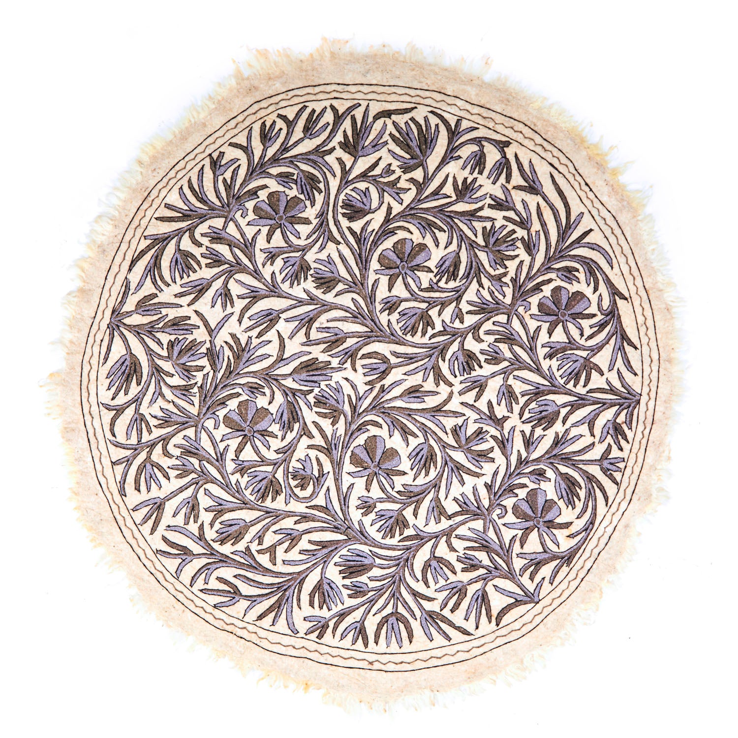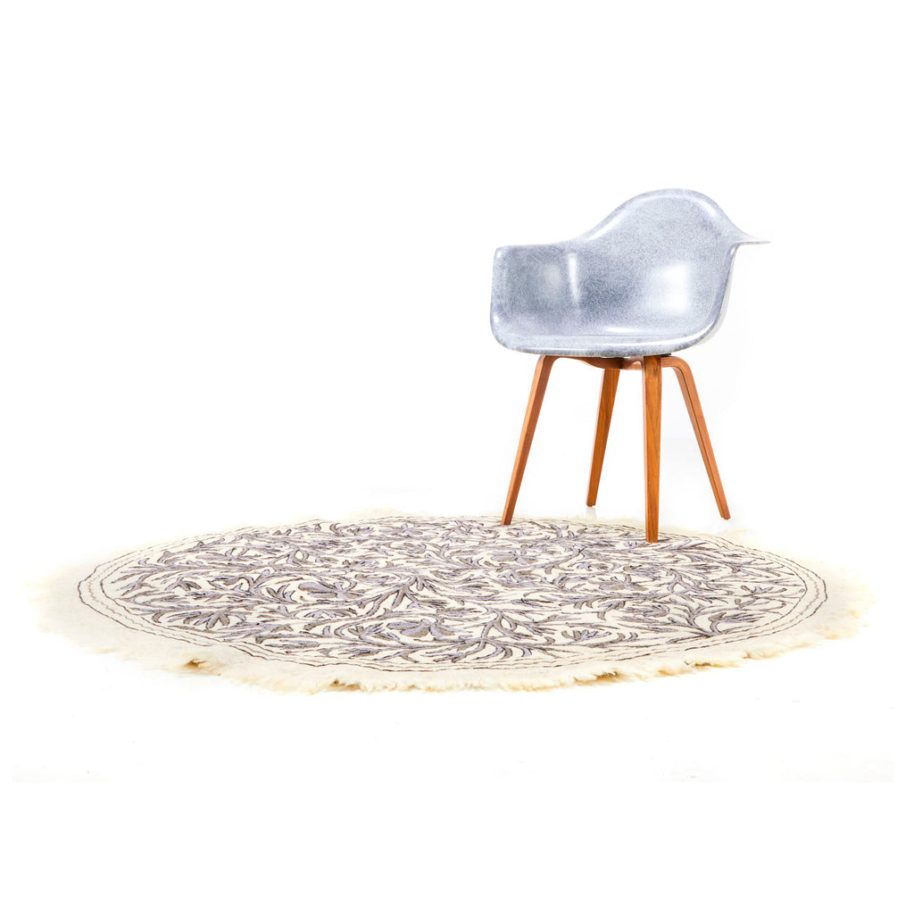 Details: Round white rug with white tassels and bicolor tree branch design