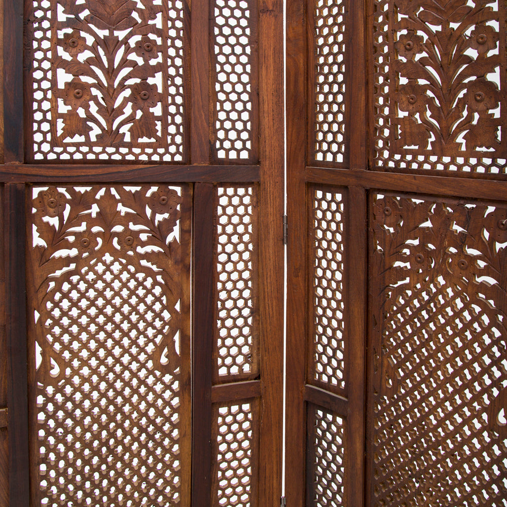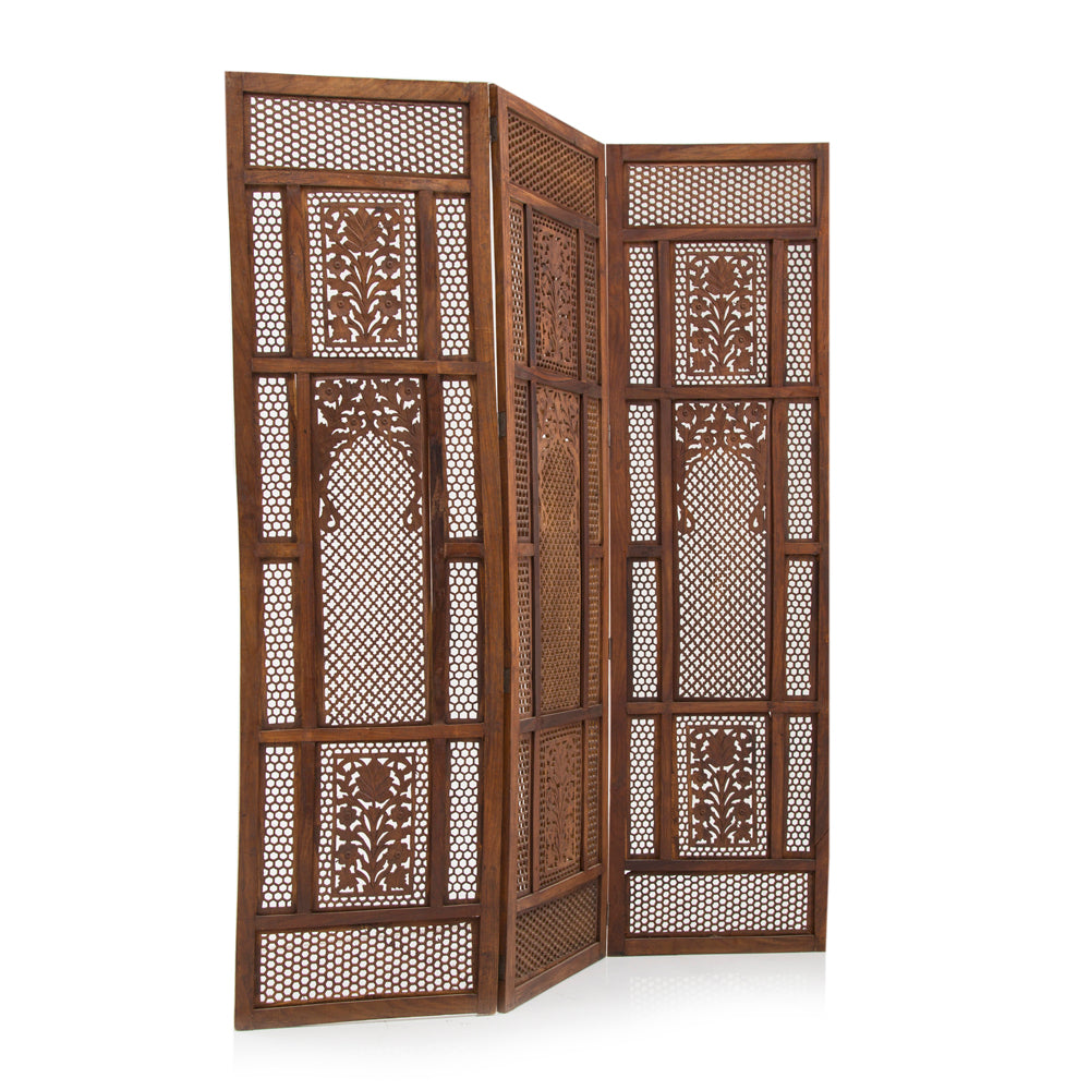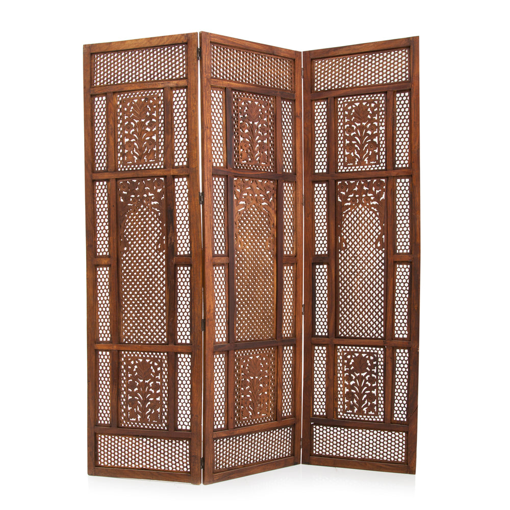 Details: Wood folding screen with 3 Indian motif / intricate carved panels