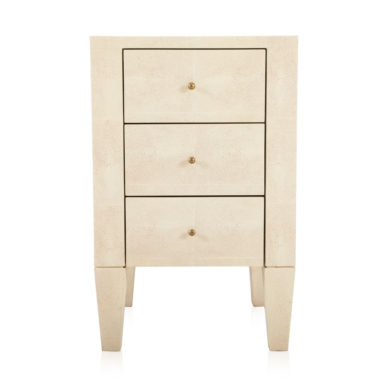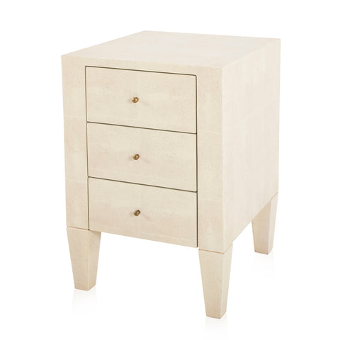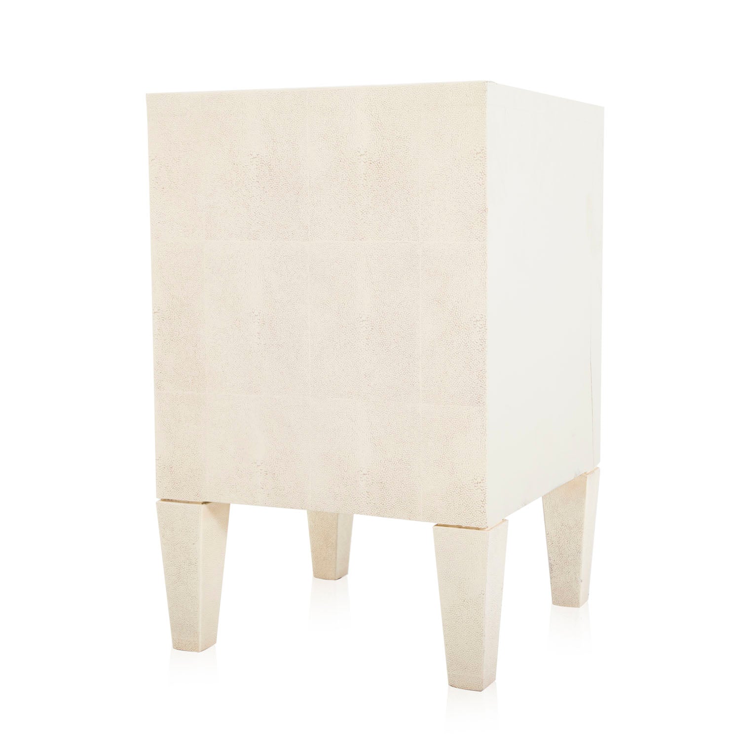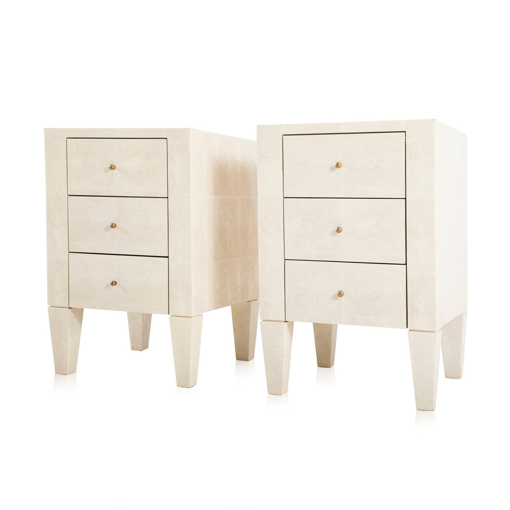 Details: Bedside table with white leather exterior and three drawers Dimensions: 28.5" H x 18" W x 18" D Quantity: 2