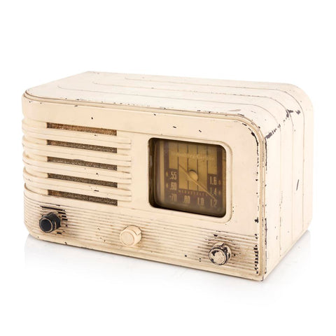 Details: White vintage "Midland" television with steel antenna, two silver dials Dimensions: 8.25" H x 8.5" W x 9.5" D
