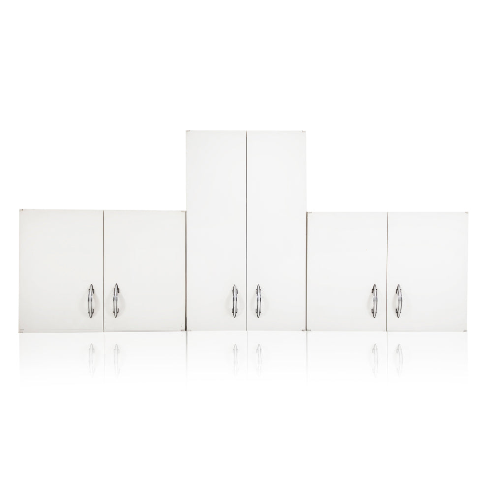 Details: Short white wall mount kitchen cabinets with chrome handles Dimensions: 18" H x 24" W x 14" D Quantity: 2 short, 1 tall