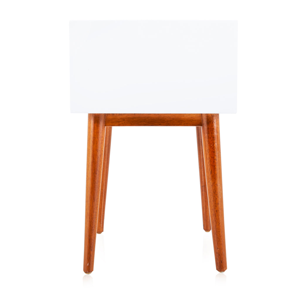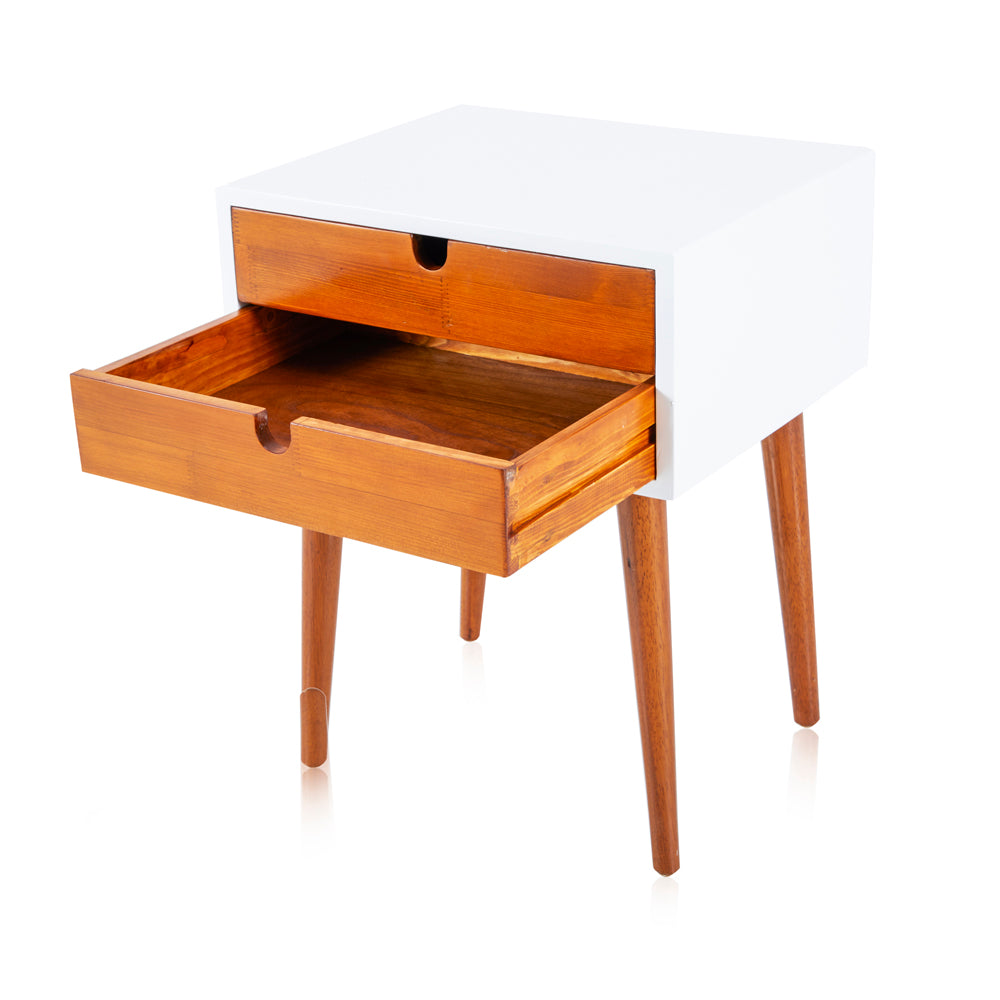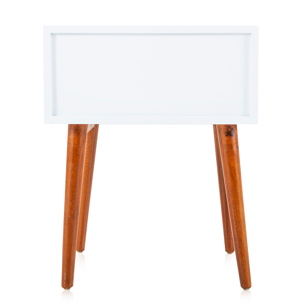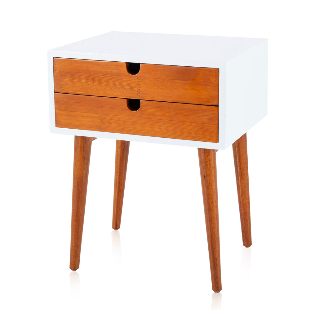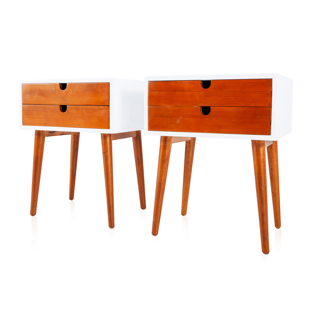 Details: White and wood bedside table with two slim drawers Dimensions: 24" H x 18.5" W x 15.5" D Quantity: 2