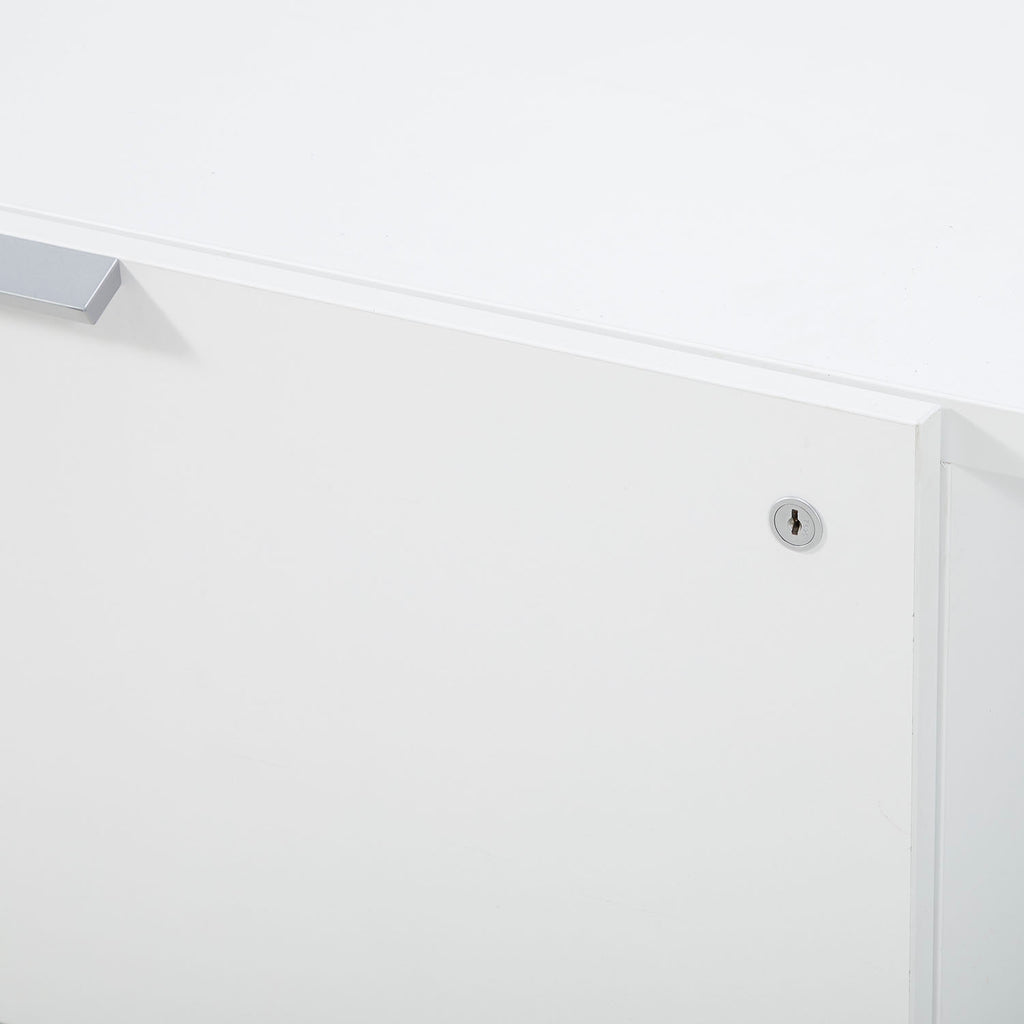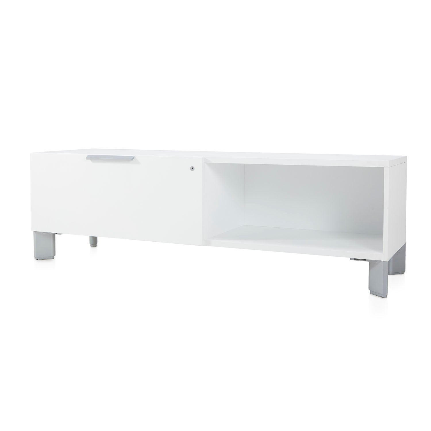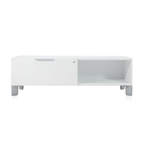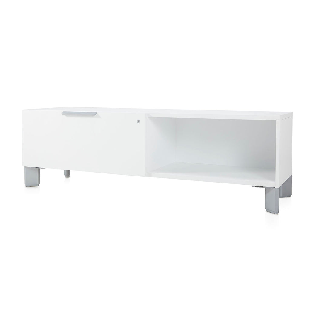 Details: Contemporary white wooden low media console with metal feet Dimensions: 21" H x 66" W x 21" D Quantity: 1