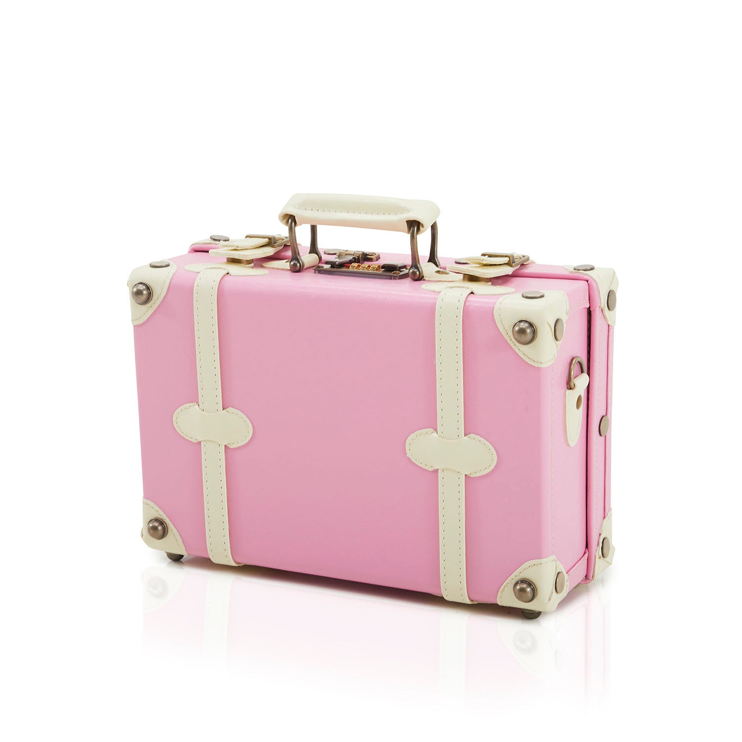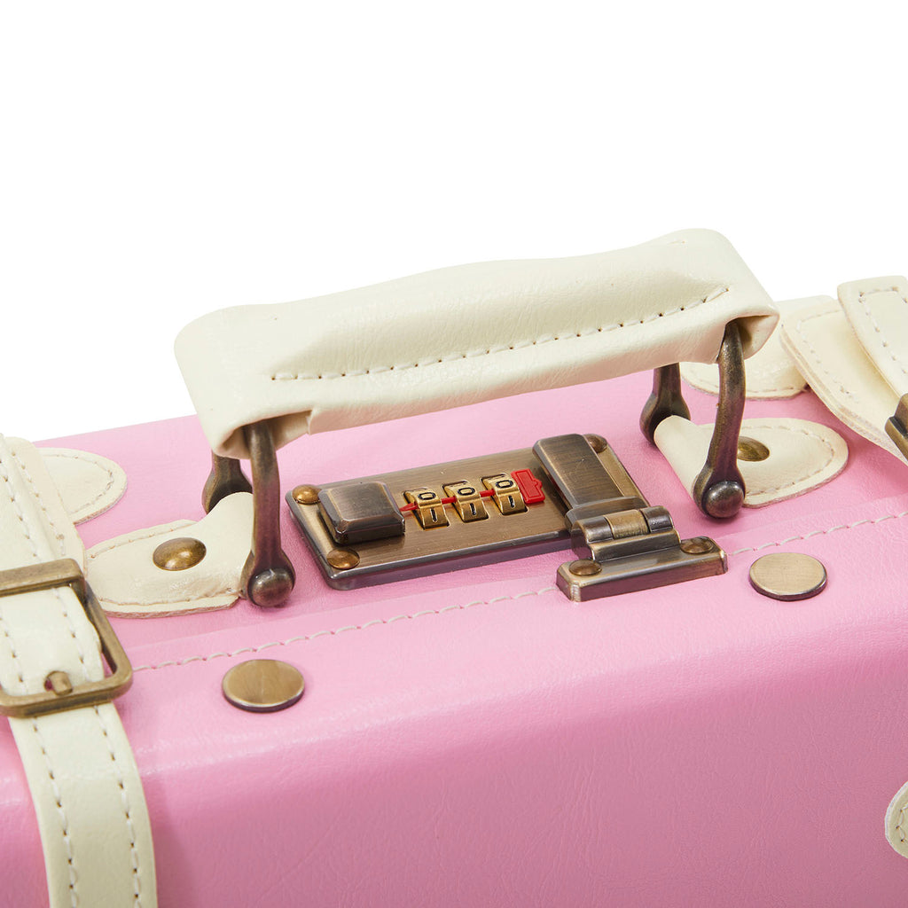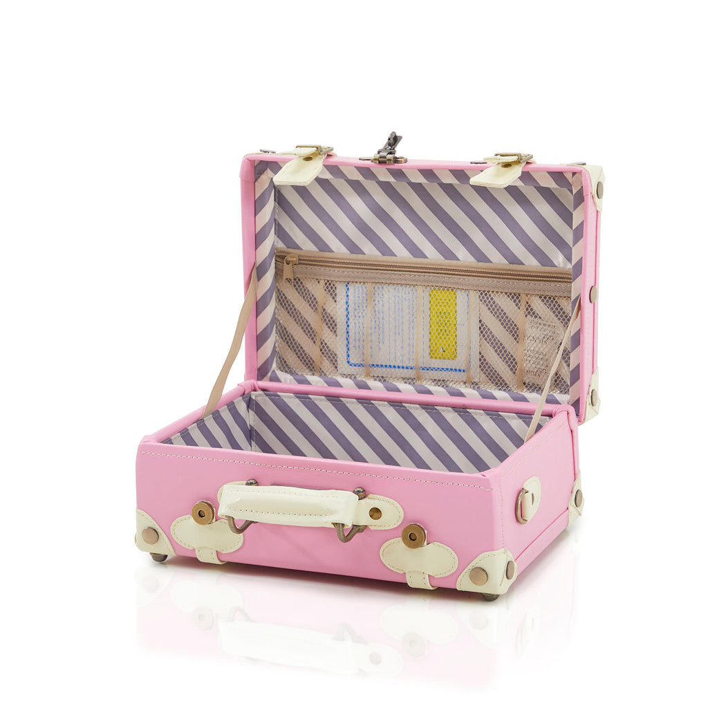 Details: Pink leather suitcase with white straps and striped interior Dimensions: 11.5" H x 14" W x 5" D Quantity: 1