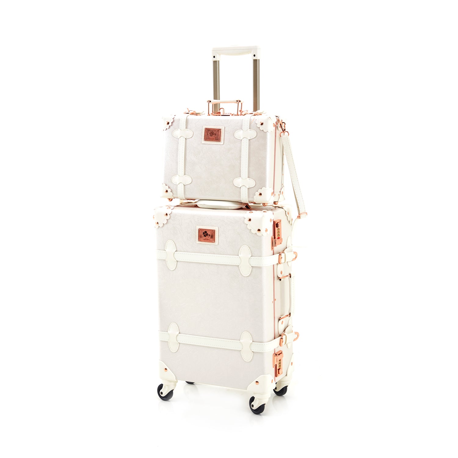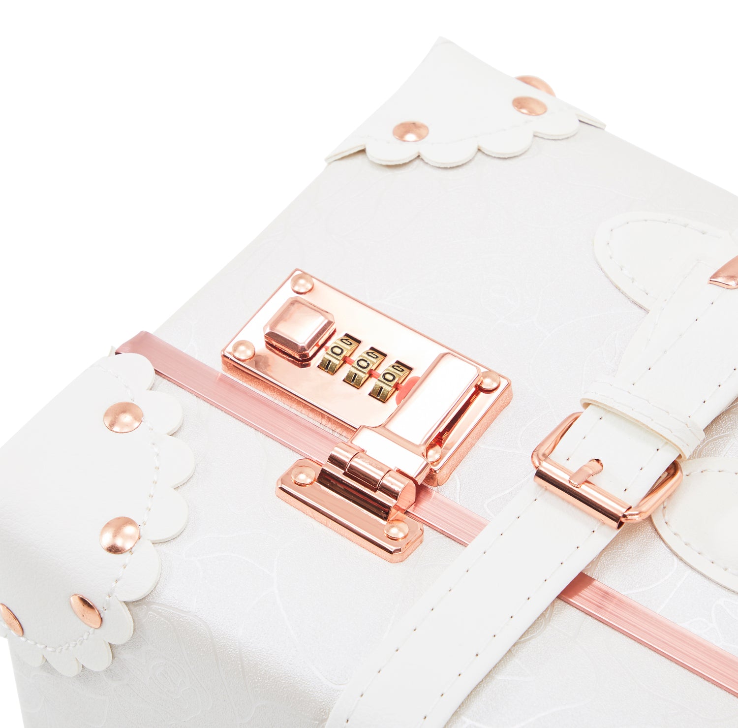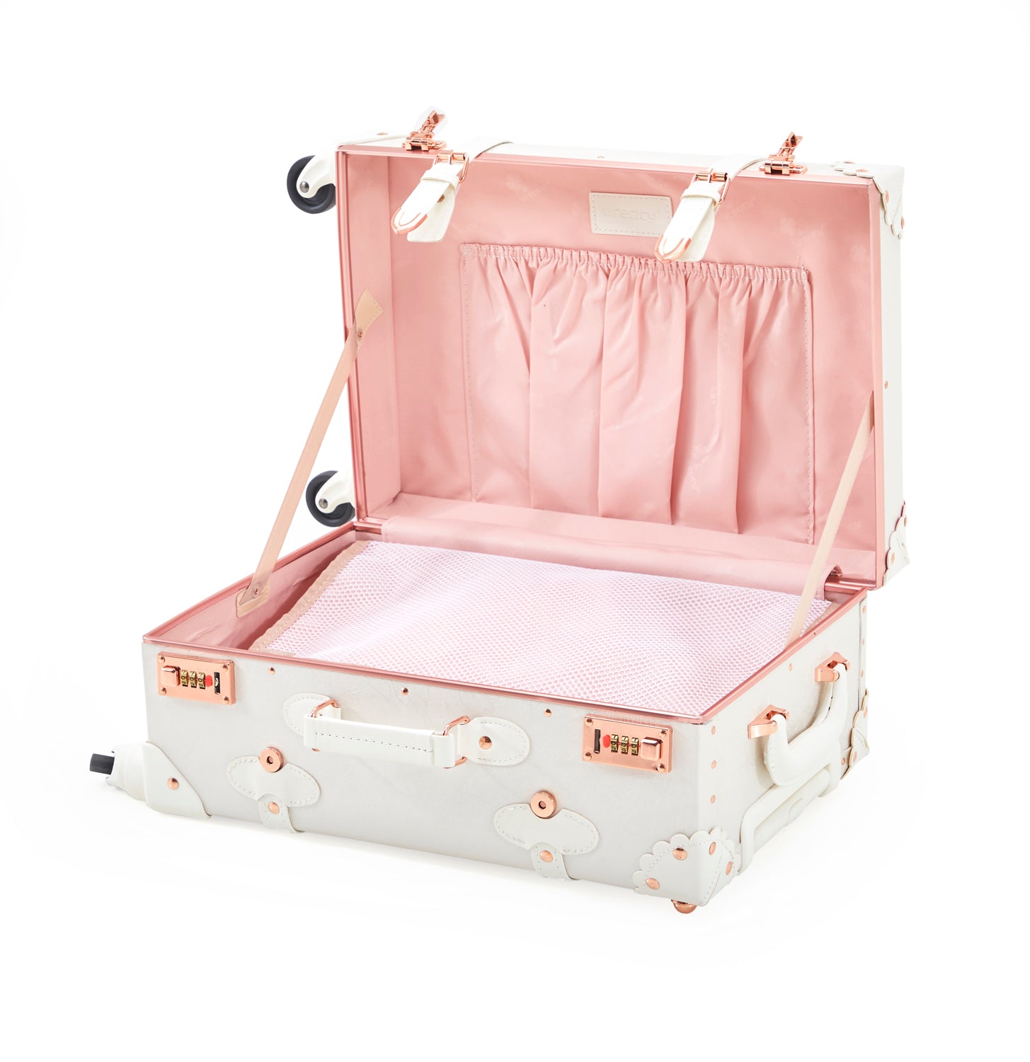 Details: Small White and Pink Modern Cosmetic Suitcase (matching larger suitcase also avail separately) Dimensions: 10" H x 13" W