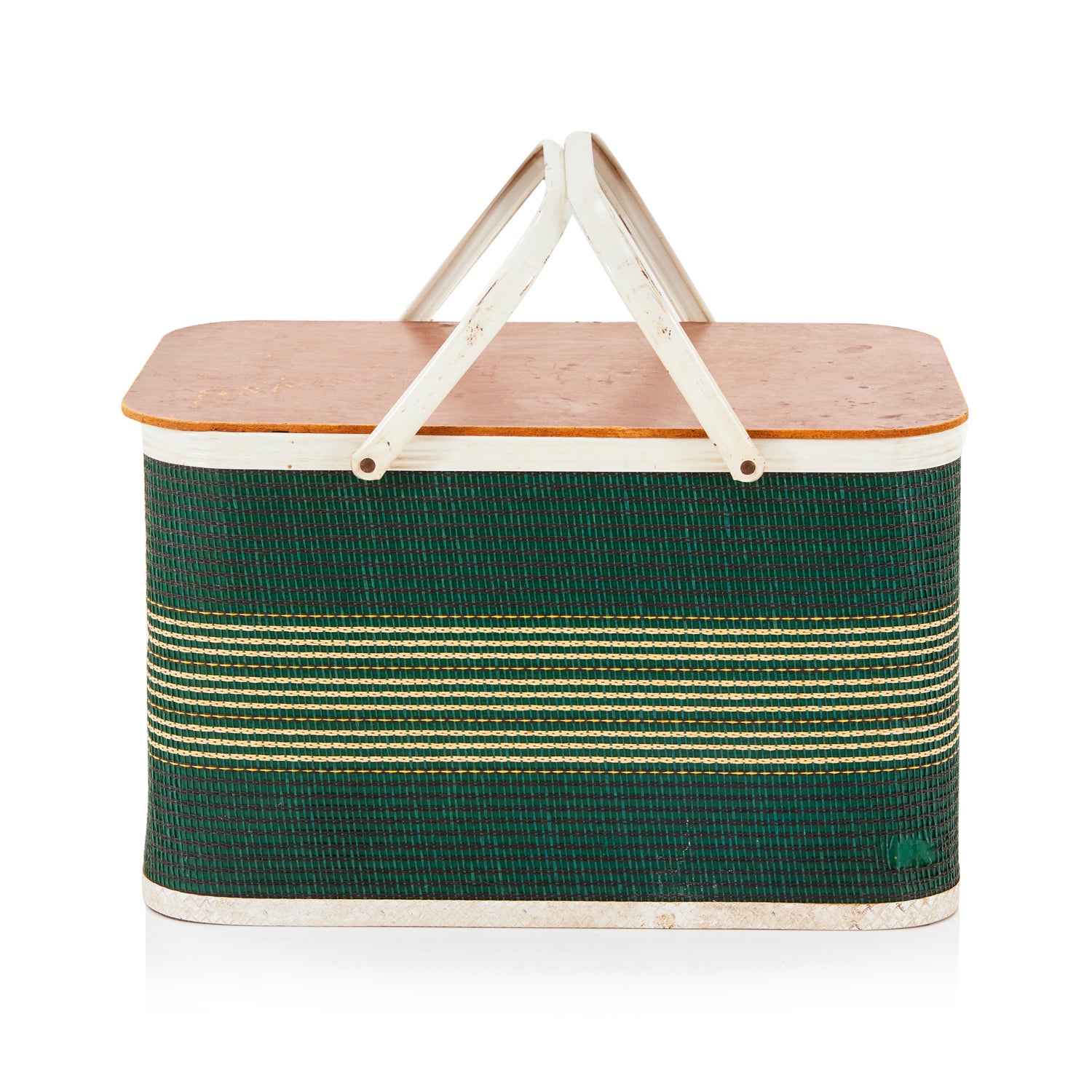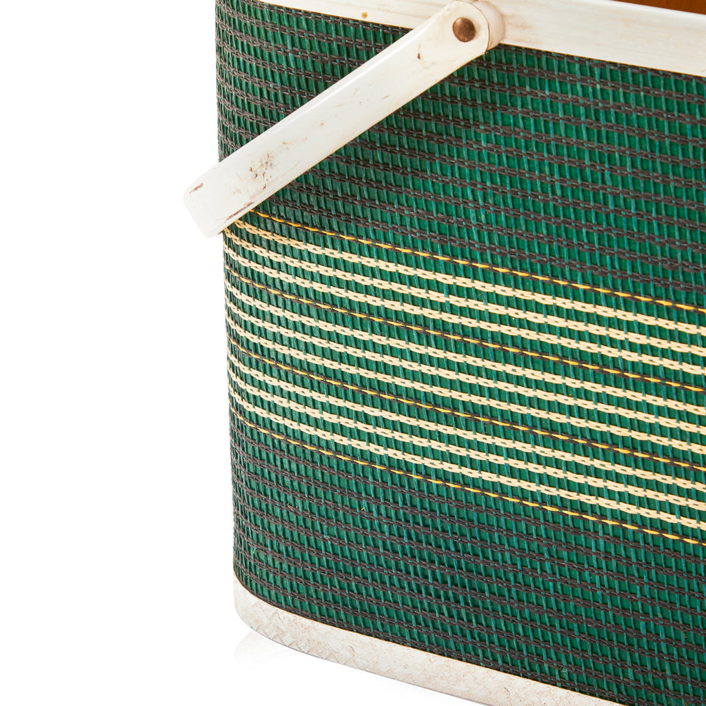 Details: Vintage green and orange striped wicker basket with white frame and handles Dimensions: 11" H X 18.5" W X 11" D Quantity: 1