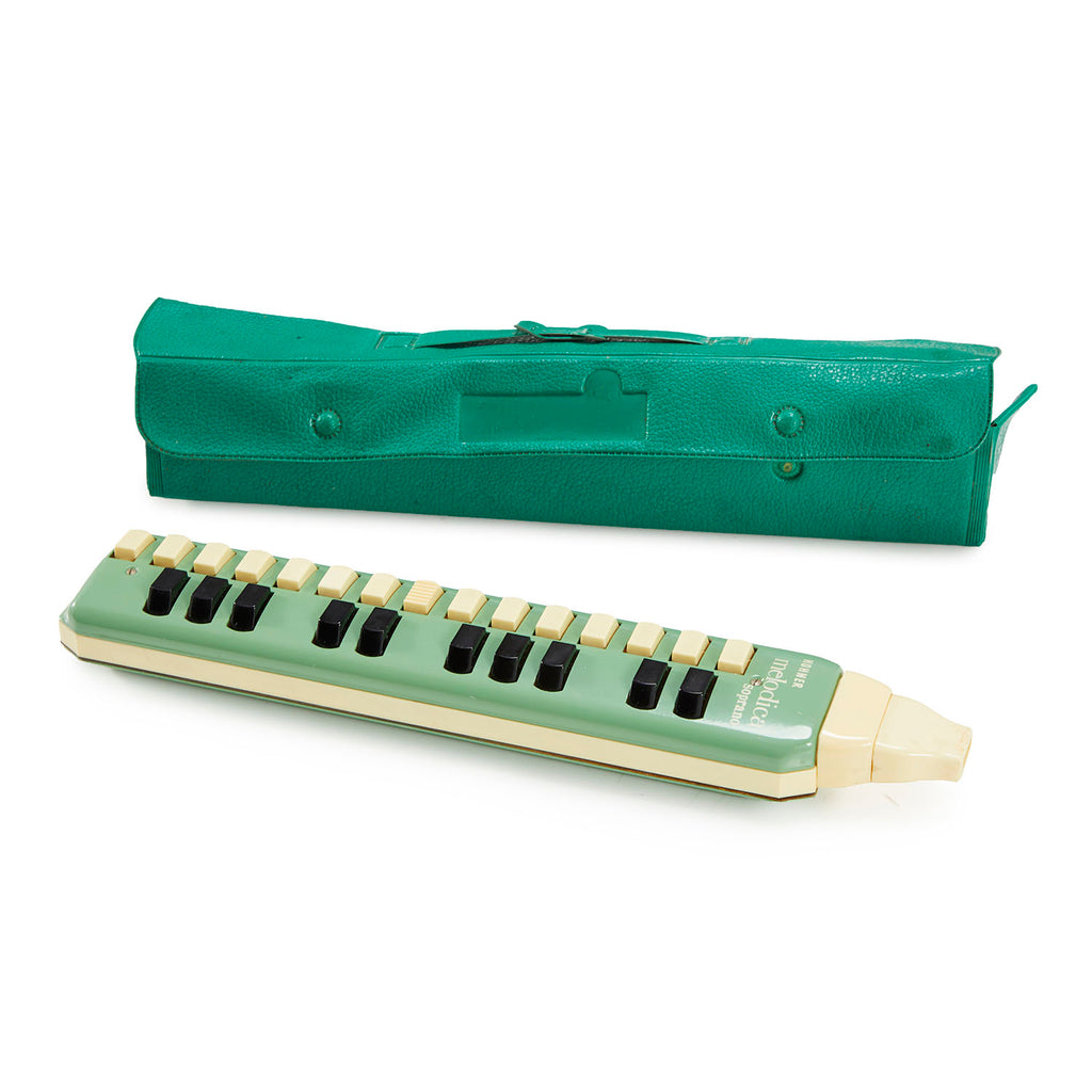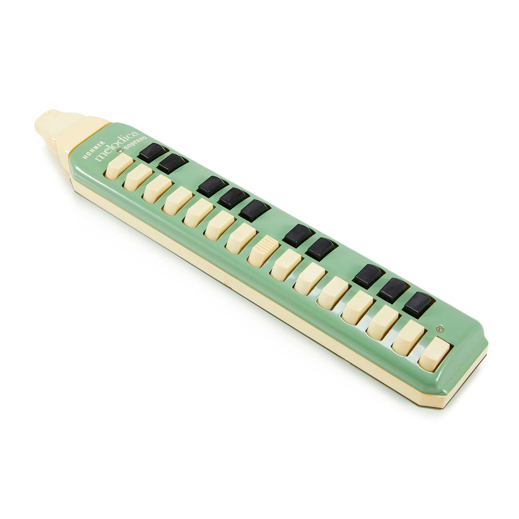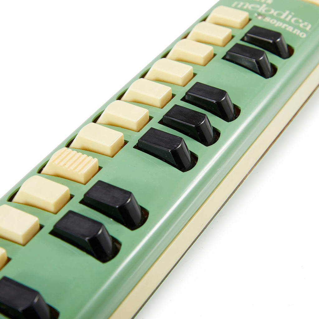 Details: Pastel green and white Soprano Melodica with white and black buttons Dimensions: 13" H x 3" W x 3" D Quantity: 1