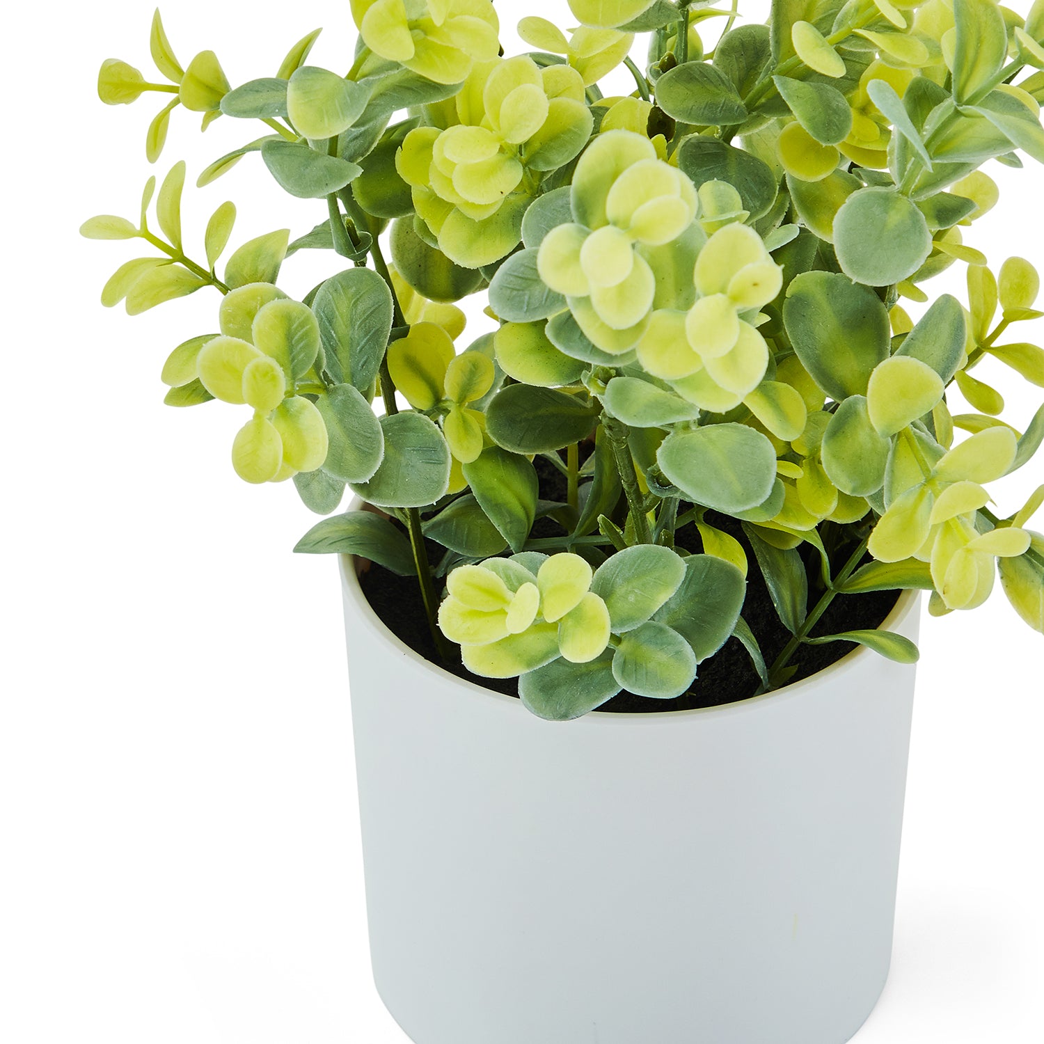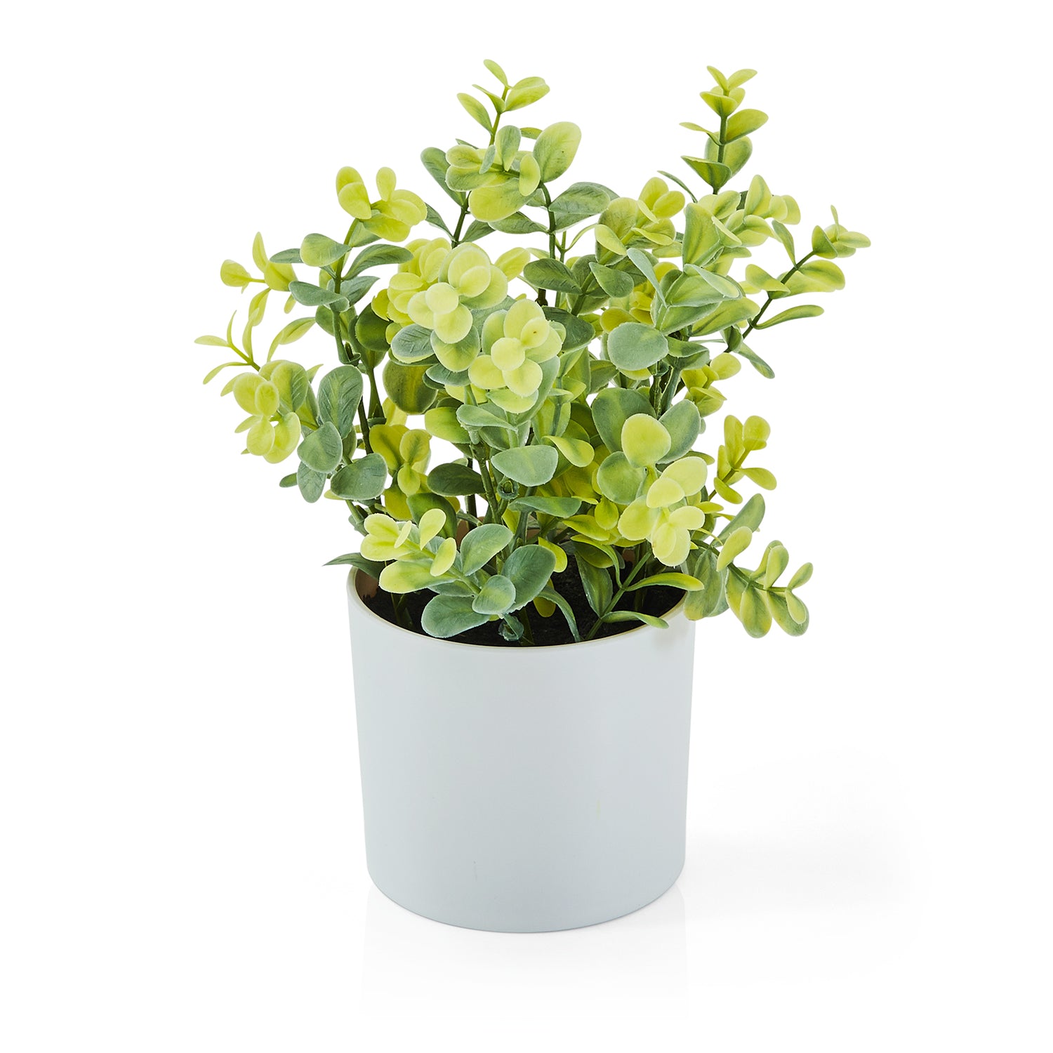 Details: White plastic contemporary planter with faux greenery Dimensions: 9.5" H x 6.6" W x 6.5" D Quantity: 1