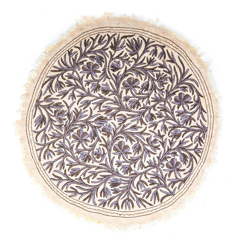 Details: Round white rug with white tassels and bicolor tree branch design Dimensions: 68" W x 68" D Quantity: 1