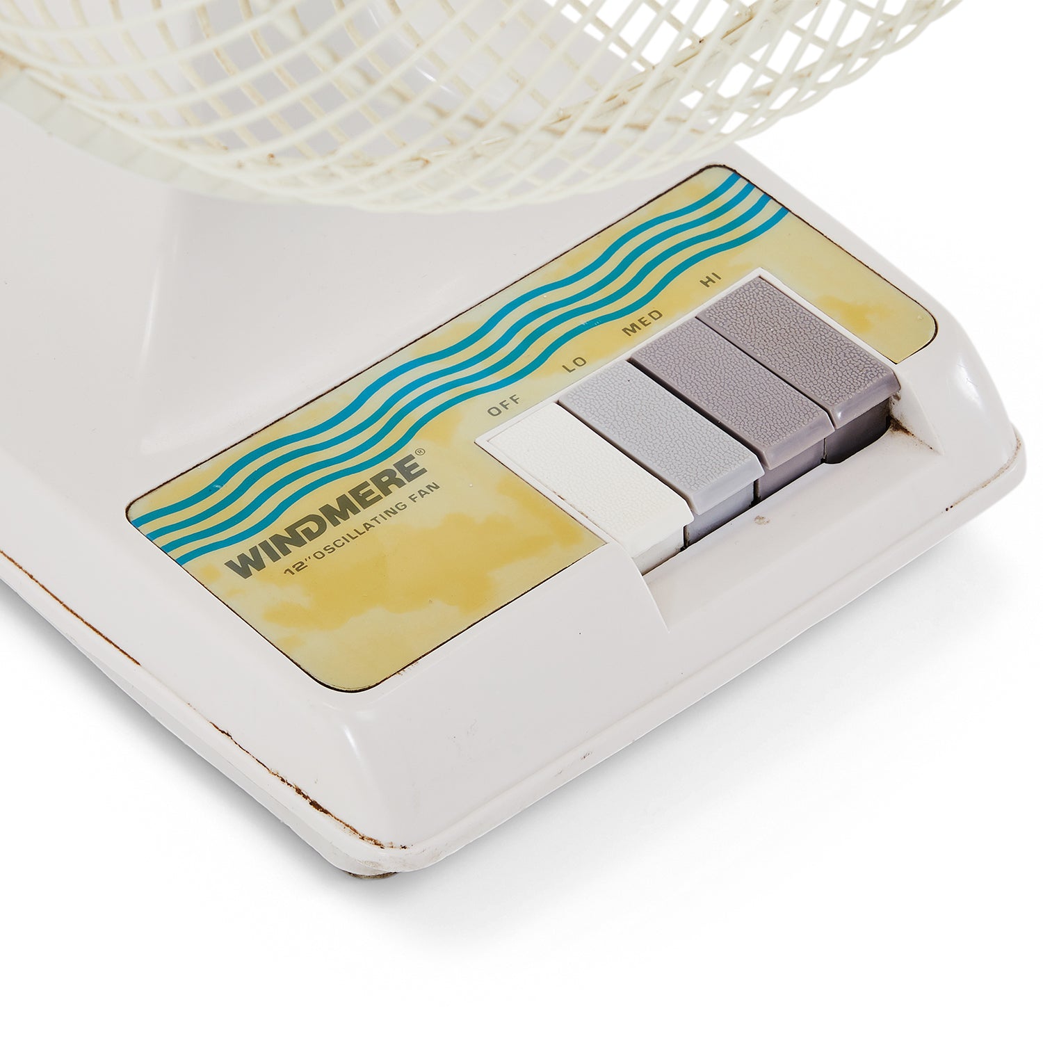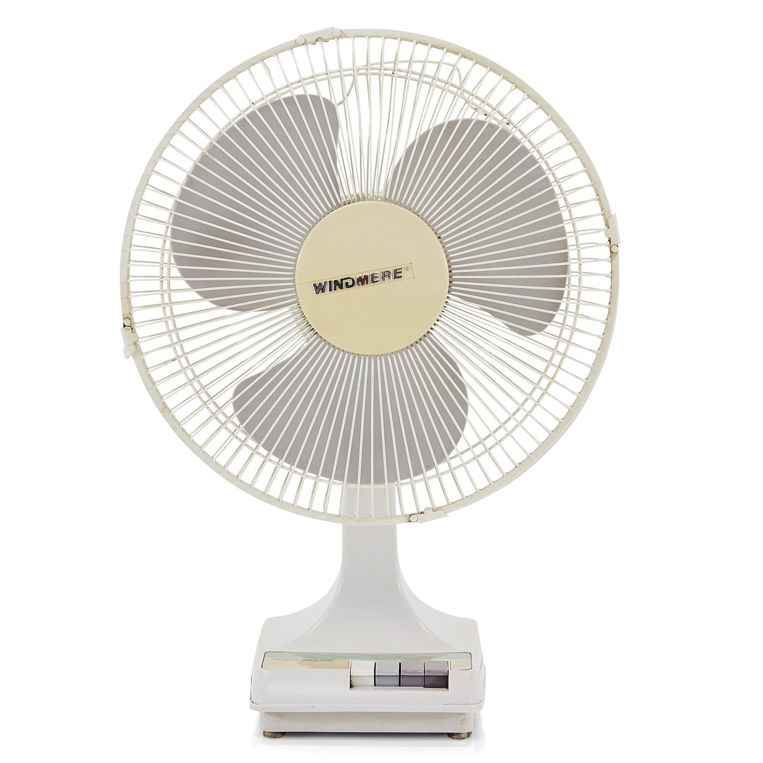 Details: Vintage white three speed Windmere oscillating desk fan with gray blade and buttons Dimensions: 21" H x 13" W x 10" D Quantity: 1