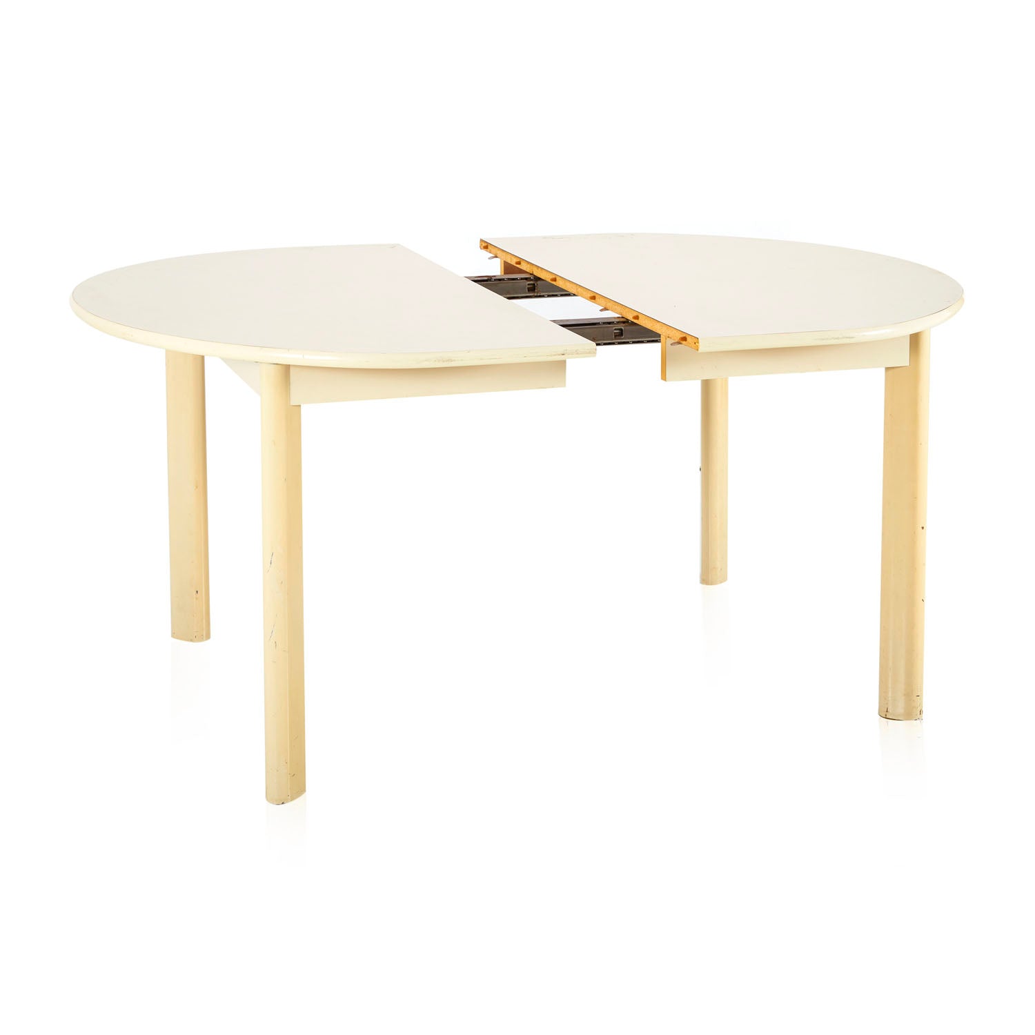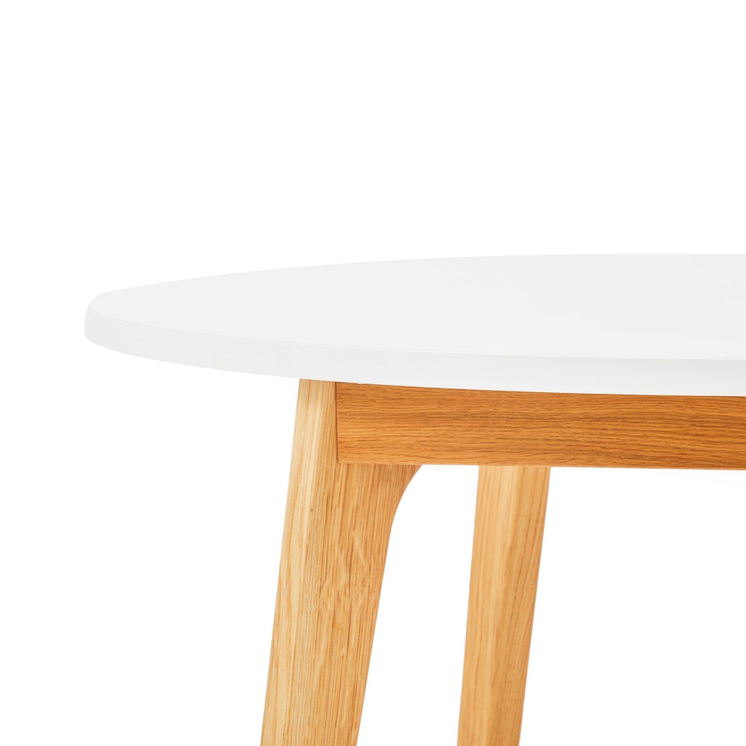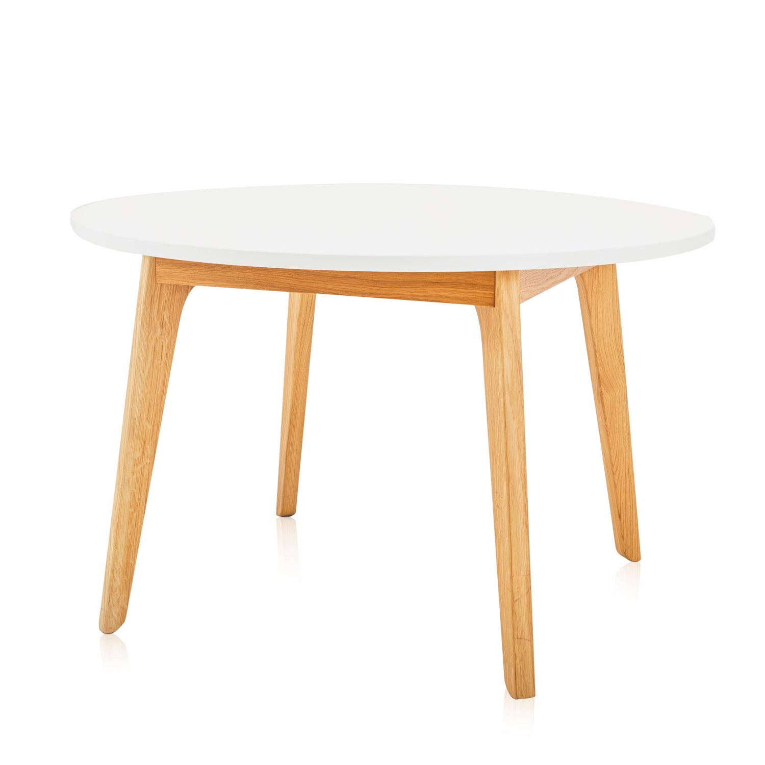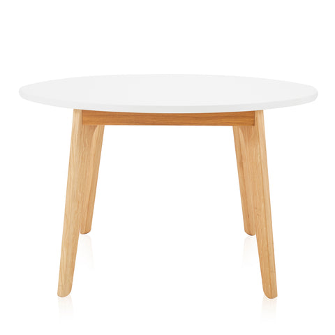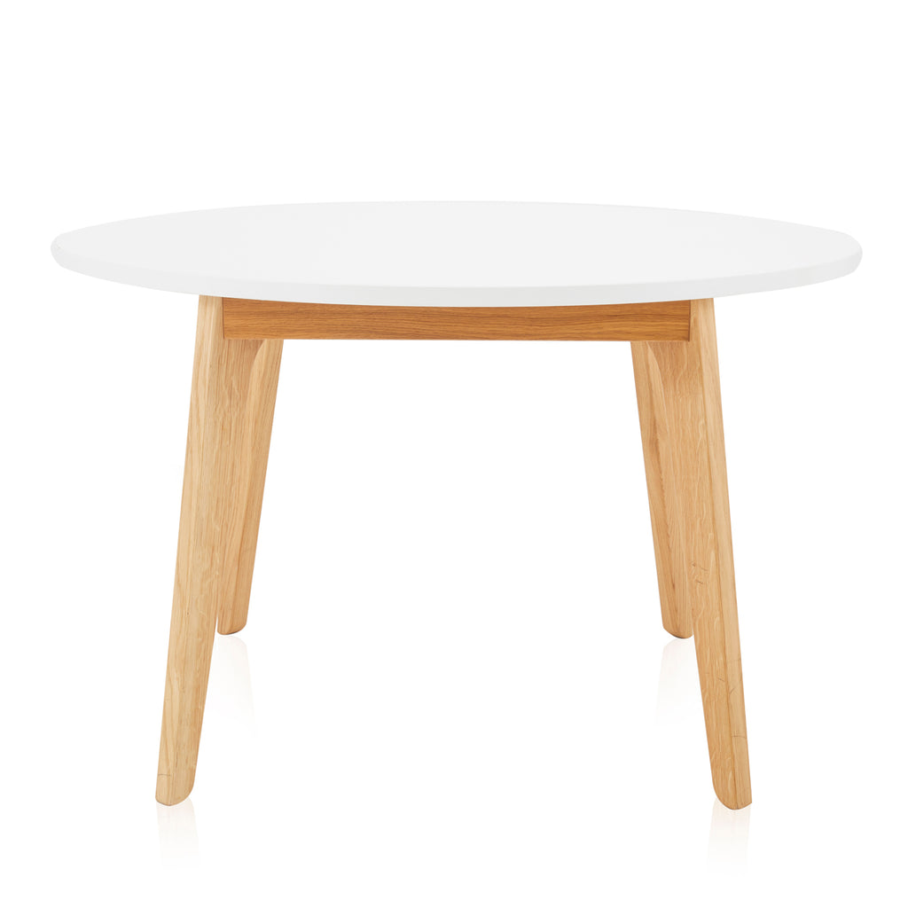 Details: Contemporary white round kitchen table with light wooden base Dimensions: 30" H x 47" W x 47" D Quantity: 1