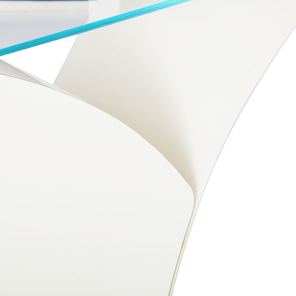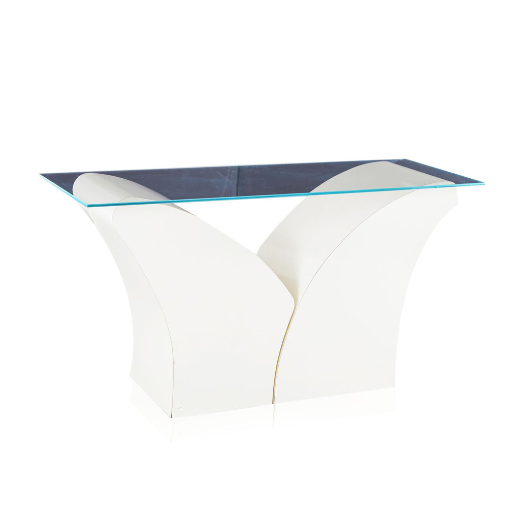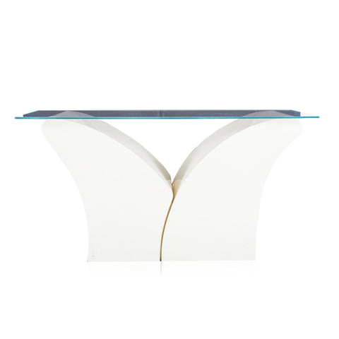 Details: White 2-prong base console table with glass top Dimensions: 29" H x 56" W x 20" D Quantity: 1