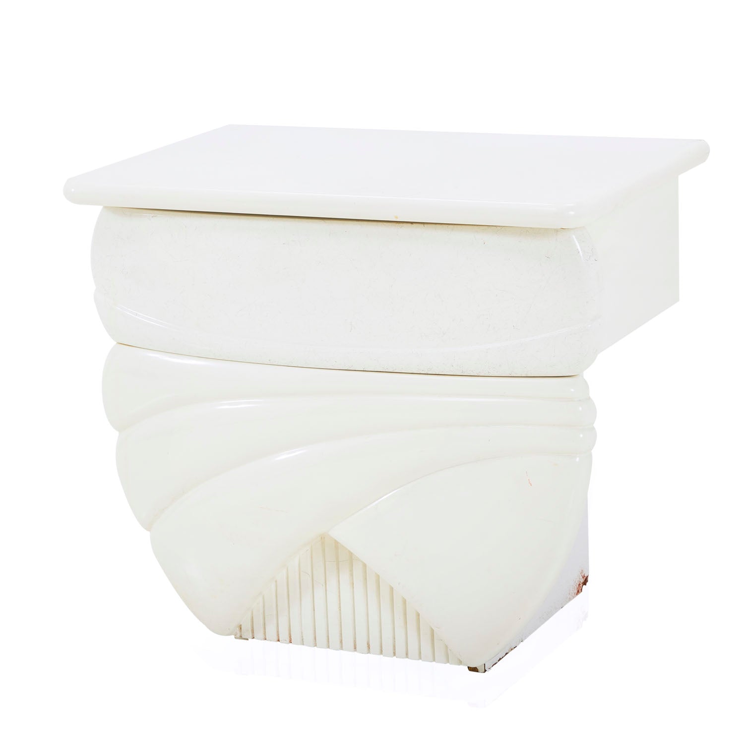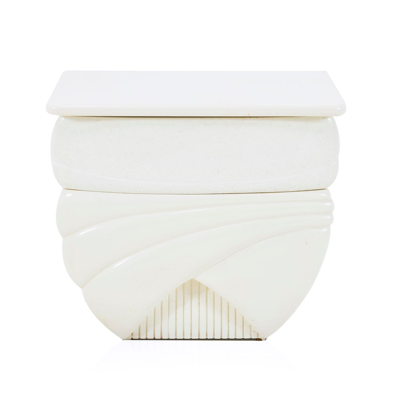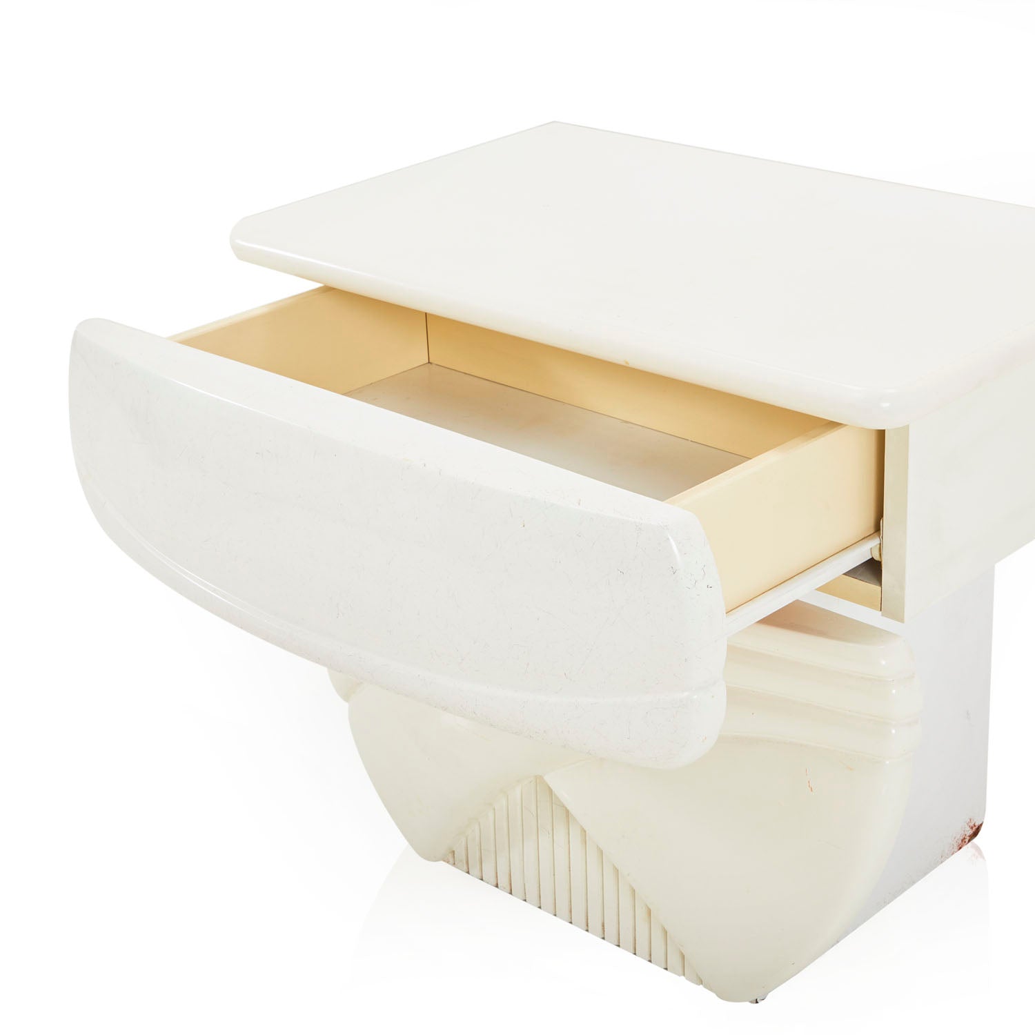 Details: White enamel bedside table with deco style line indentations Dimensions: 21" H x 24" W x 15" D Quantity: 2