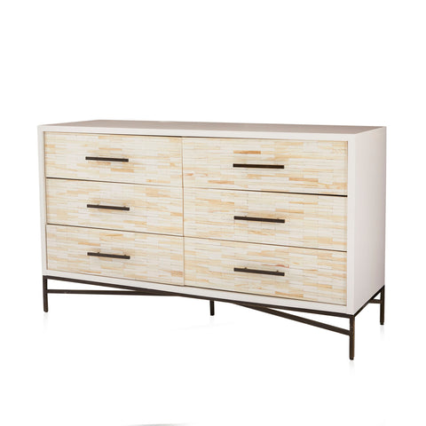 Details: Cream modern dresser with six drawers, mosaic yellow tile decoration, and black metal frame and handles Dimensions: 33" H x 54" W x 18.5" D ...