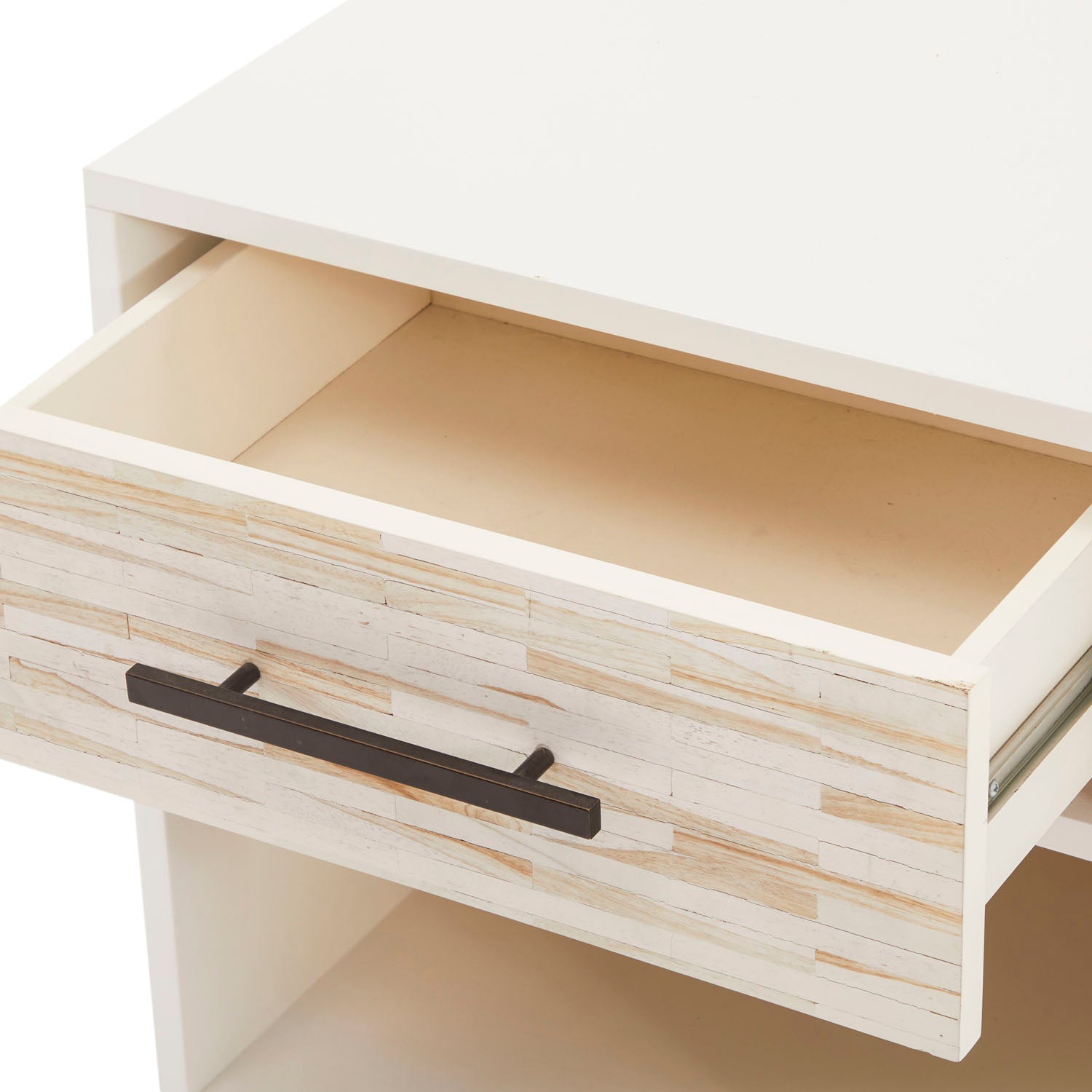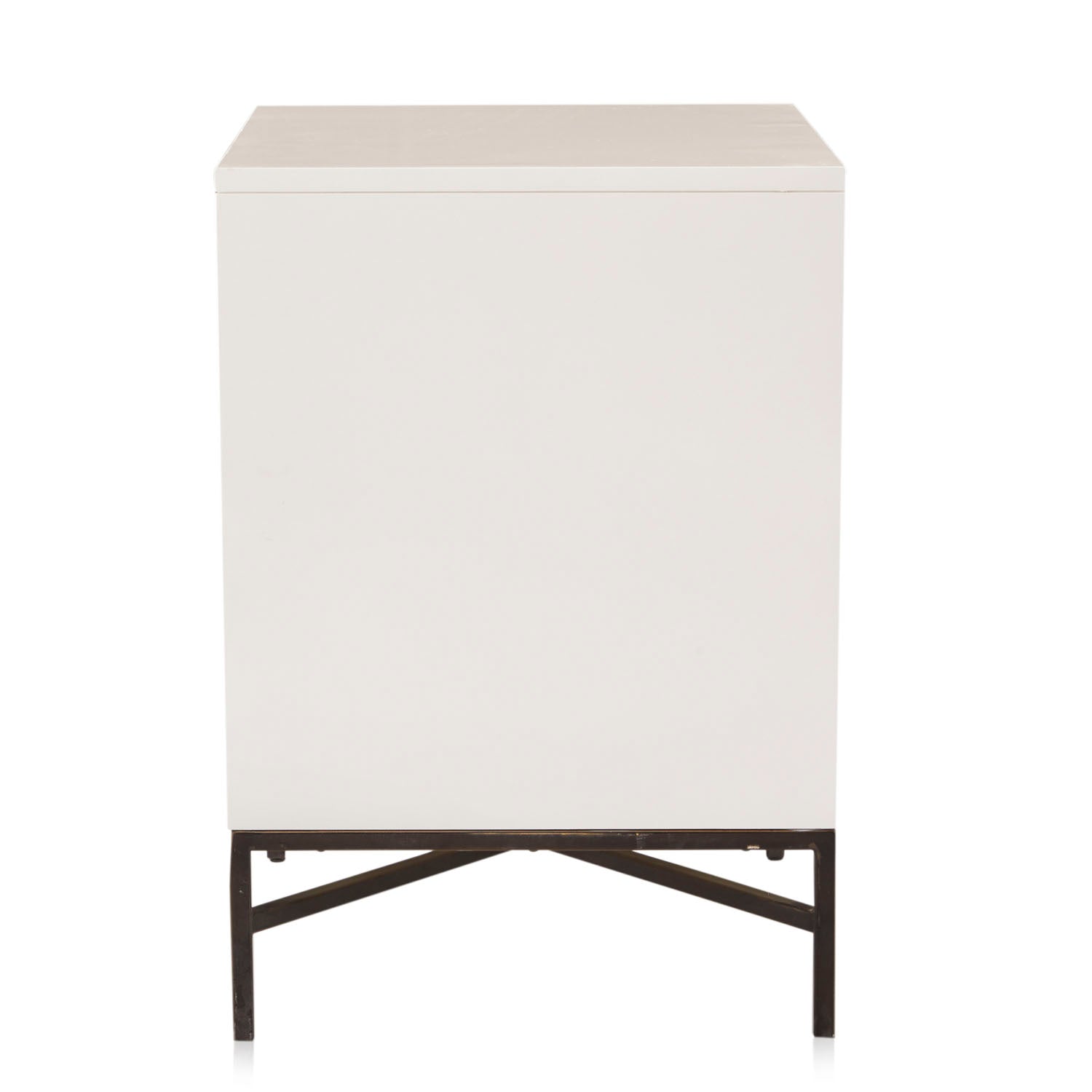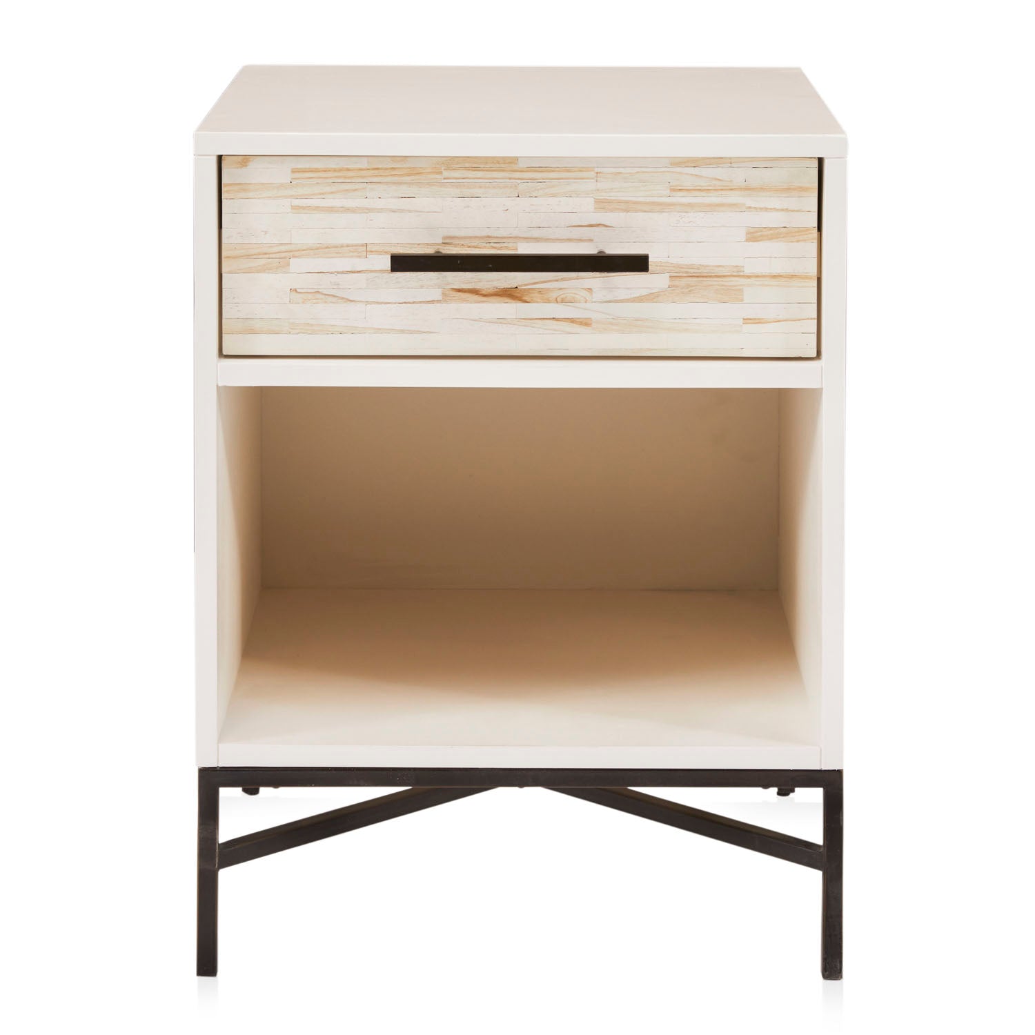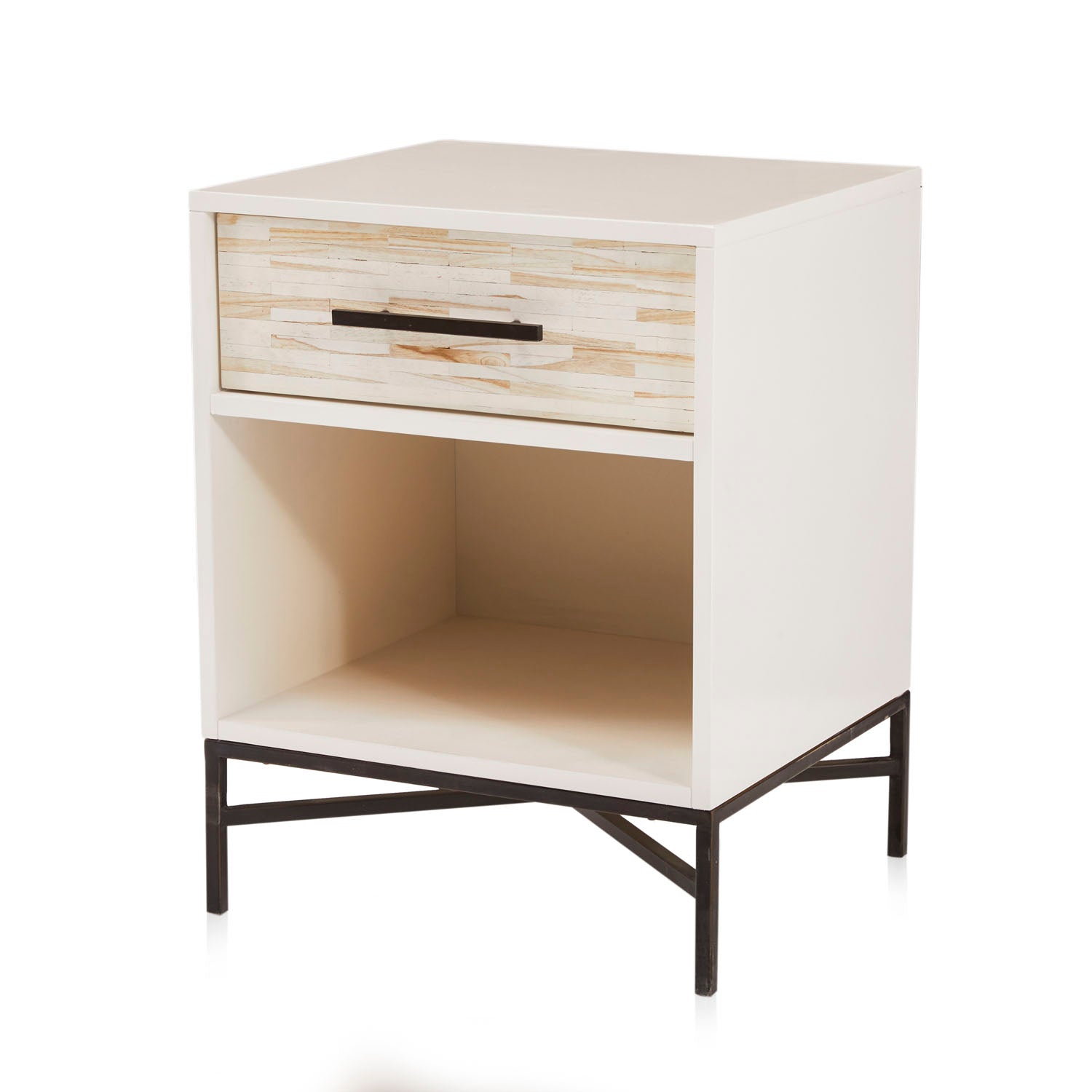 Details: Cream Modern Mosaic Bedside Table, 1 drawer, black metal base Dimensions: 26" H x 20" W x 18" D Quantity: 2