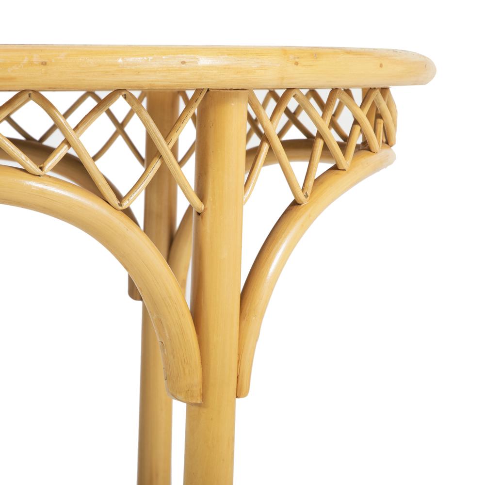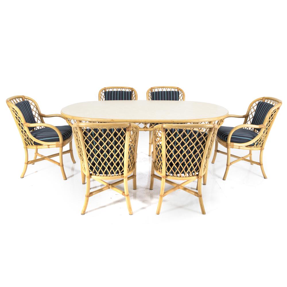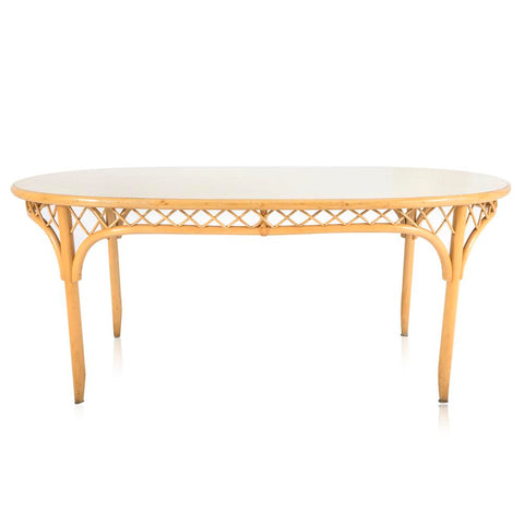 Details: Rattan outdoor table with cross hatching and white table top Dimensions: 29.5" H x 70.5" W x 43" D