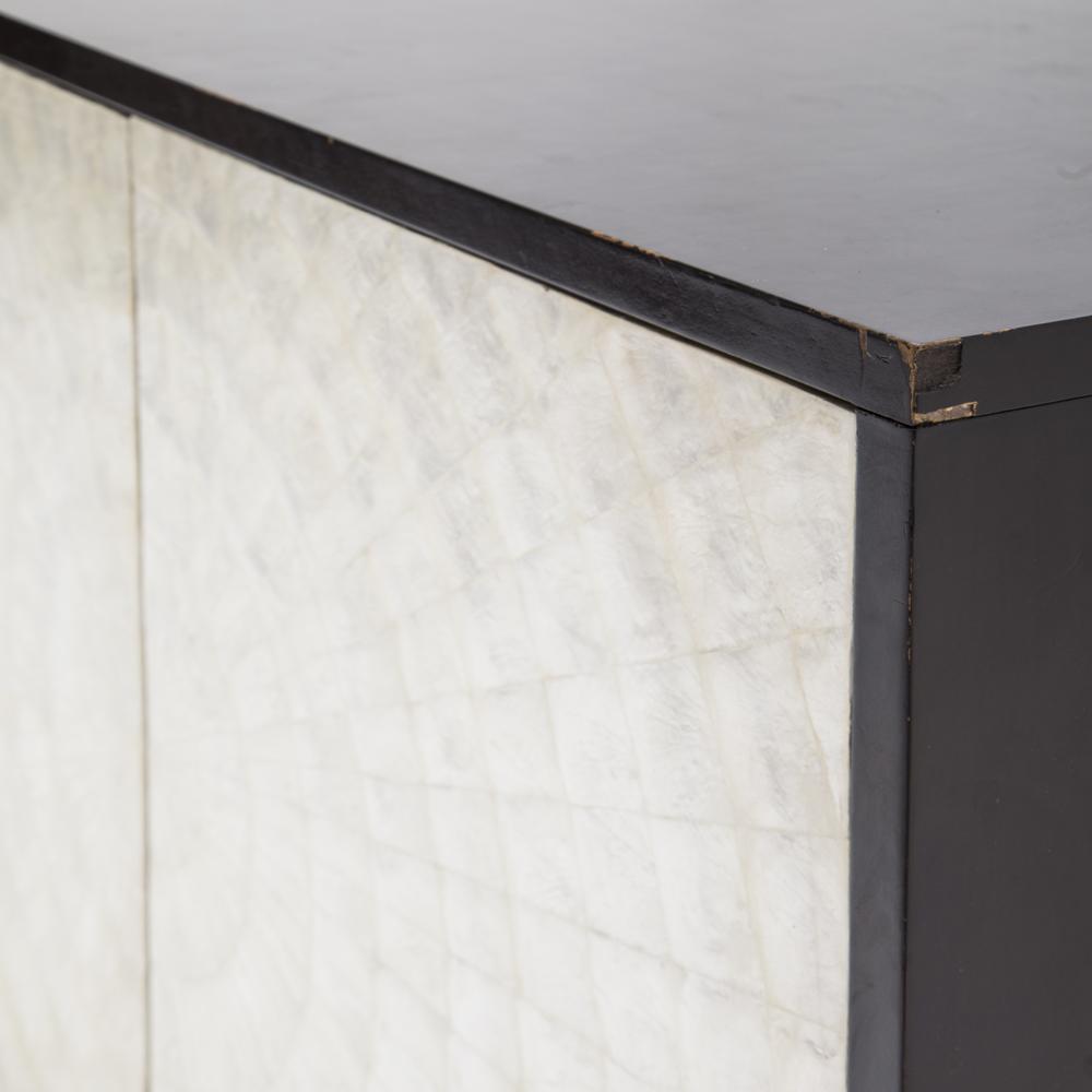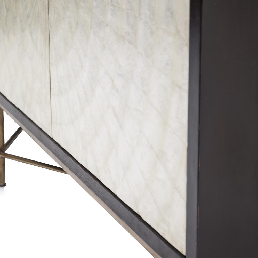 Details: Four panel white pearled credenza with black frame, metal legs Dimensions: 36" H x 82" W x 22" D