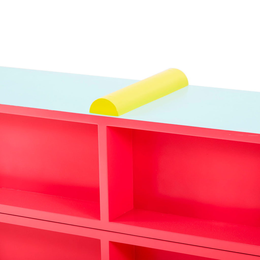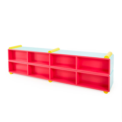 Details: Memphis style pink 8-cubby low long shelf, with yellow and blue painted top Dimensions: 28" H x 96" W x 16" D Quantity: 1
