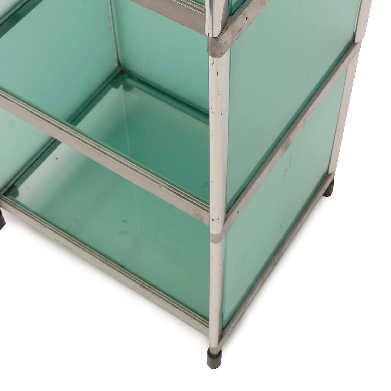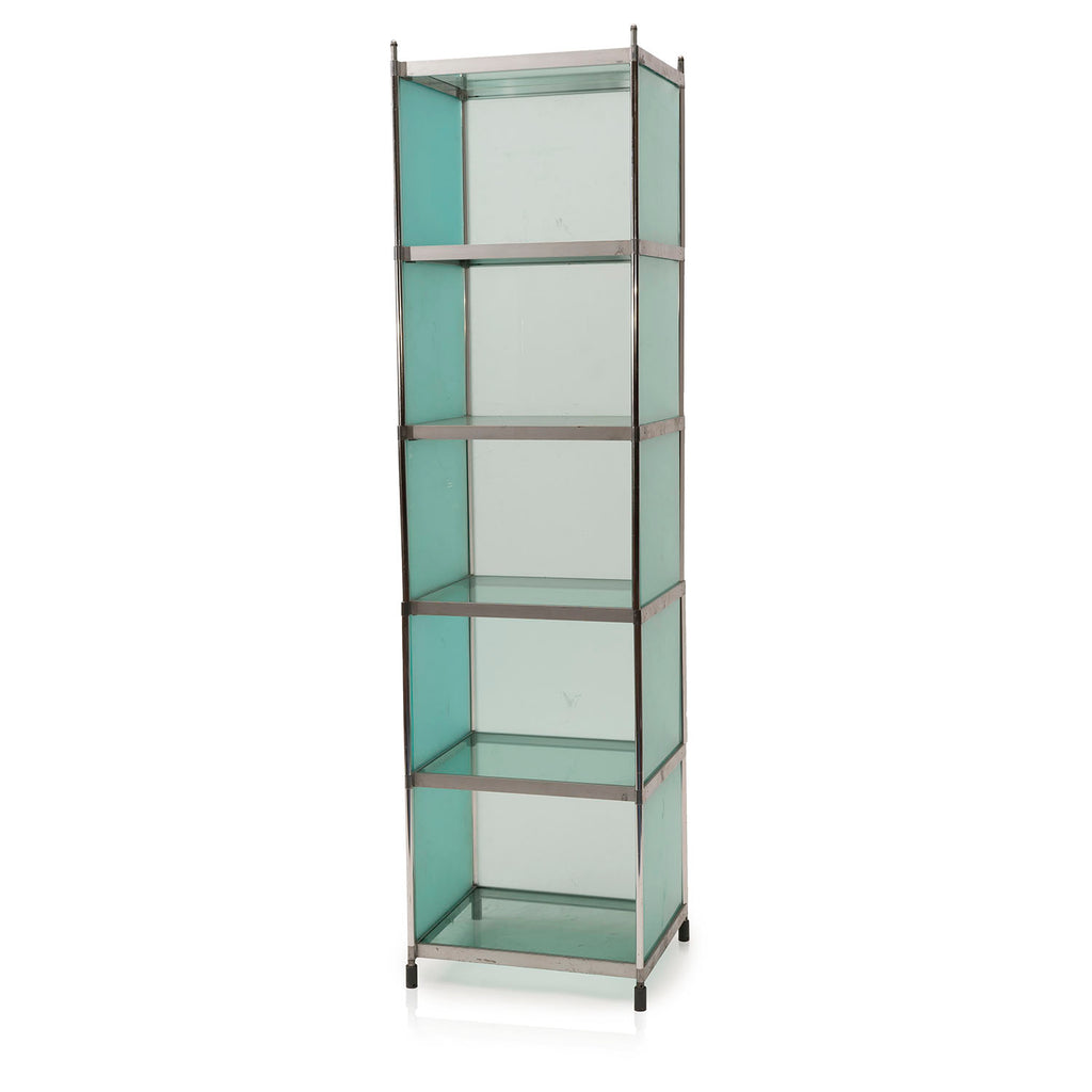 Details: Tinted blue glass sided standing shelving unit with 6x square glass shelves, 5' tall silver metal frame Dimensions: 60" H x 21" W x...