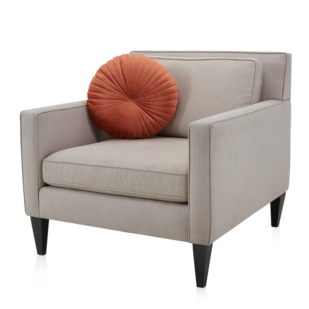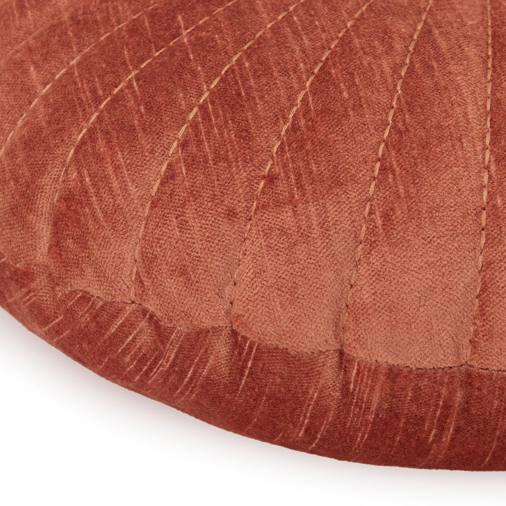 Details: Salmon / orange velvet circular pillow with radial stitching Dimensions: 16" H x 16" W x 6" D Quantity: 1