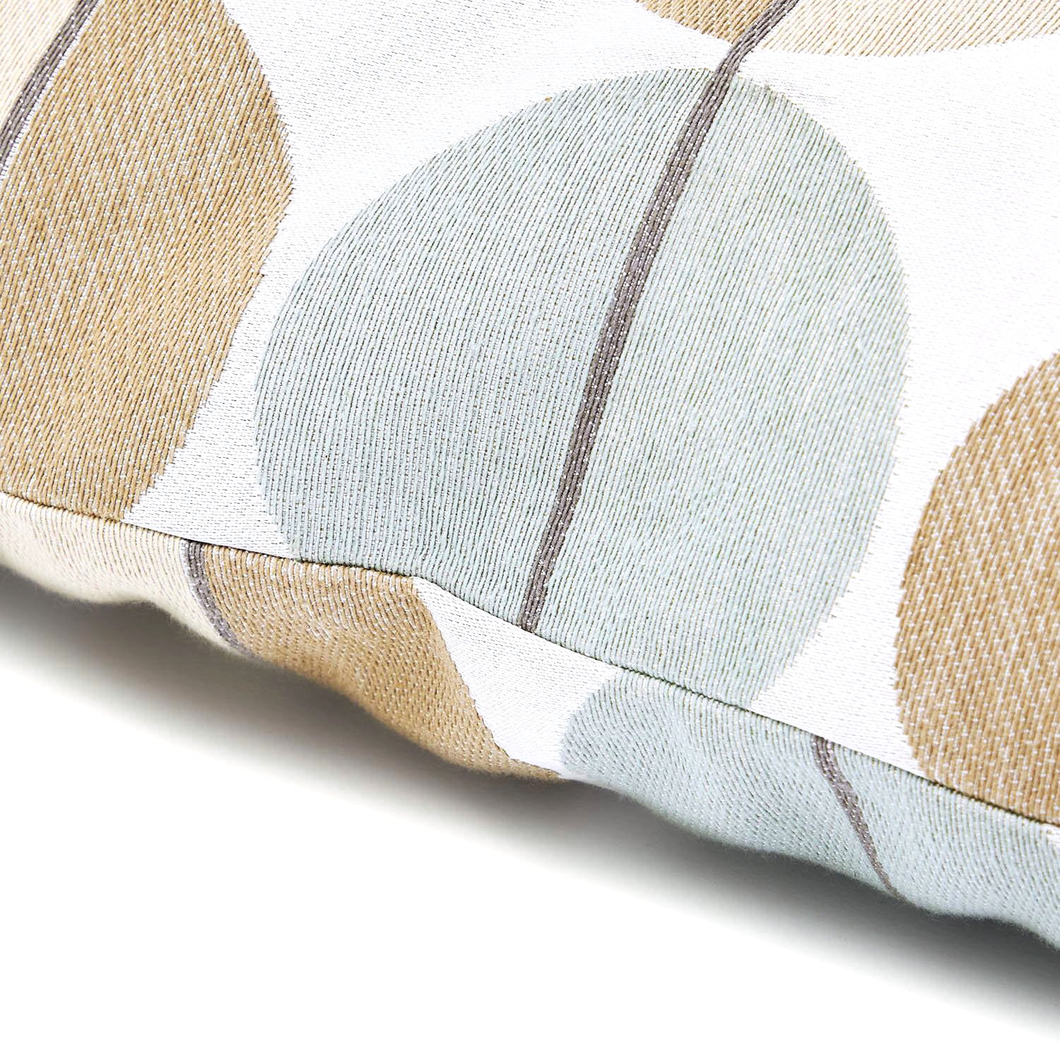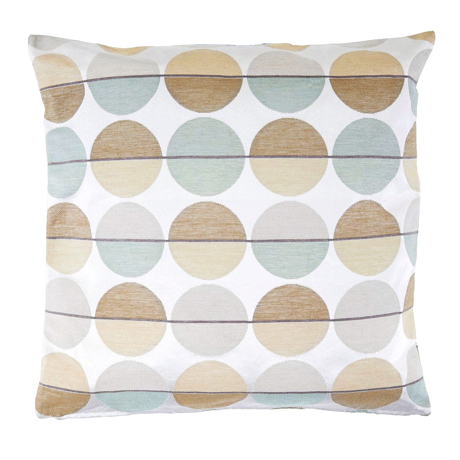 Details: Pillow with bi-color circle pattern design, bisected by black pinstripes