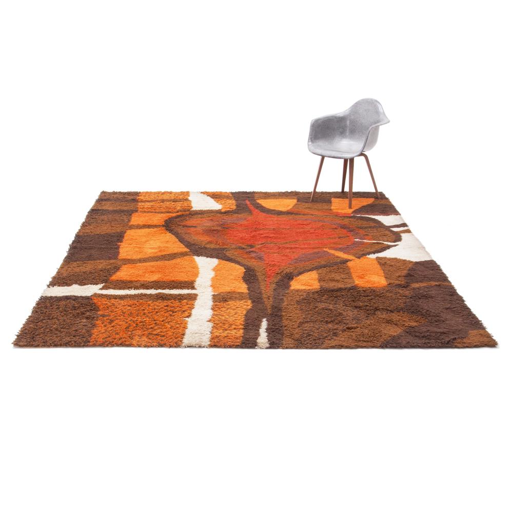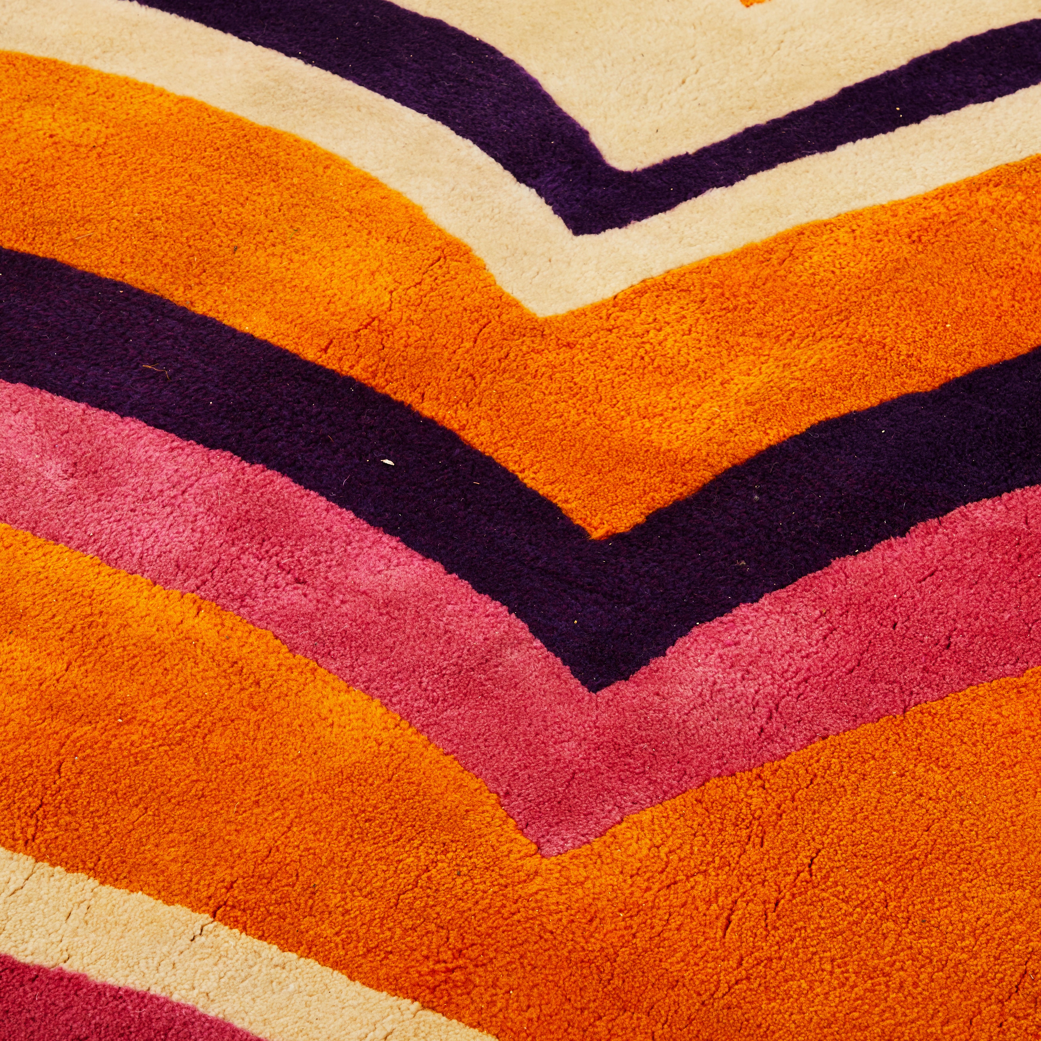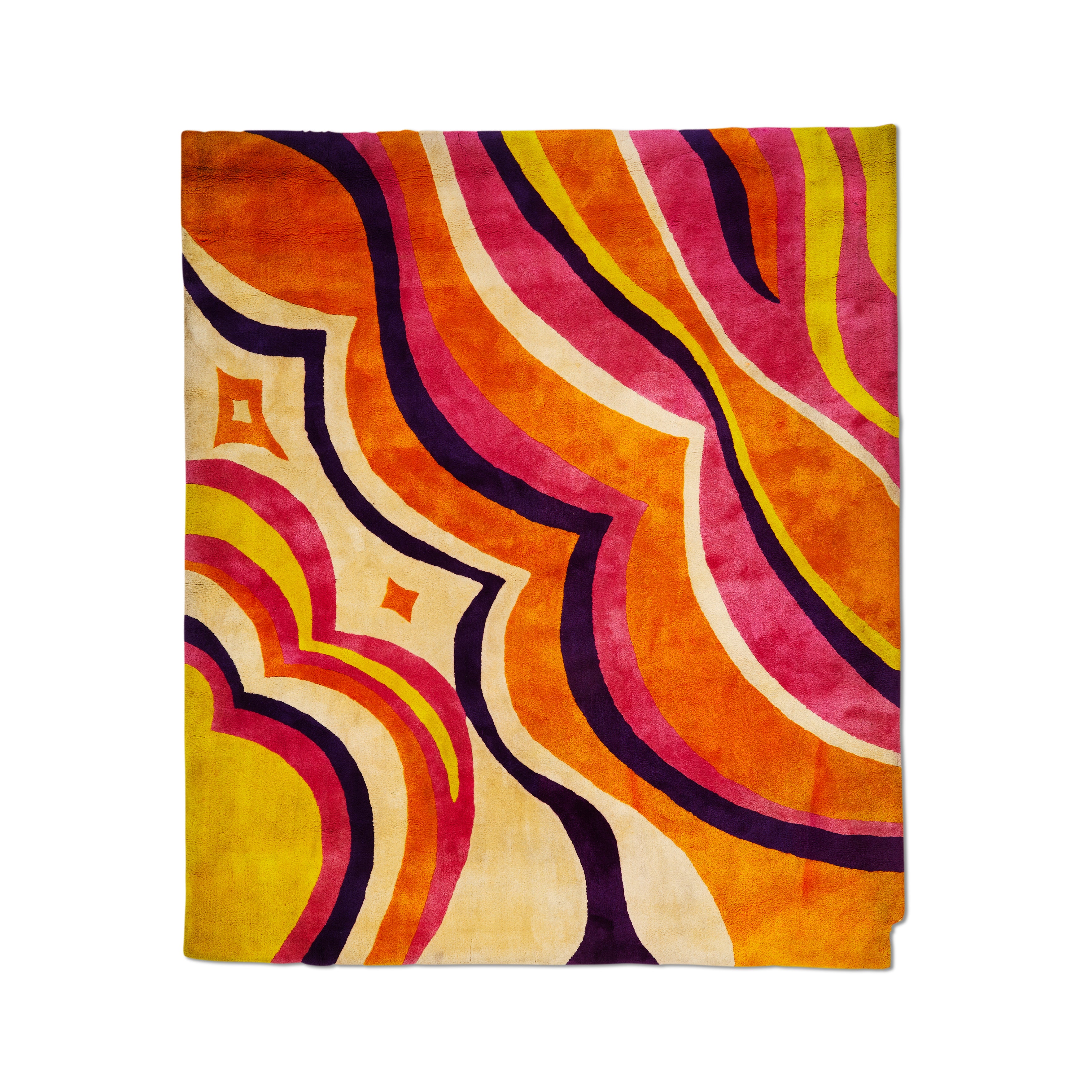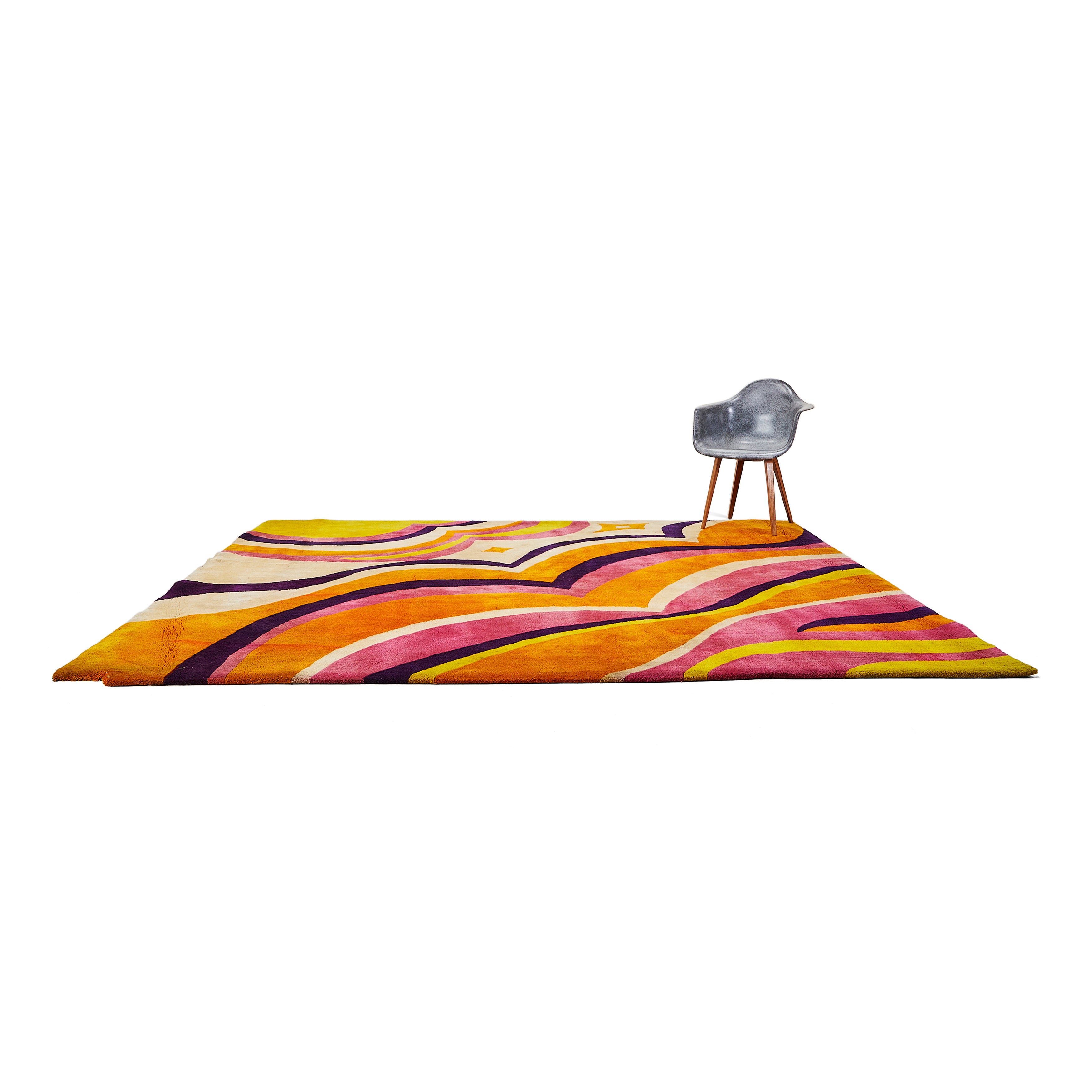Details: Vintage low-pile rug with graphic yellow, pink, purple, orange, and white design and a 60's psychedelia vibe Dimensions: 102" W x 120" D Quantity: 1...