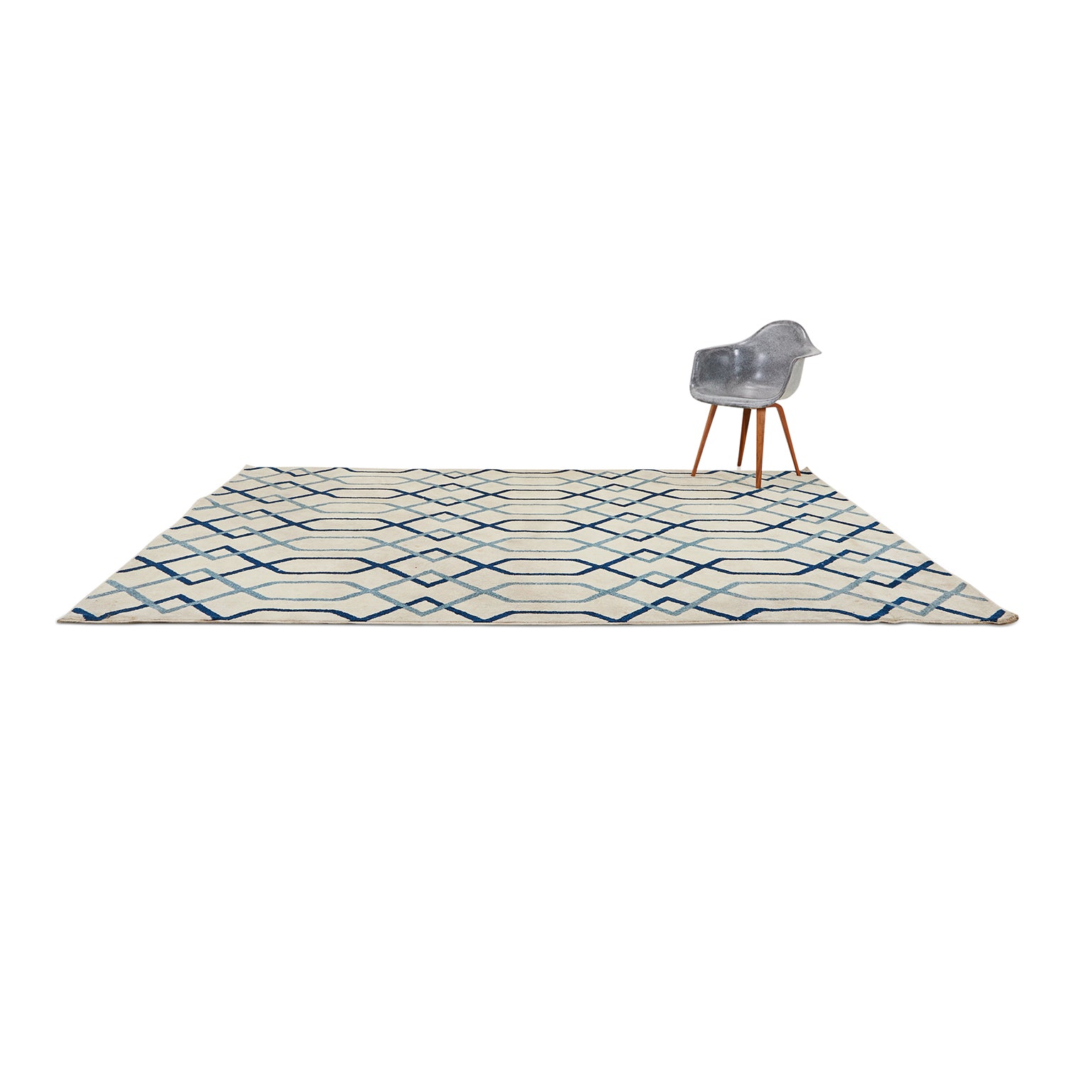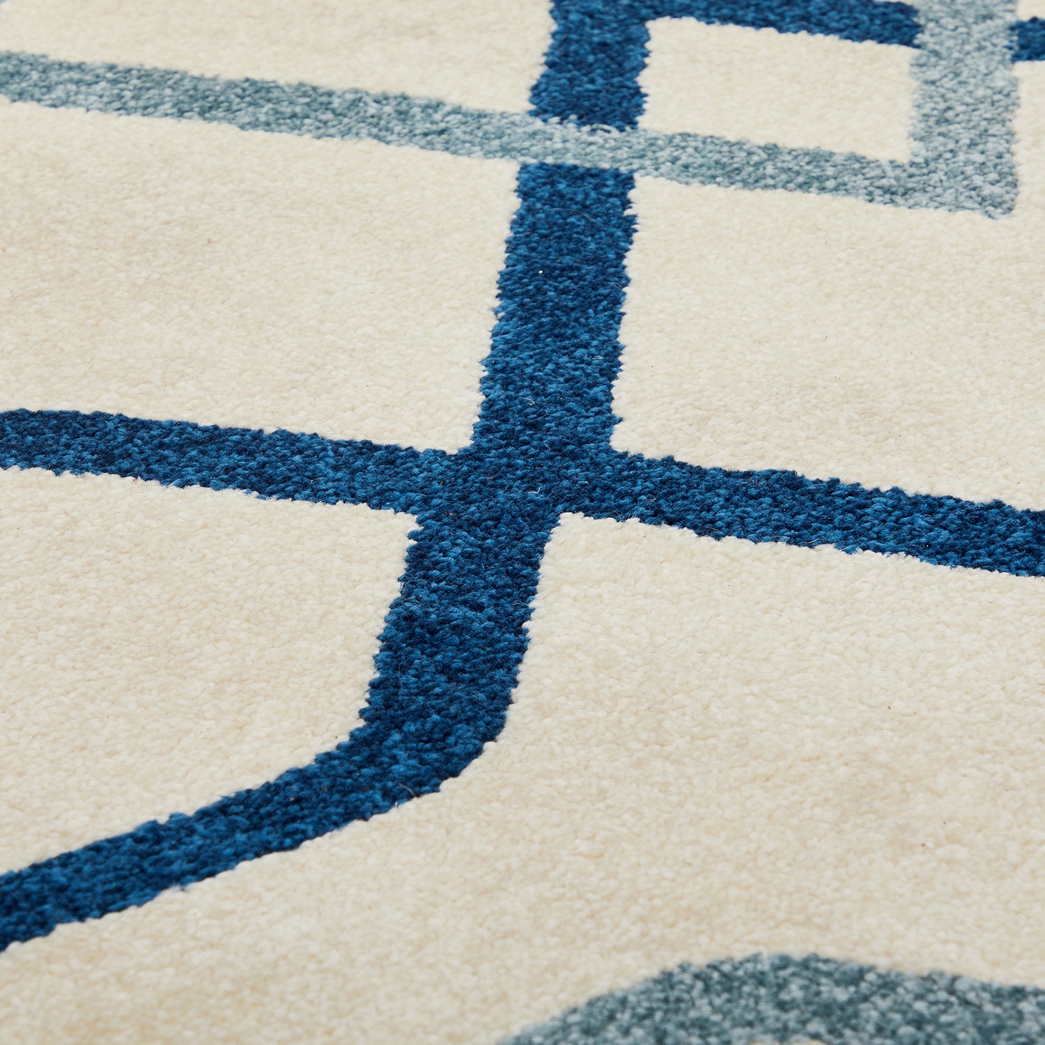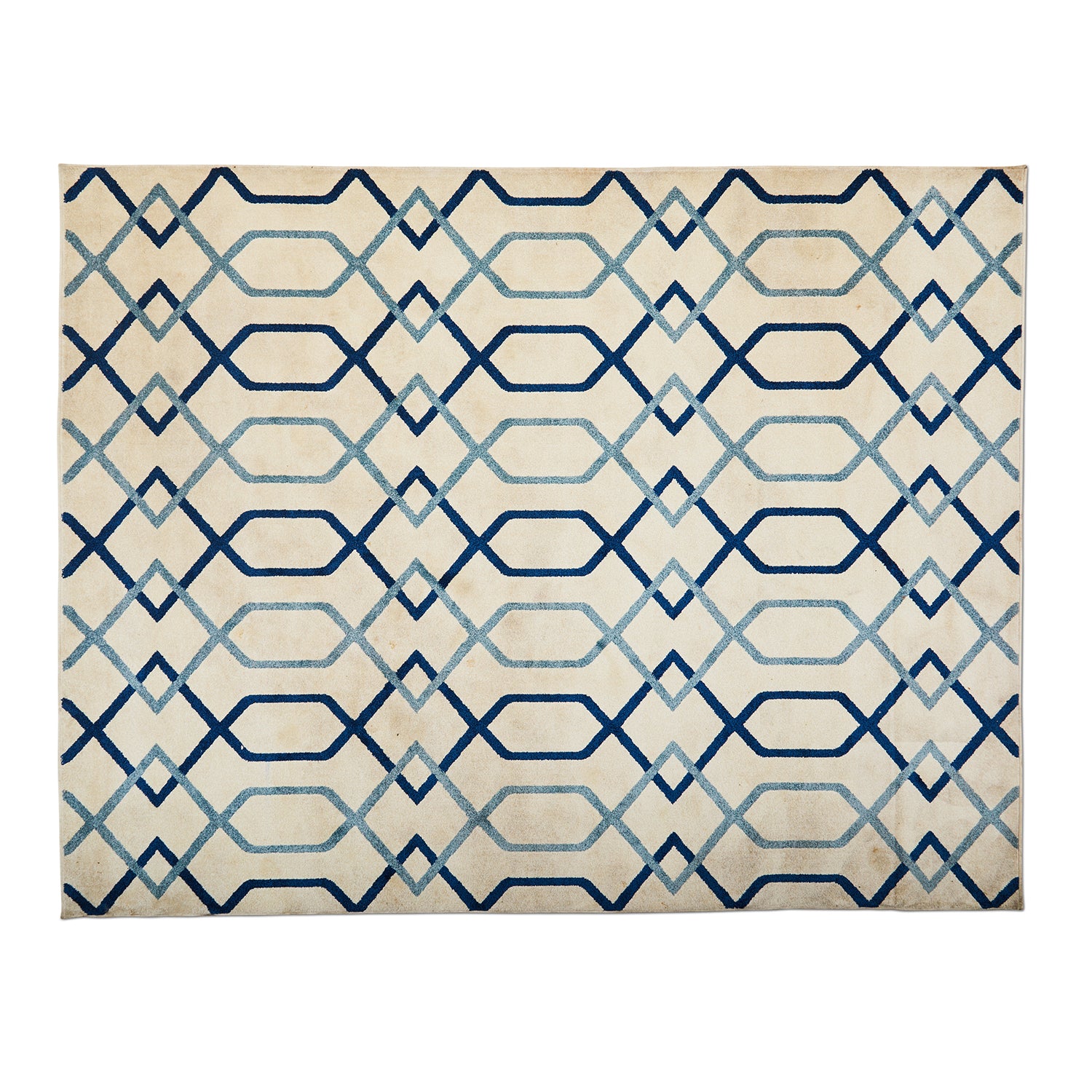Details: Off-white rug with a pattern of light blue and navy intersecting zig-zag lines Dimensions: 121" L x 95" W Quantity: 1