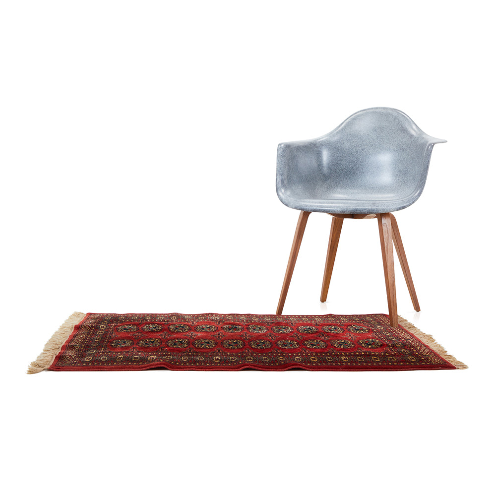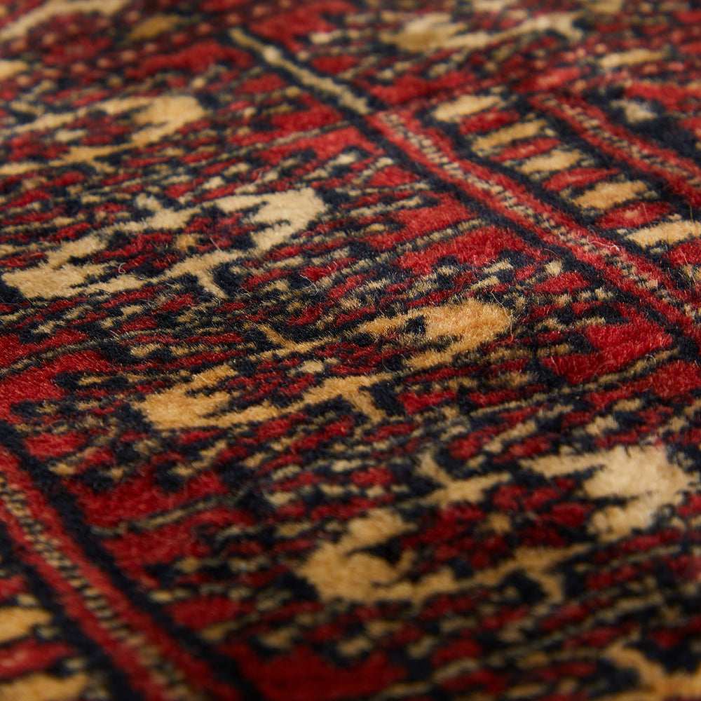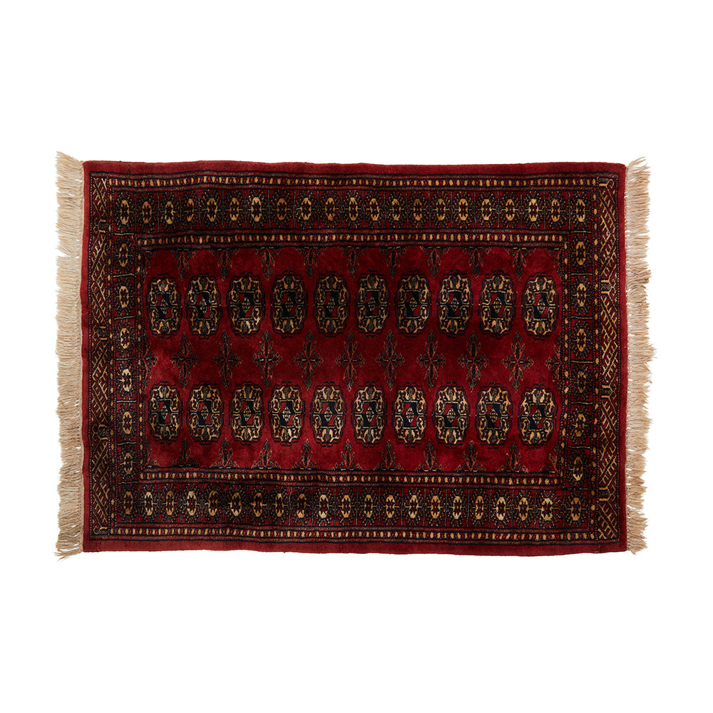Details: Deep red and black Persian style rug with tan tassels, small size