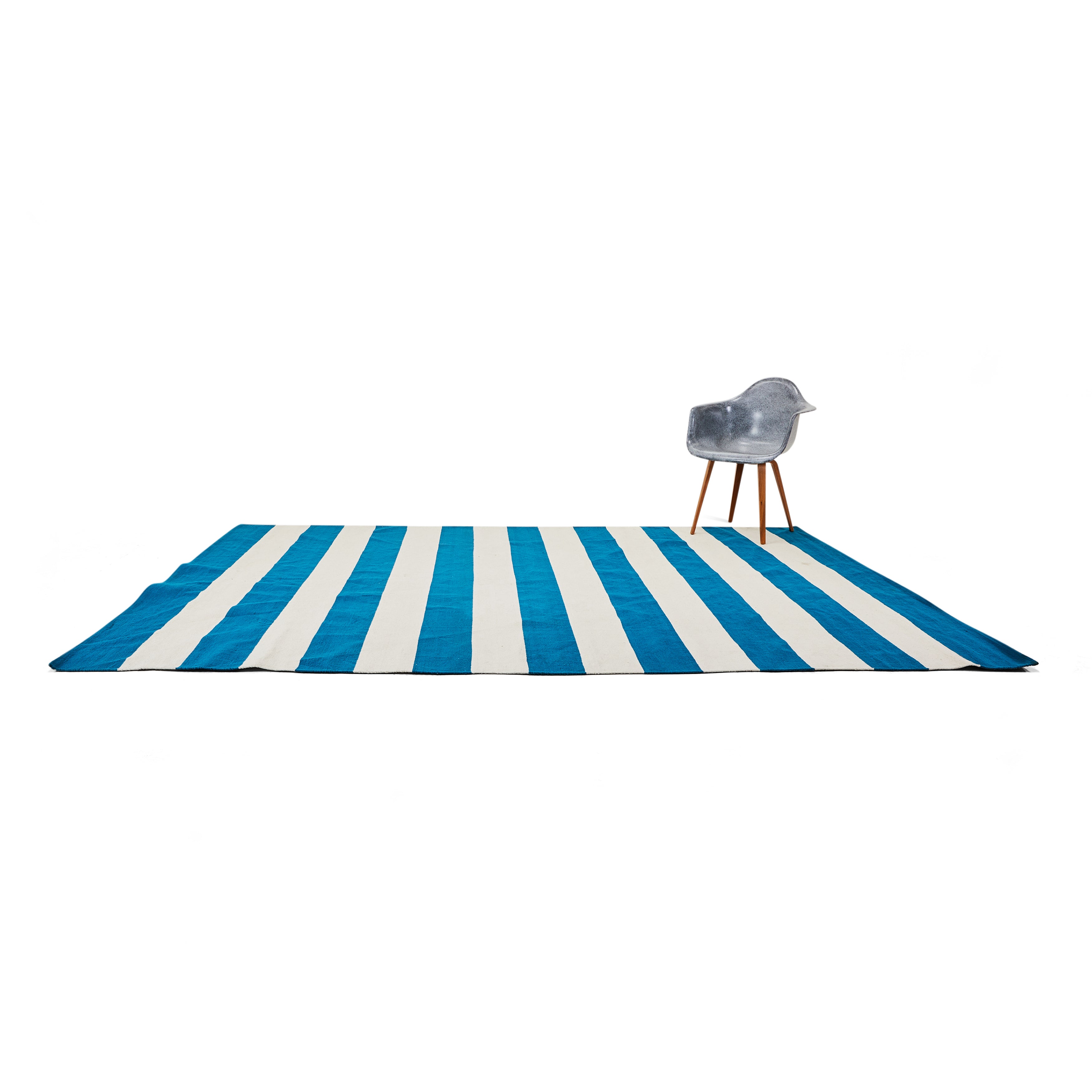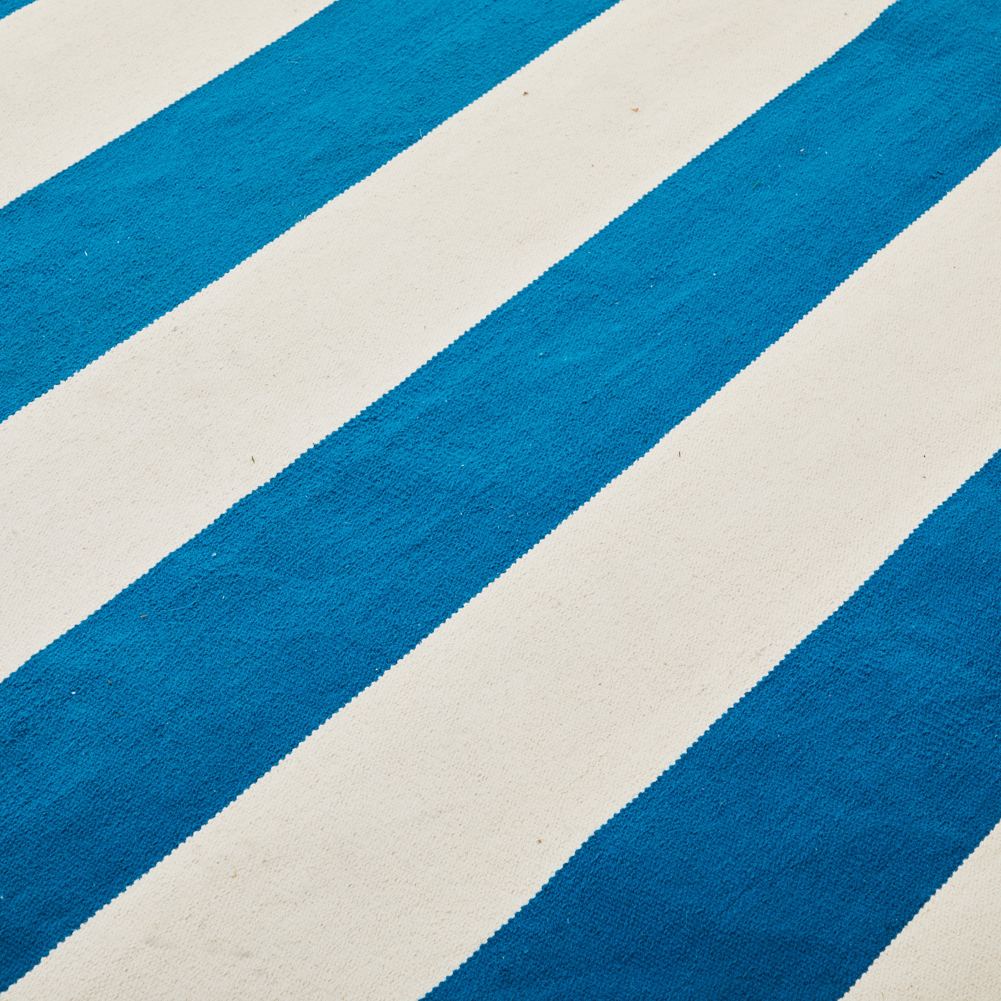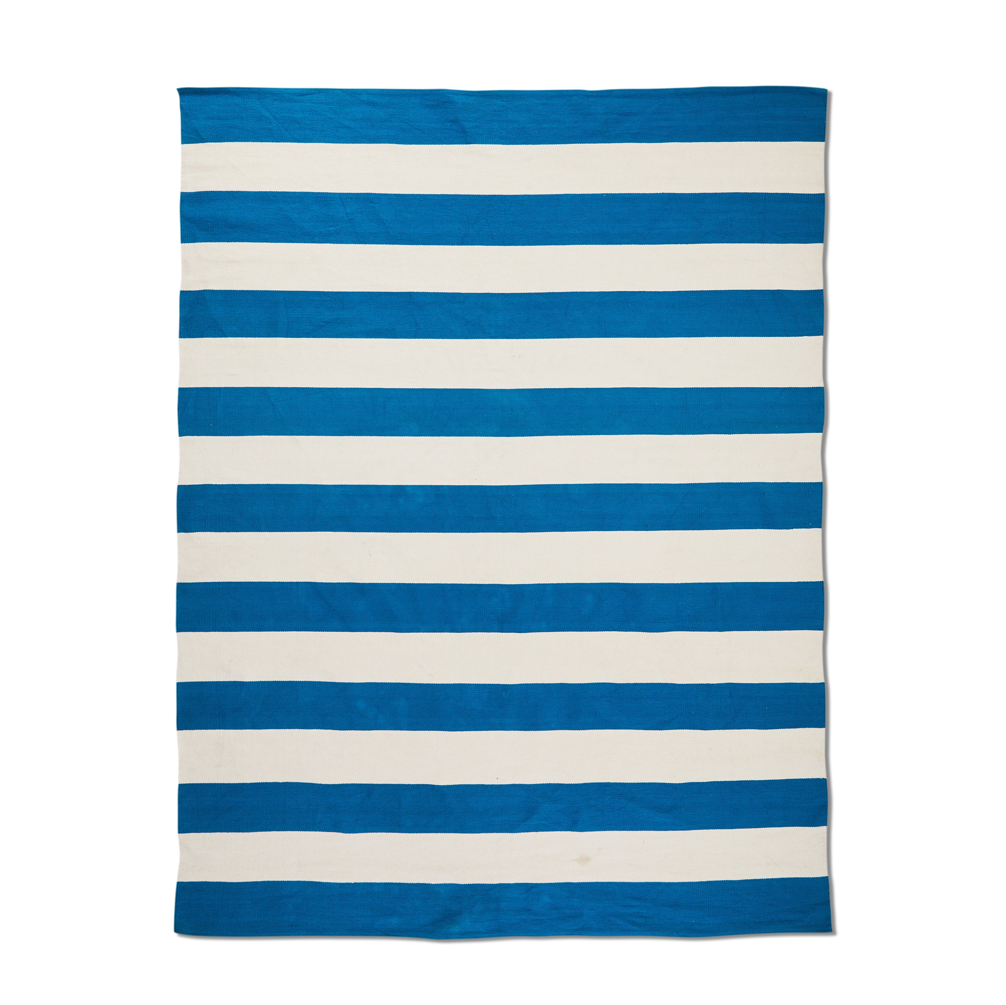 Details: Large rug with wide bright blue and white stripes Dimensions: 96" x 120" Quantity: 1