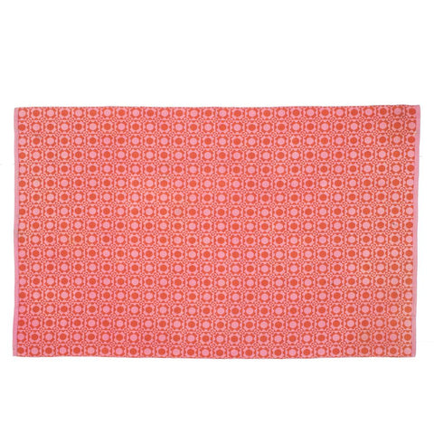 Details: Red low pile rug with white squiggle lines Dimensions: 66" x 91"