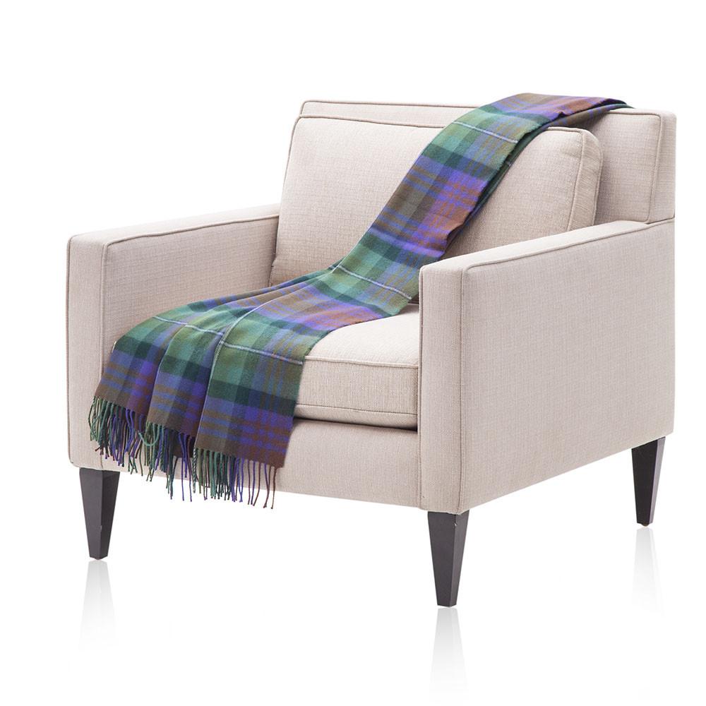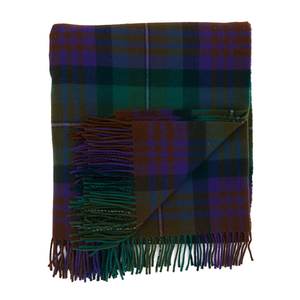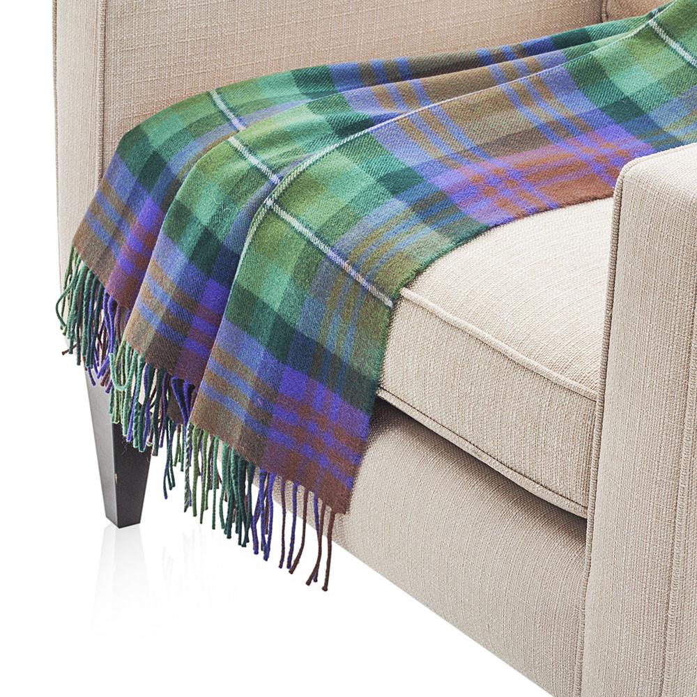 Details: Blue, green, and purple plaid throw. Dimensions: 40" H x 30" D
