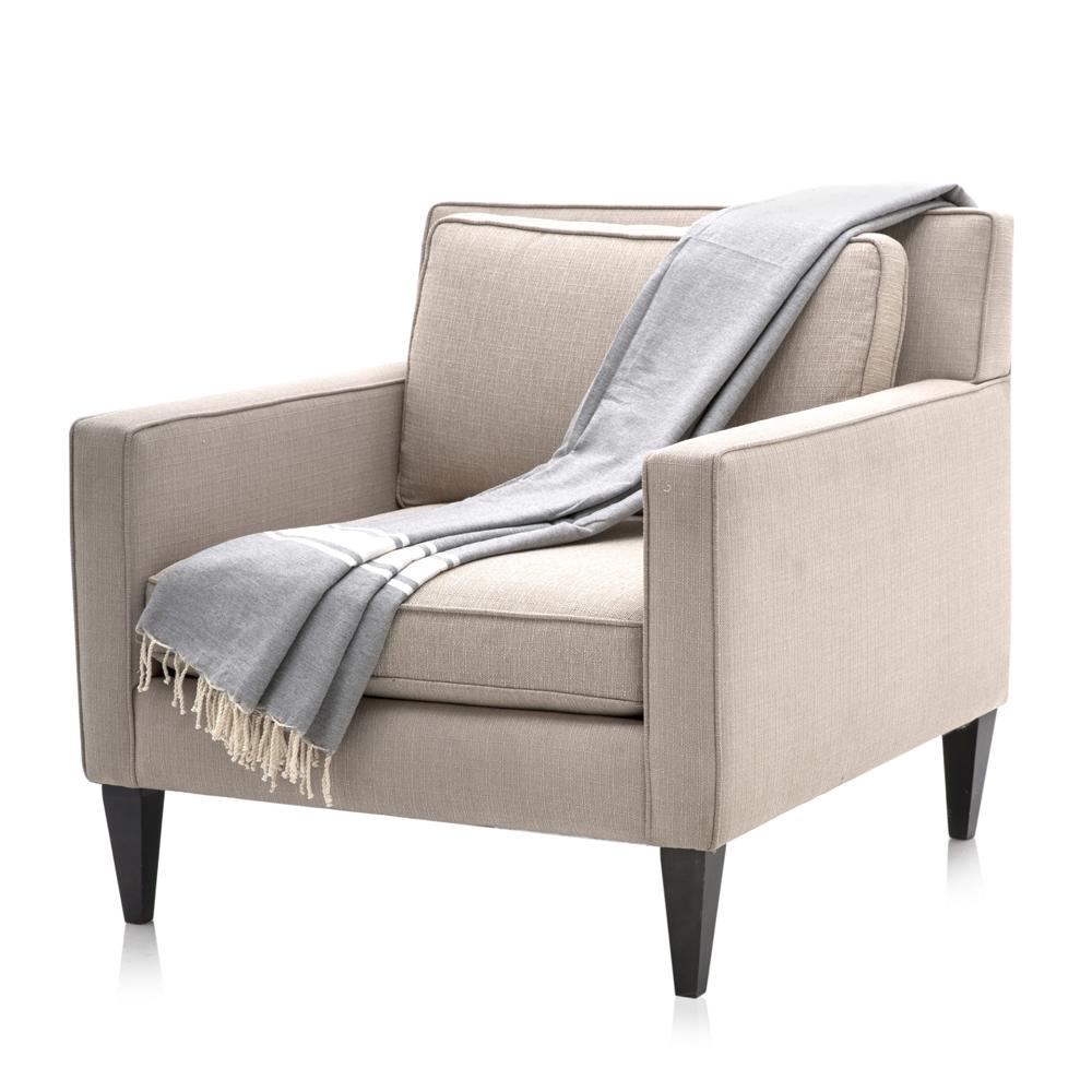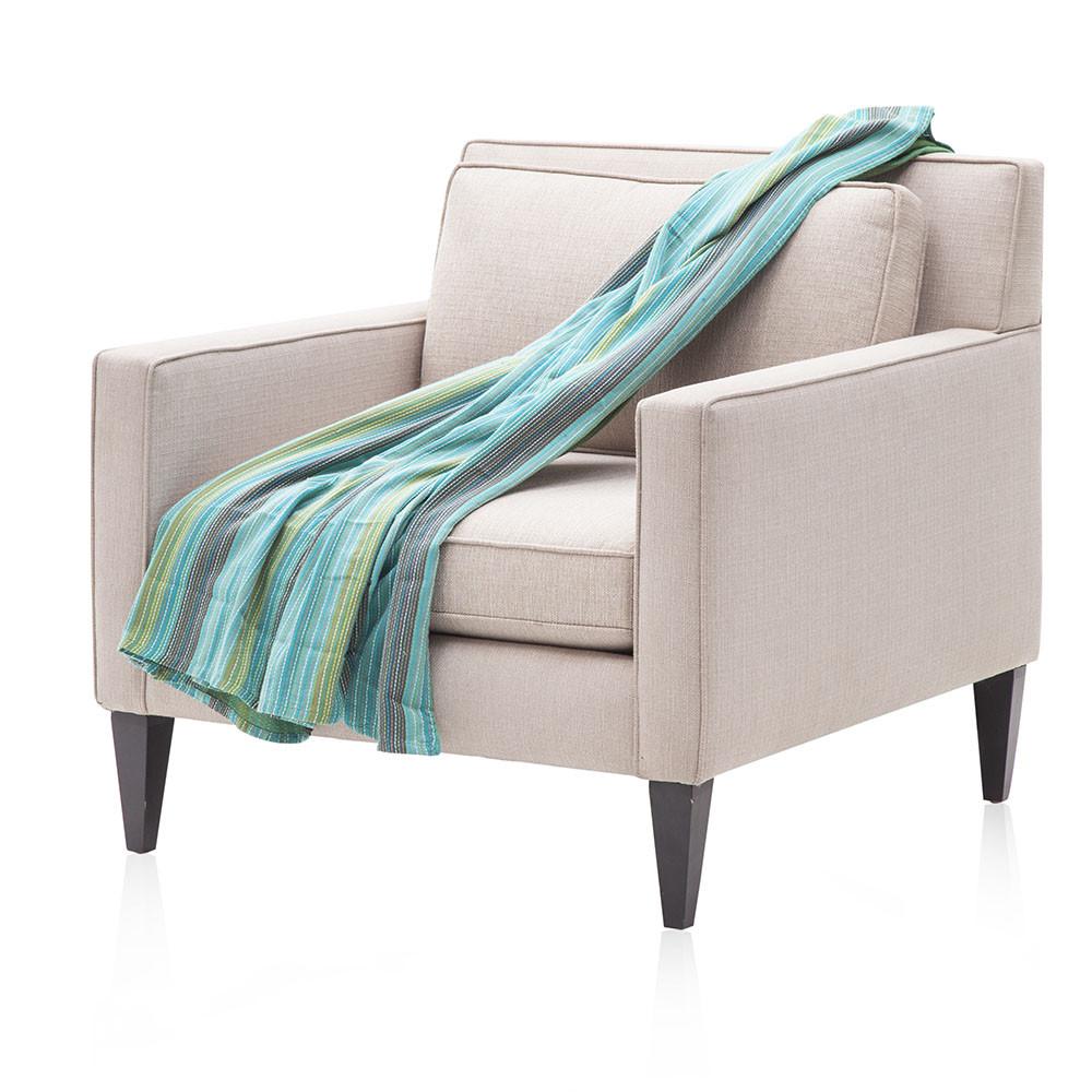 Details: White throw blanket with black diagonal stripes of various sizes across.