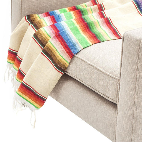 Details: Mexican Falsa Blanket, Multicolored, White Fringe Dimensions: 47" W x 78" Long
