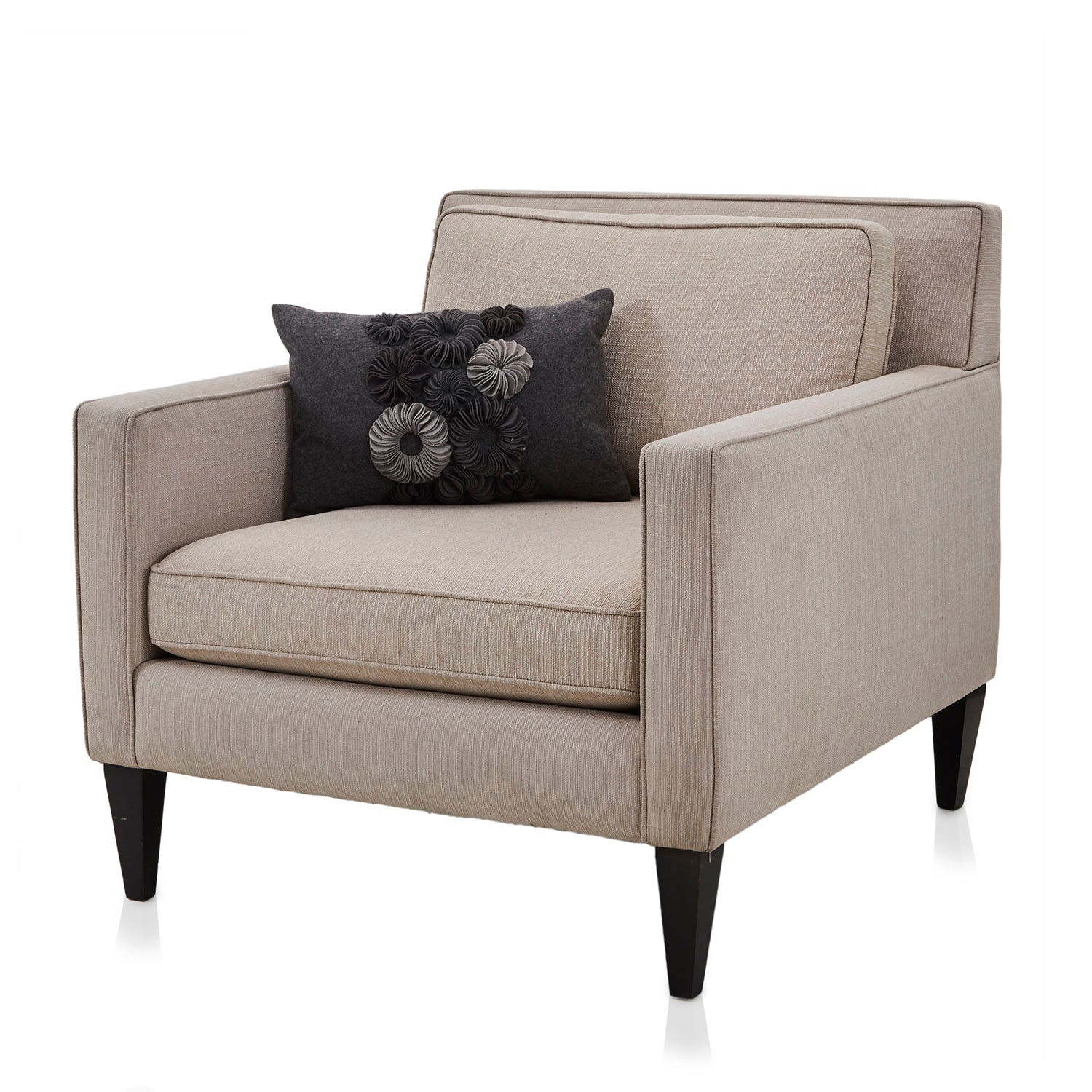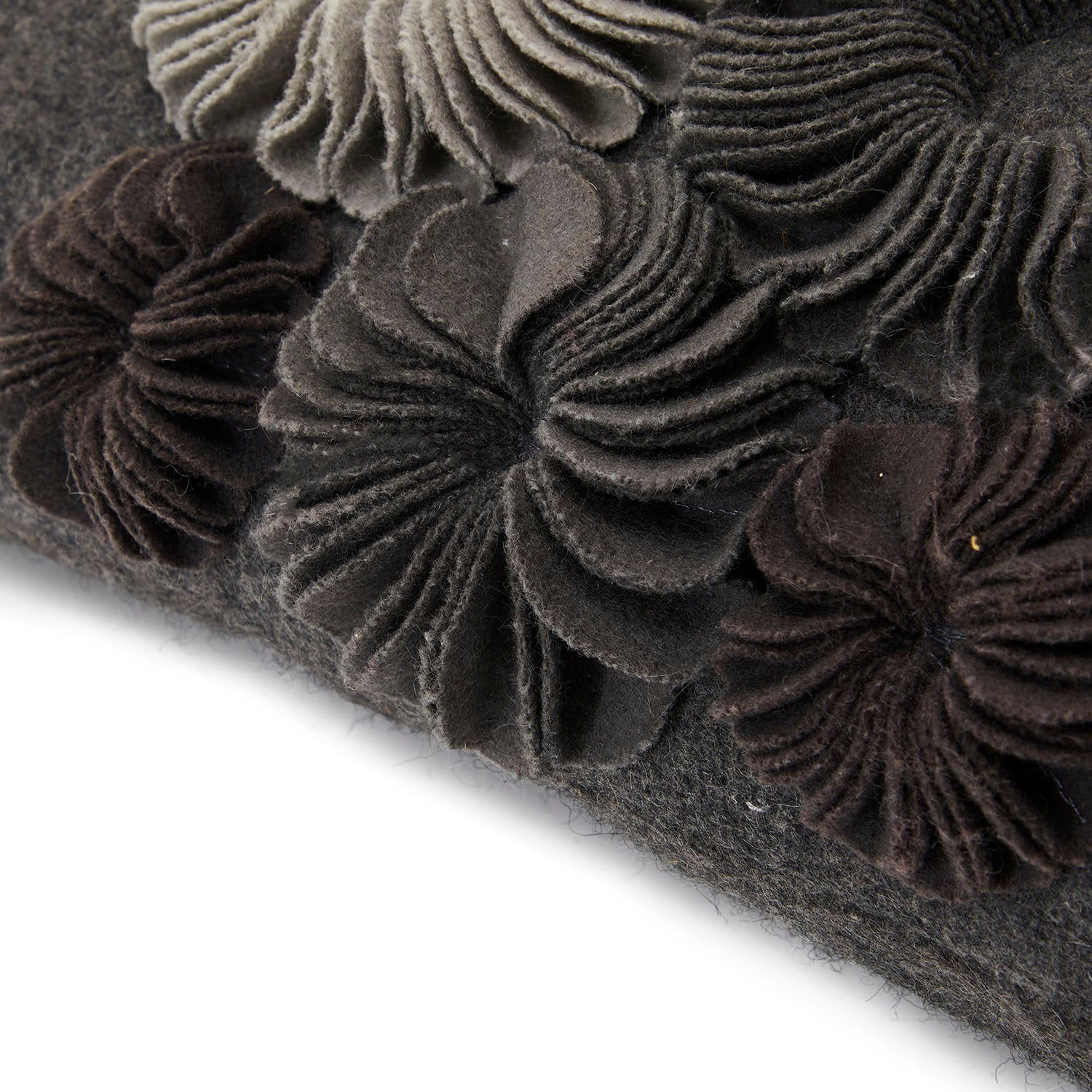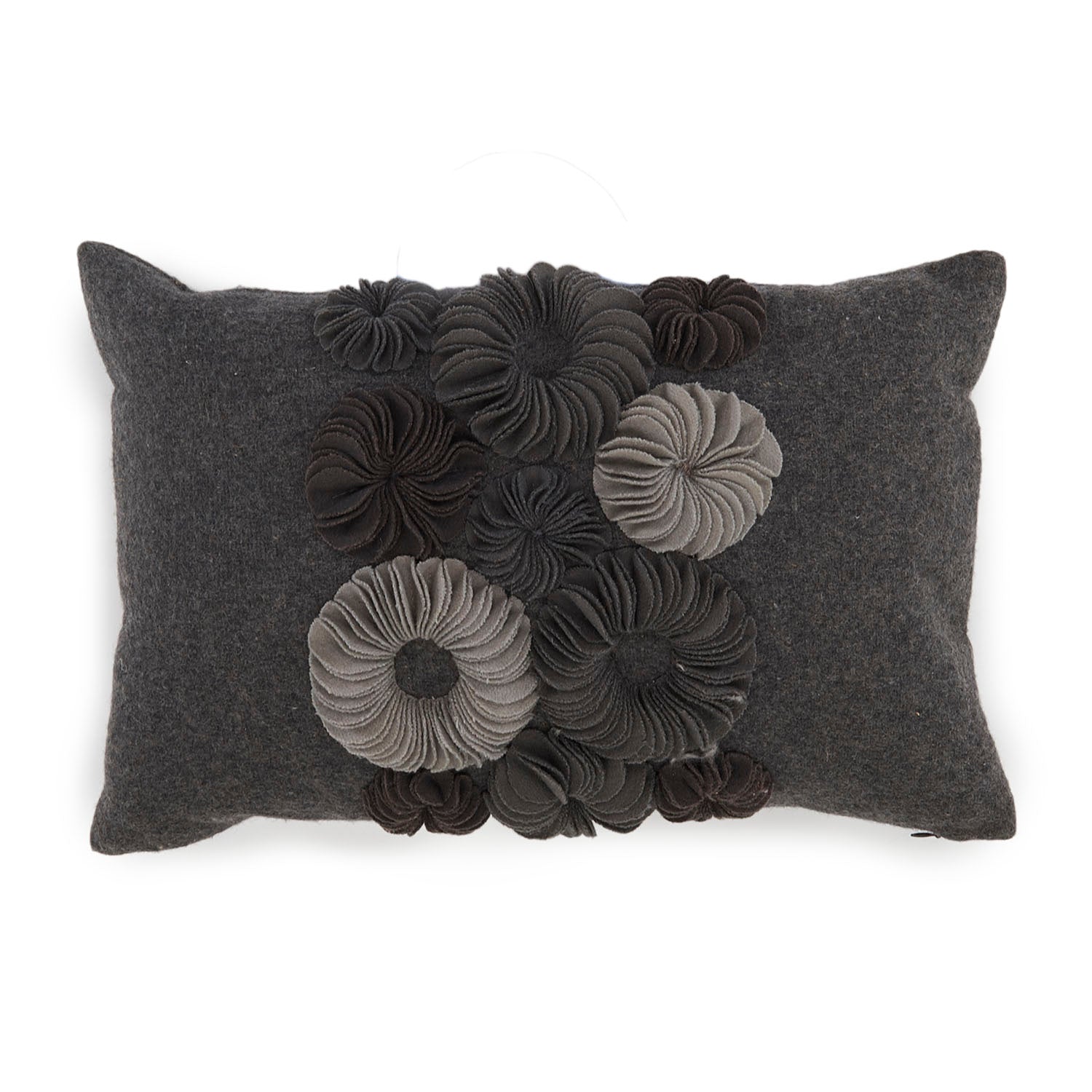 Details: Grey rectangular decorative pillow with sculptural grey felt flowers in varying tones Dimensions: 11" H x 17" W x 6" D Quantity: 2