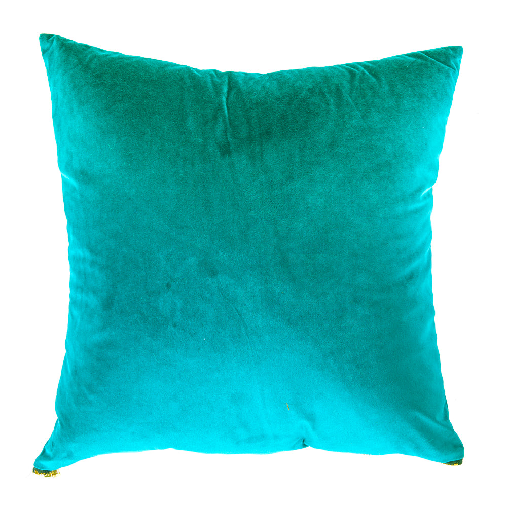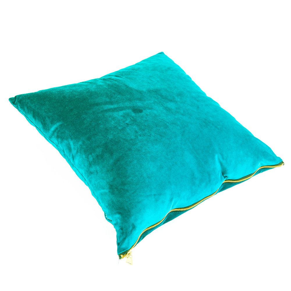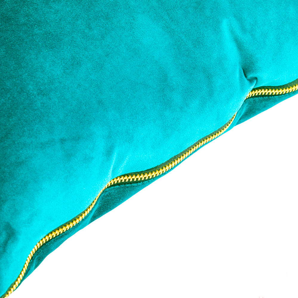 Detail: Cyan colored velvet pillow with yellow zipper Dimensions: 18" H x 19" W x 6" D Quantity: 1