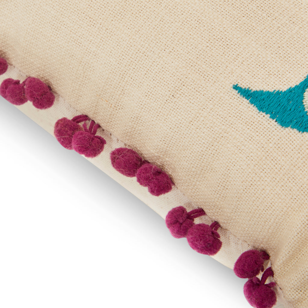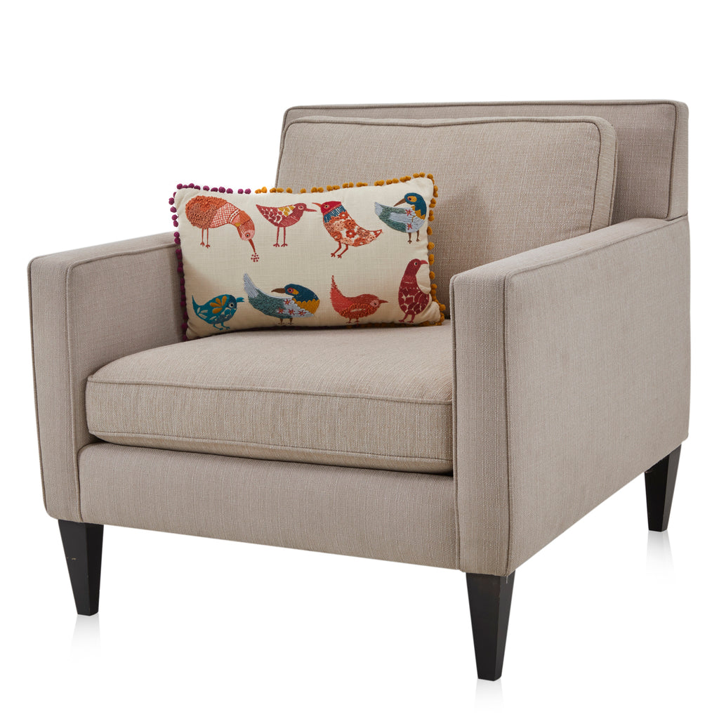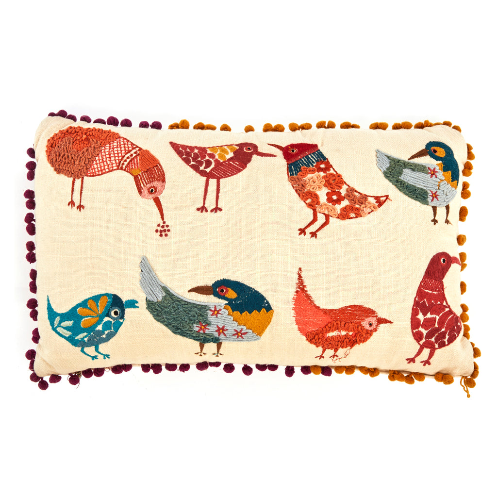 Details: Tan lumbar pillow with various multicolored embroidered birds and purple and orange tassels Dimensions: 11" H x 18" W x 5" D Quantity: 1