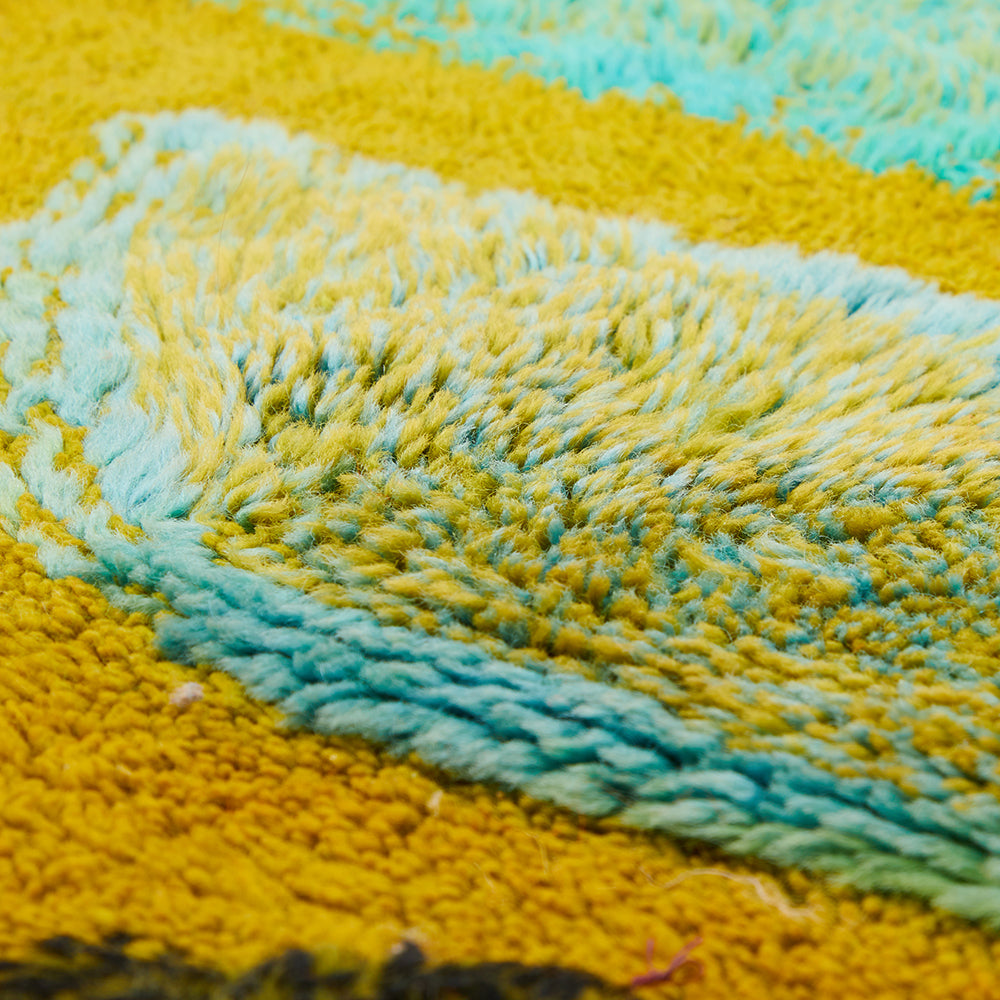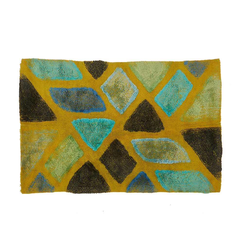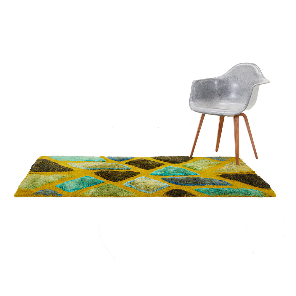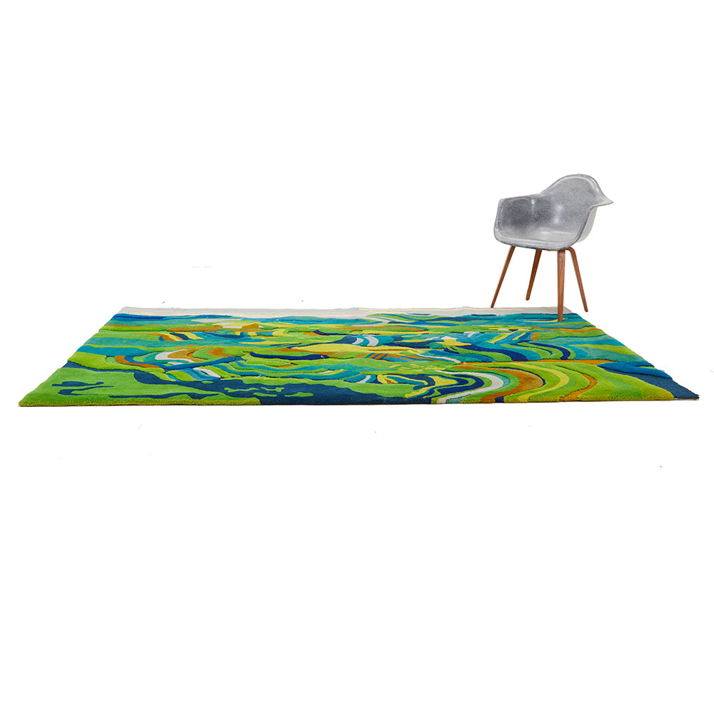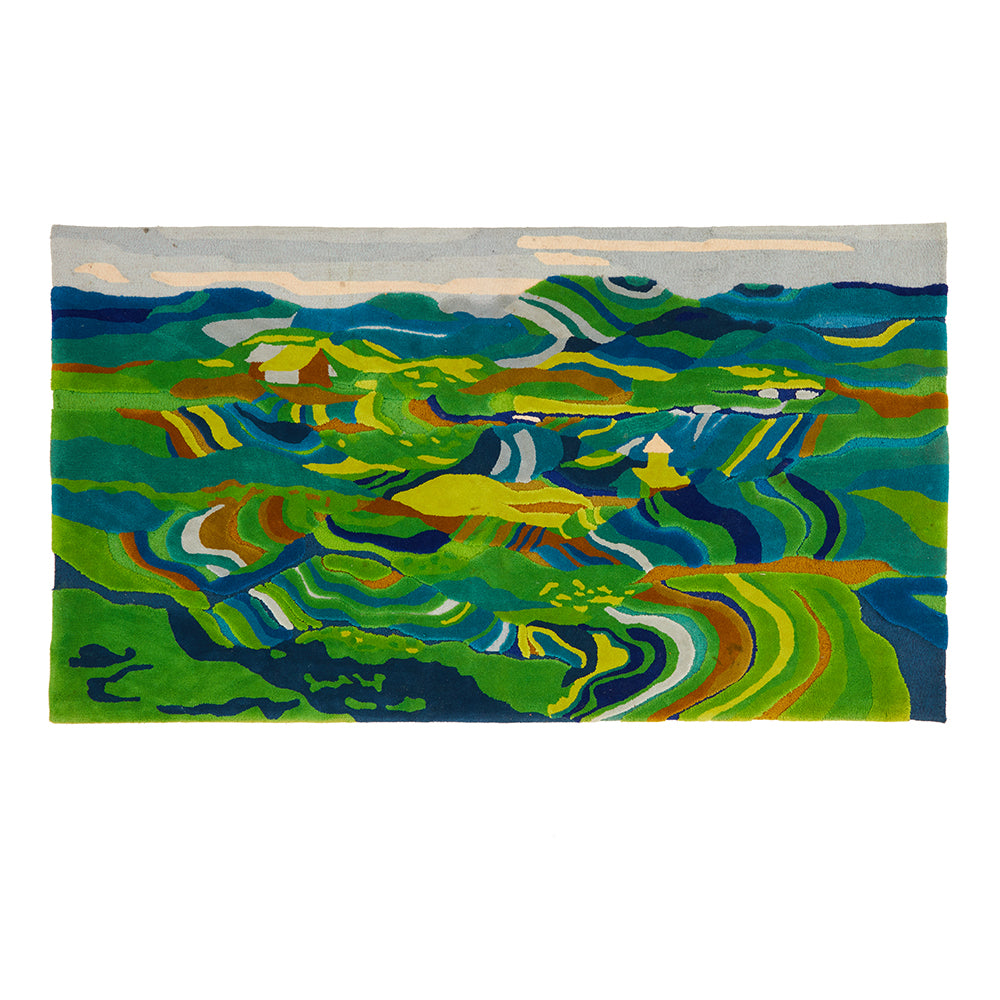 Details: Blue and green rug with landscape design Dimensions: 108" W x 60" D