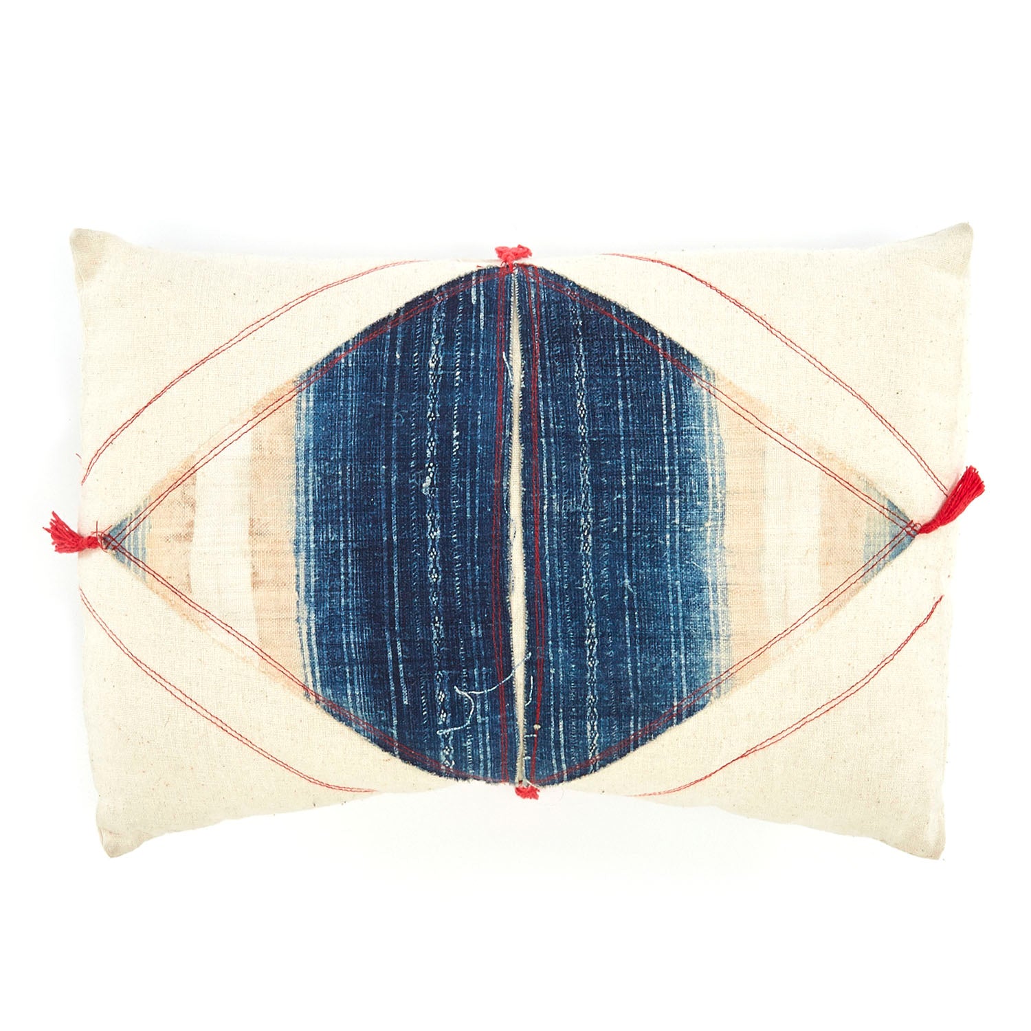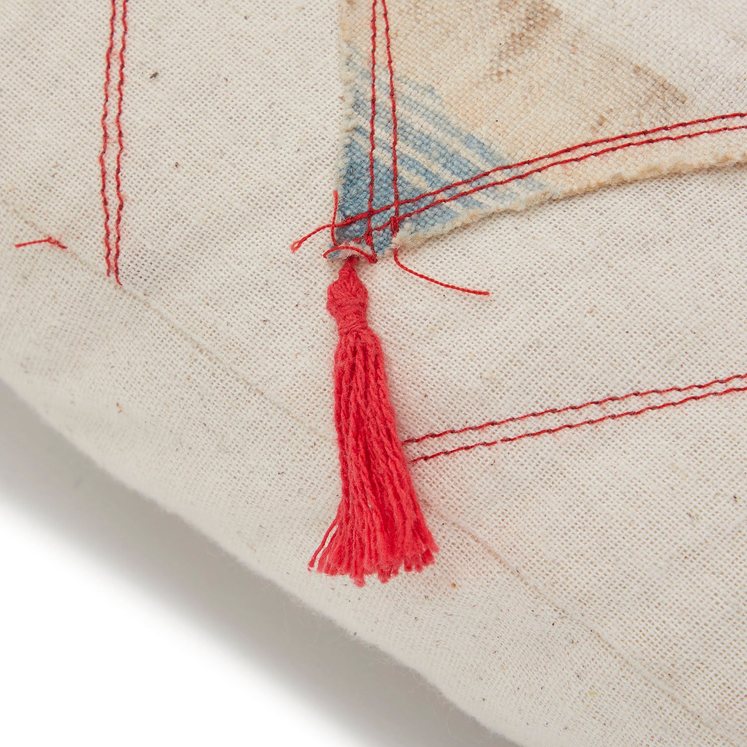 Details: White lumbar pillow with blue square and red tassels Dimensions: 16" H x 16" W x 5" D Quantity : 1
