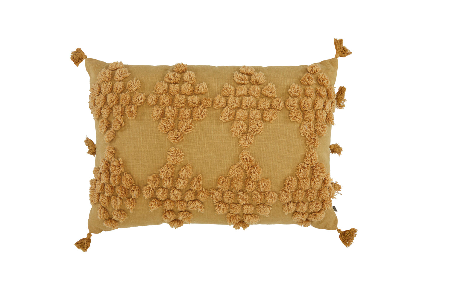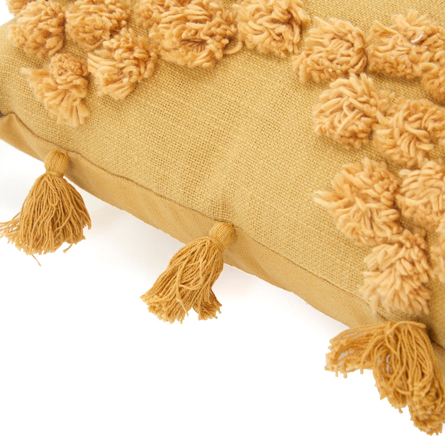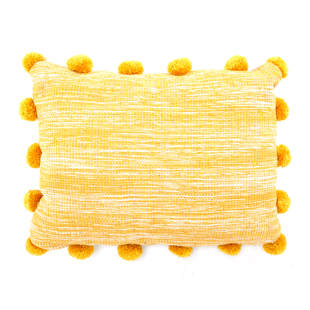 Details: Golden yellow lumbar pillow with pompom diamond design and tassels Dimensions: 13.5" H x 19" W x 5" D Quantity: 1