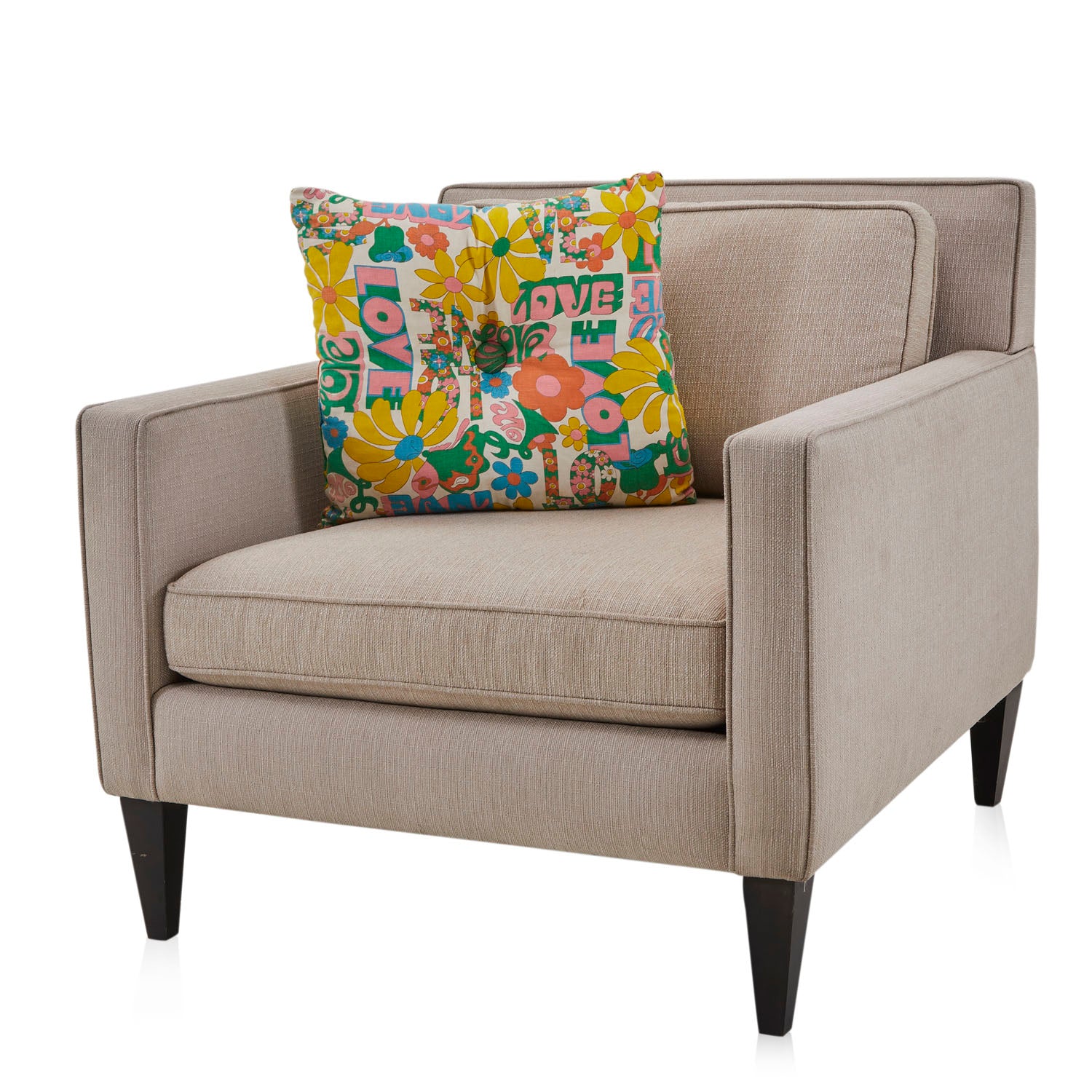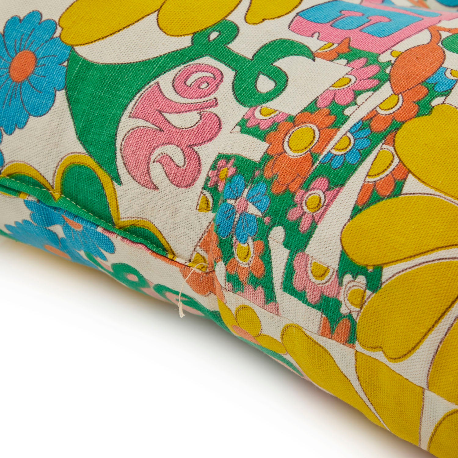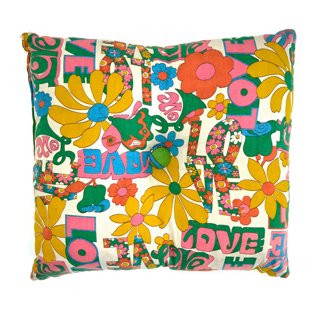 Details: Multicolor pillow with psychedelic flowers and words print, one button in center Dimensions: 17" H x 17" W x 5" D Quantity: 1