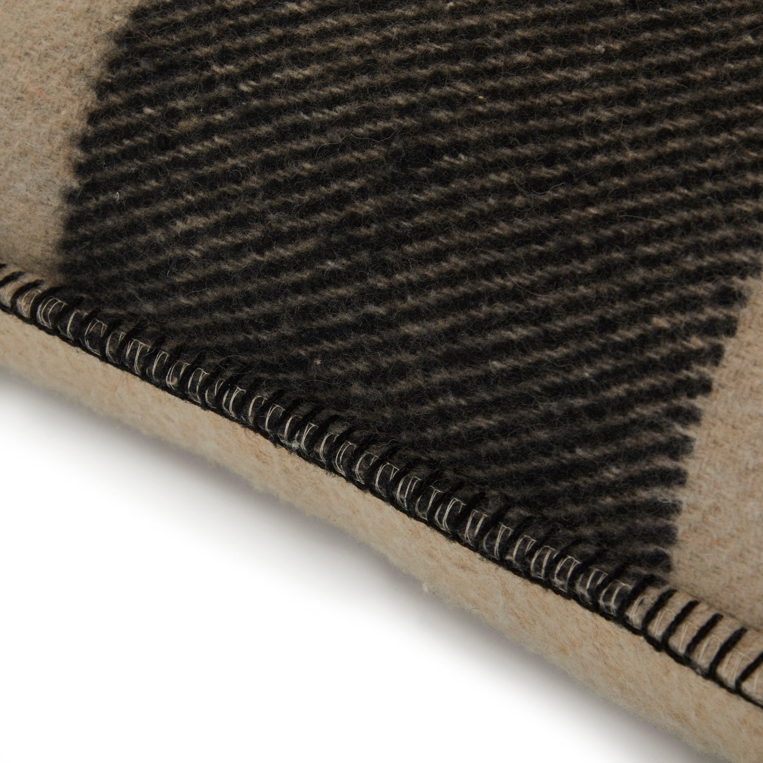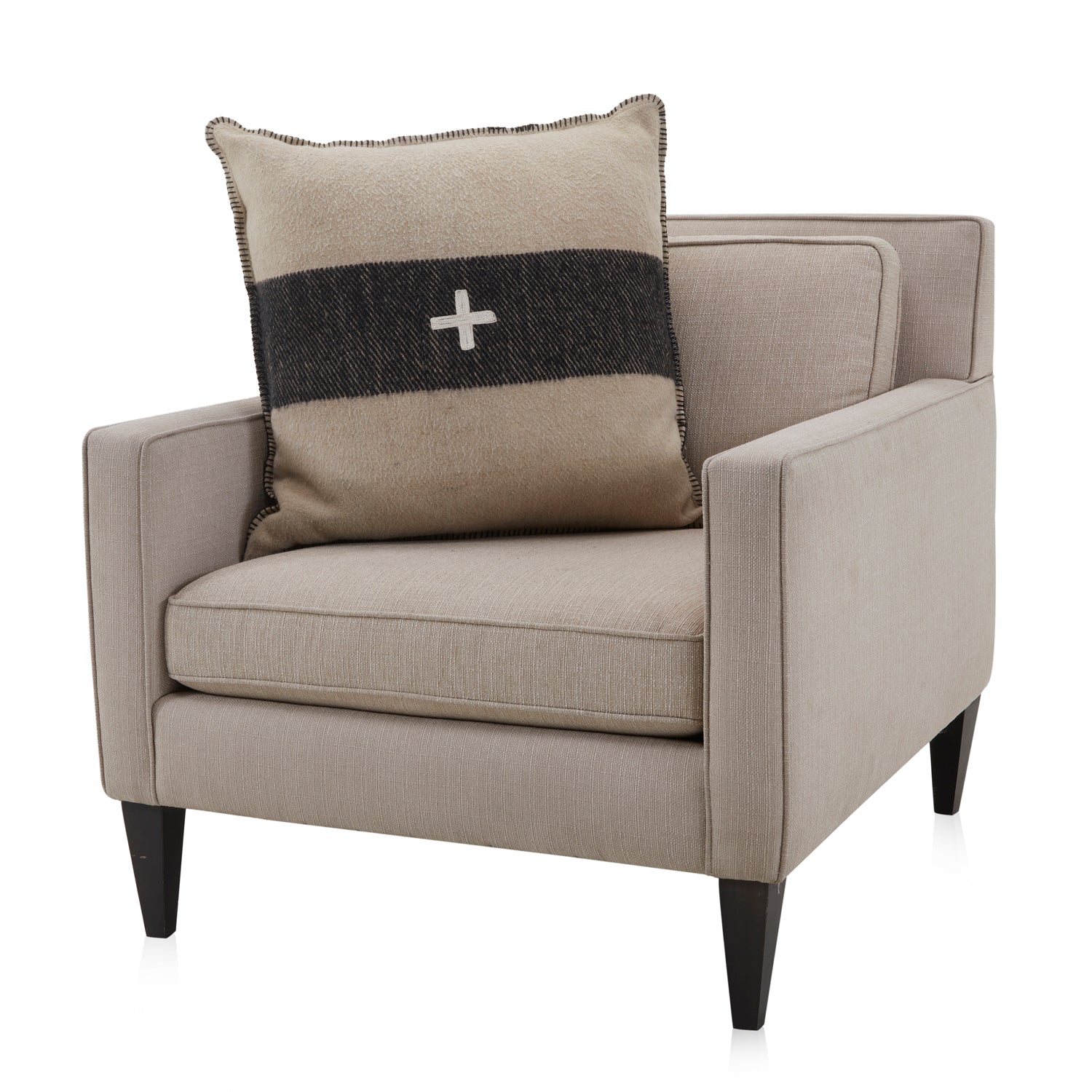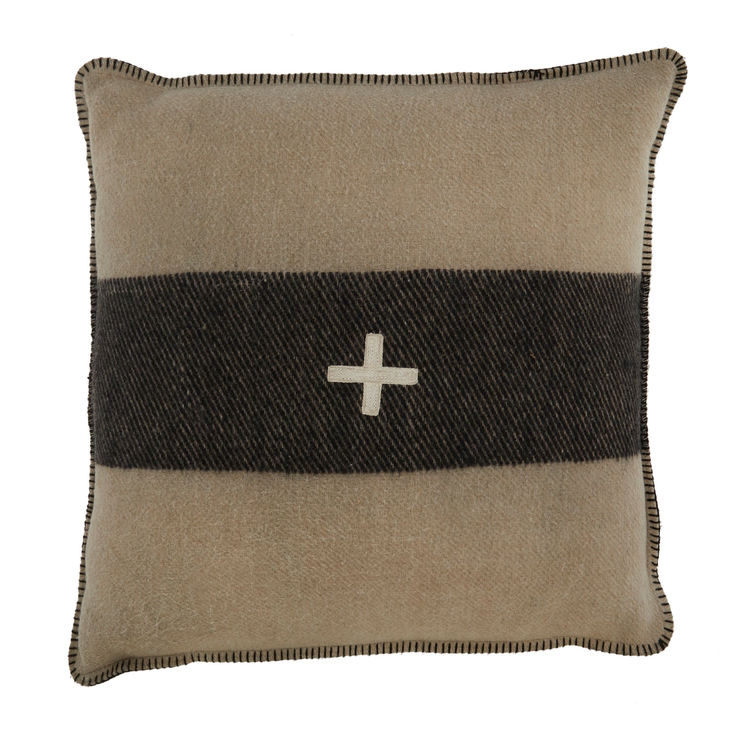 Details: Tan pillow with wide black stripe, stitched white cross in middle